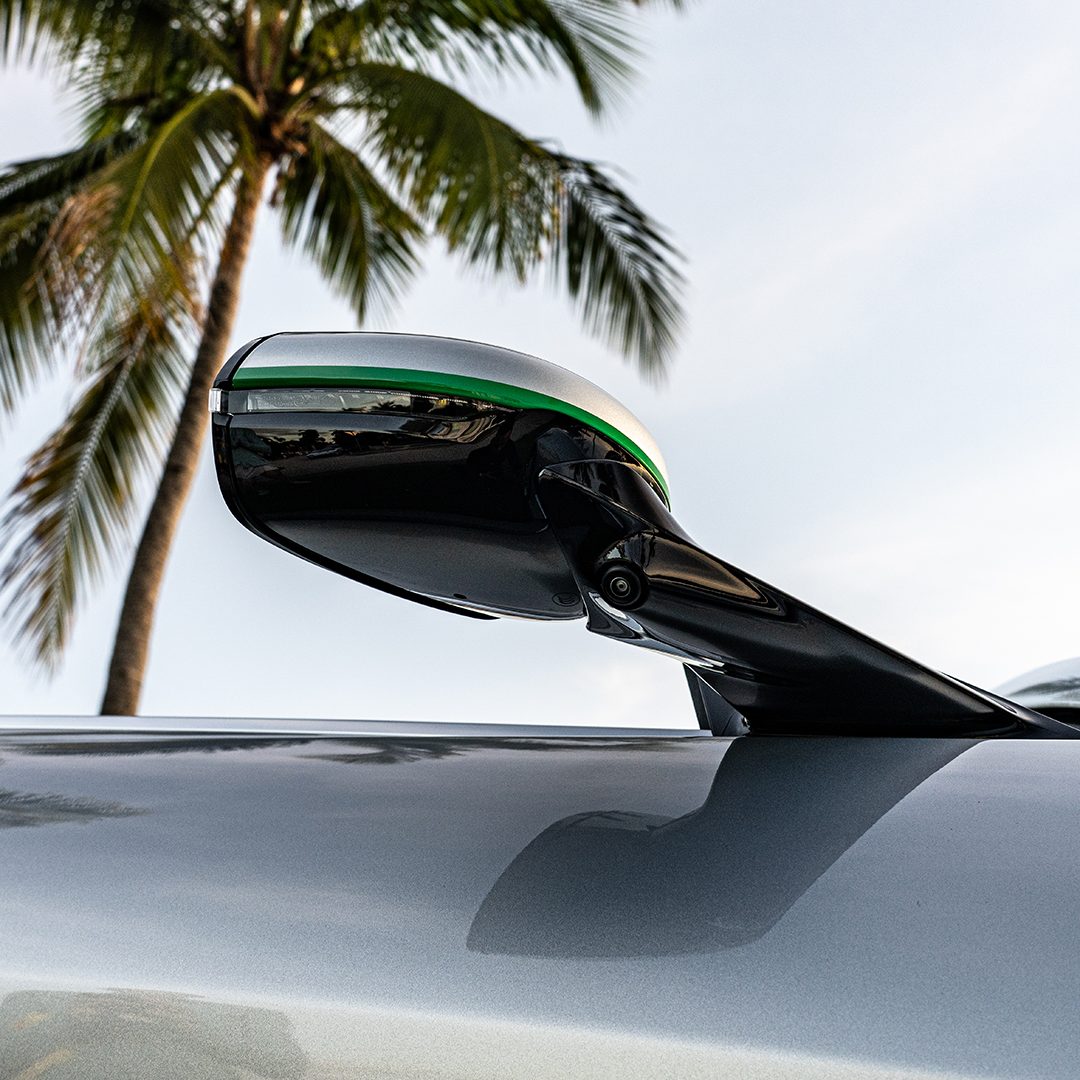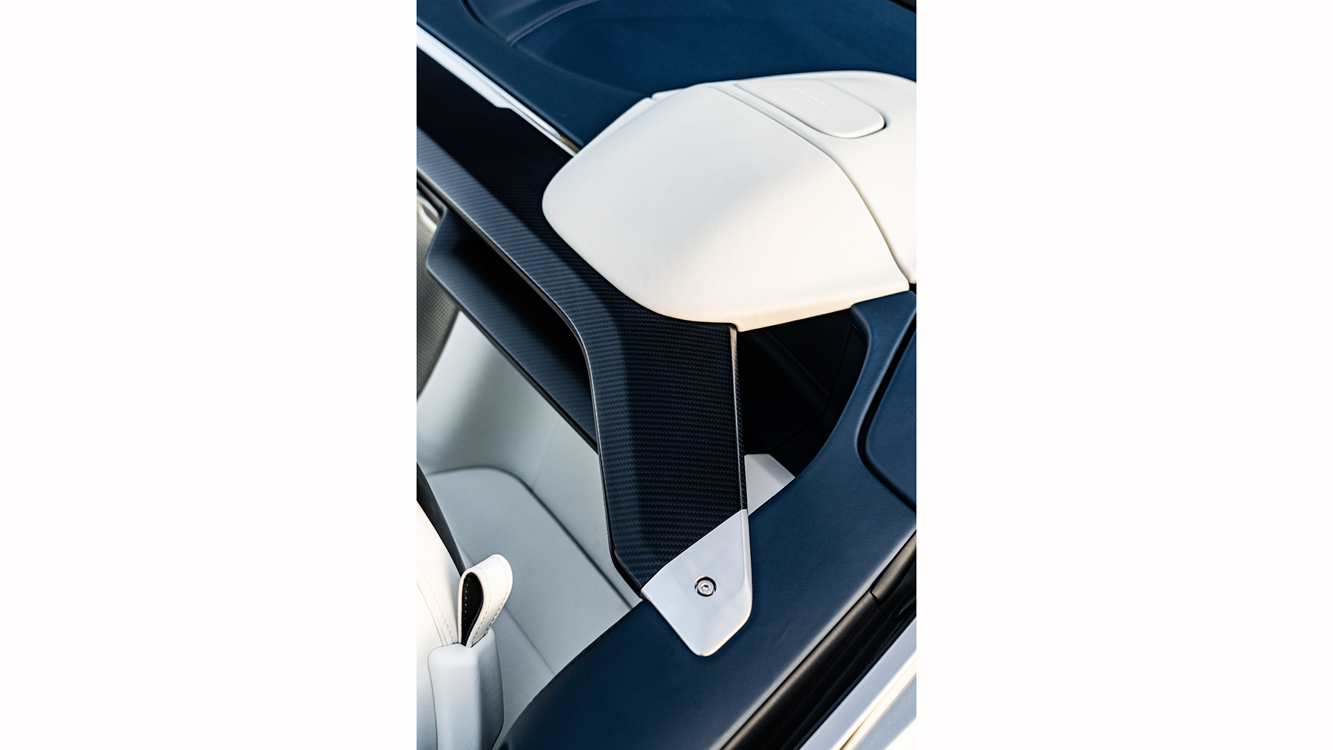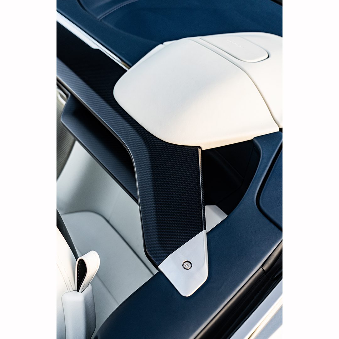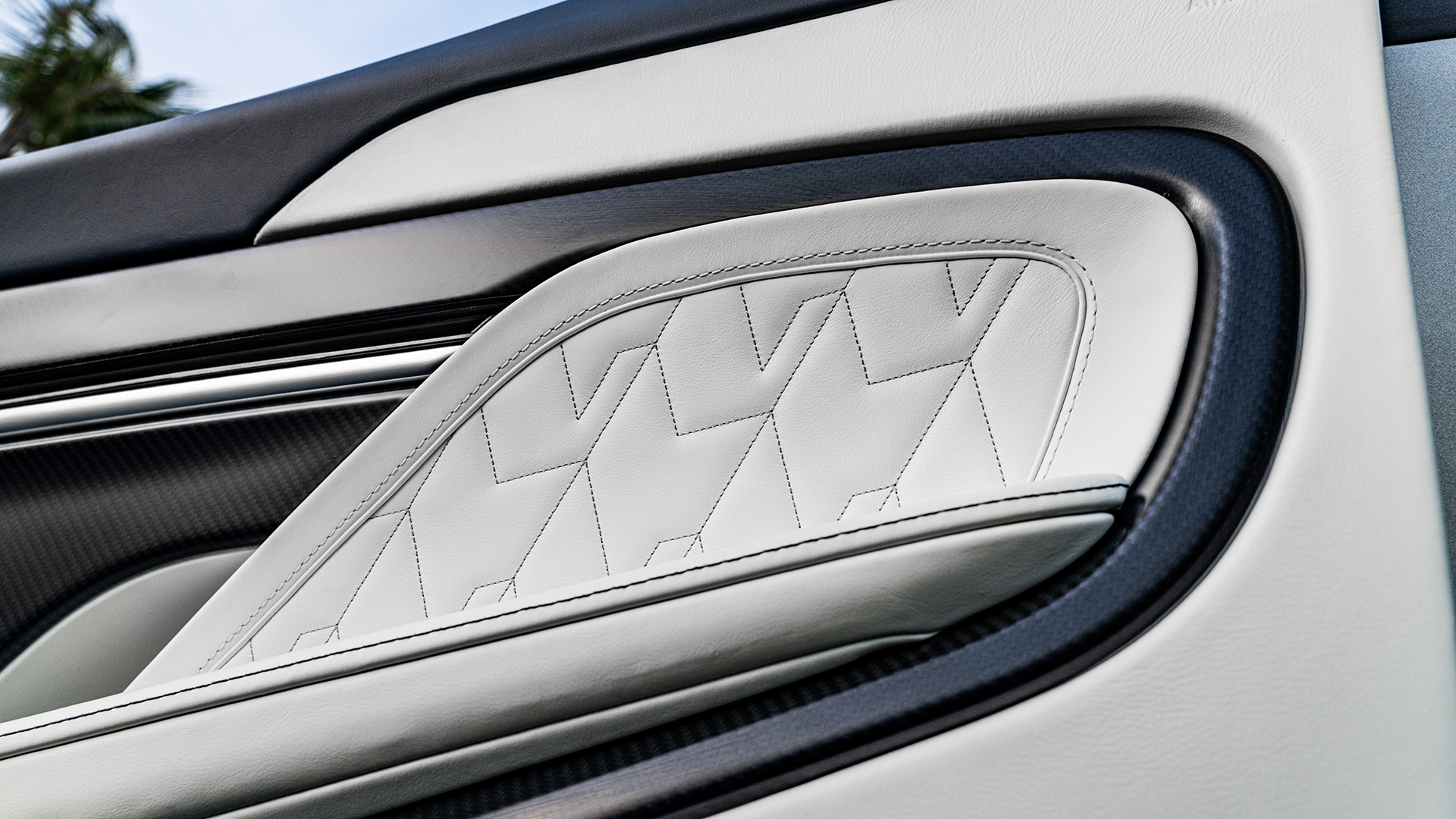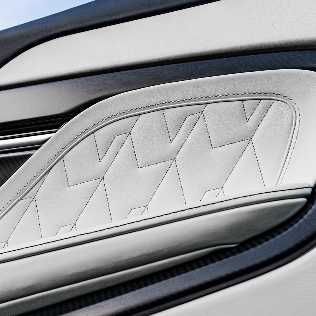 Concepita come una connessione tra terra e mare, “Above & Beyond” trae ispirazione diretta dai due futuri Turquoise Yachts di Bannenberg & Rowell, che avranno proprio gli stessi nomi. Proprio come le due imbarcazioni omaggiano il viaggio senza limiti, queste due Vanquish reinterpretano lo stile di vita nautico in ogni dettaglio della loro manifattura. Entrambe le supercar presentano esterni in Lightning Silver: una tonalità scelta per il suo delicato riflesso blu alla luce diretta del sole. Un omaggio ai riflessi metallici scintillanti degli scafi degli yacht. La parte inferiore della carrozzeria presenta degli elementi in fibra di carbonio lucida di colore blu, ‘spezzata’ da una speciale striscia Lightning Silver, che richiama le ‘strisce‘ dello scafo di uno yacht. Ulteriori richiami al mondo della nautica sono le cover degli specchietti retrovisori: lo specchietto lato guida presenta una striscia rossa, mentre quello lato passeggero è verde, in riferimento alle luci di navigazione di babordo e tribordo (come avviene anche sugli aeroplani). A impreziosire il tutto troviamo anche dei listelli laterali cromati con stemma V12 in nero lucido, le prese d’aria rifinite in Scintilla Silver e gli inserti dei parafanghi integrati come avviene sul profilo di uno yacht. Aperta la portiera si fa notare un abitacolo che rimanda agli interni delle imbarcazioni e alla vita acquatica. I pellami sono in Glacier White e presentano una trapuntatura a V che si estende sulle portiere e sul bracciolo centrale. Un motivo che rimanda ai rivestimenti su misura delle imbarcazioni di lusso. Le impunture trovano ispirazione nelle onde di prua che si formano in velocità e vanno a demarcare le superfici dei sedili, mentre le finiture in fibra di carbonio satinata e lucida, con tonalità blu, evocano i contrasti stratificati degli interni degli yacht contemporanei. Le targhette battitacco personalizzate, impreziosite dai loghi dei partner, demarcano l’unicità di ogni vettura.