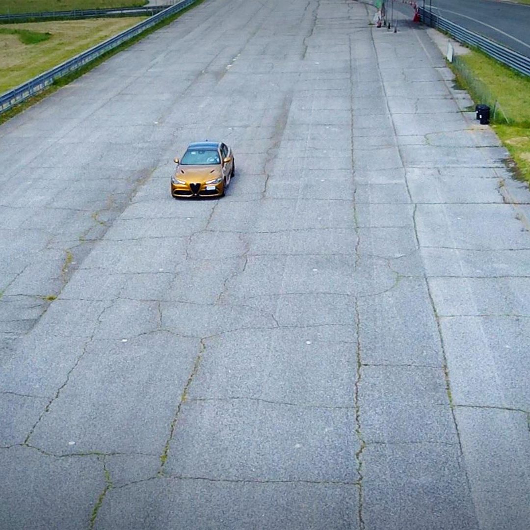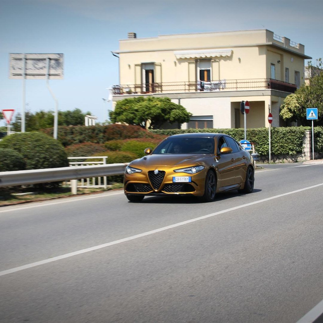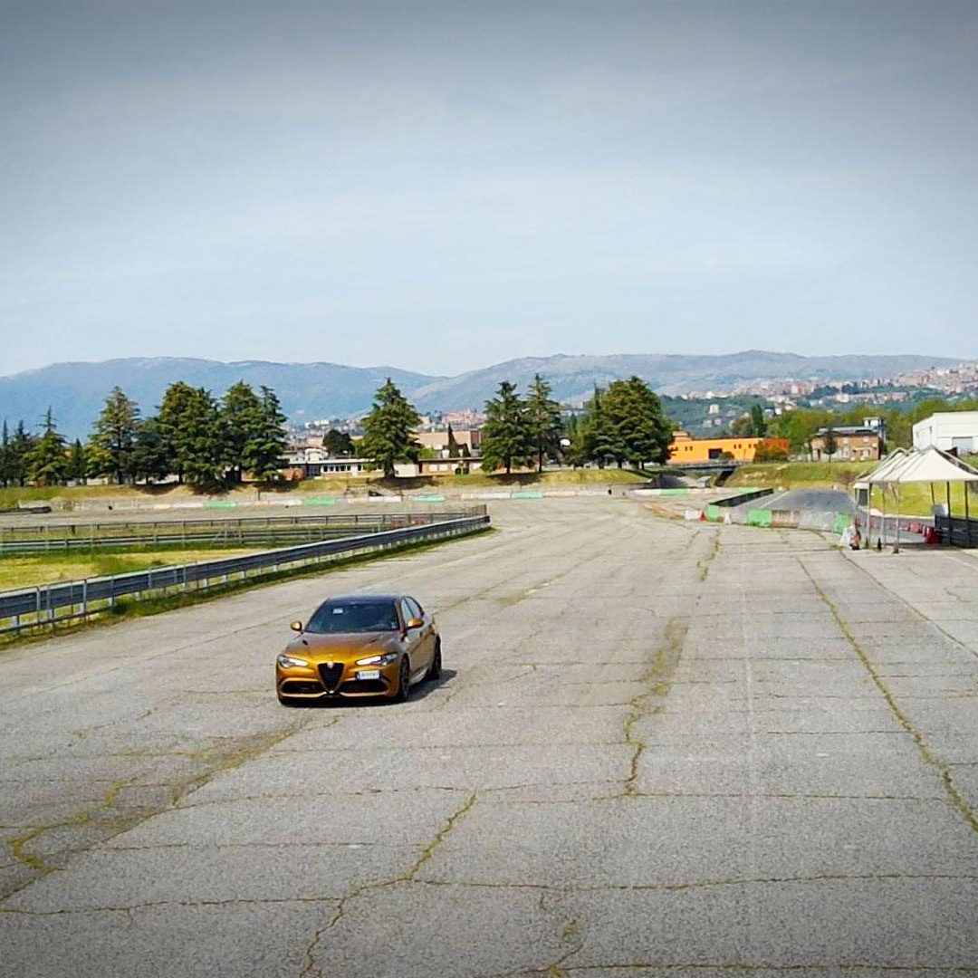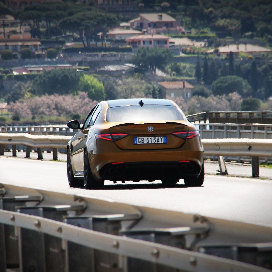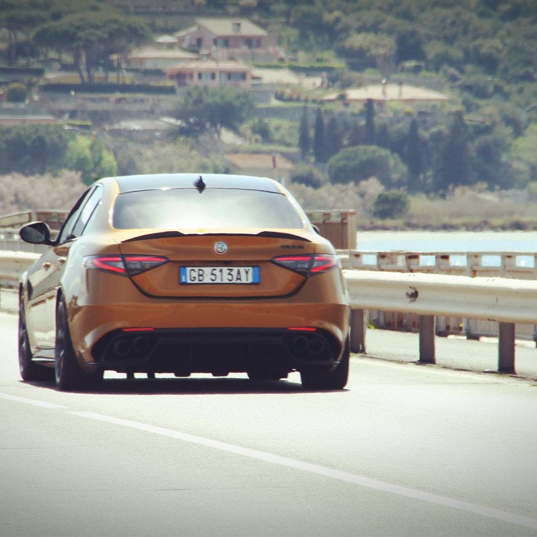Ma il protagonista assoluto dell’esperienza di guida di Alfa Romeo Giulia Quadrifoglio è in maniera indiscussa uno ed uno solamente: il motore. Si tratta di un’unità piuttosto piccola (solo 2.9 litri di cubatura), ma non per questo non esuberante. Tutt’altro. Il biturbo italiano è un mare in burrasca. E ci pensano i suoi numero a dirlo: 510 CV di potenza, 600 Nm di coppia, da 0 a 100 km/h in soli 3.9 secondi e 307 km/h di velocità massima. Valori impressionanti e che vengono trasmessi alle ruote posteriori da un cambio automatico a 8 rapporti capace di cambiare marcia in soli 150 millisecondi (in modalità Race). E che vi assicuriamo essere un vero e proprio prodigio d’ingegneria per rapidità di passaggio marcia e per fluidità d’innesto. E lo scarico Akrapovic non manca di demarcare, con tutta una serie di scoppiettii, innesti e rilasci, nonché di esaltare il timbro vocale del propulsore. Soli 1.695 kg di peso in ordine di marcia (ripartiti al 50:50 tra davanti e dietro) e uno schema sospensioni AlfaTM Link a quadrilateri sovrapposti con asse di sterzo semi-virtuale davanti e AlfaTM Link con braccio verticale dietro completano la caratterizzazione tecnica di questa vettura, che monta cerchi da 19” gommati 245/35 all’anteriore e 285/30 al posteriore, e che, nella versione da noi provata, sfoggiano alle loro spalle un impianto frenante carboceramico che davvero lascia a bocca aperta per potenza ed efficacia. Lunga 4.643 mm, larga 1.860 mm e alta 1.450 mm, nonché con un passo di 2.820 mm, Giulia Quadrifoglio (che dispone di Torque Vectoring per ripartire la coppia tra le ruote dell’assale posteriore) non sorprende solo sotto il profilo tecnico, ma anche sotto quello tecnologico. Il sistema infotainment si relaziona con gli occupanti tramite uno schermo touch da 8.8” e mette a disposizione praticamente ogni informazione e servizio, compresi Apple Car Play e Android Auto. E, ciliegina sulla torta, una quantità esagerata di dispositivi ADAS, tra cui: Lane keeping Assist, Active Blind Spot Assist, Traffic Jam Assist e Highway Assist, Intelligent Speed Control, Traffic Sign Recognition, Driver Attention Assist. Insomma: di tutto e di più.