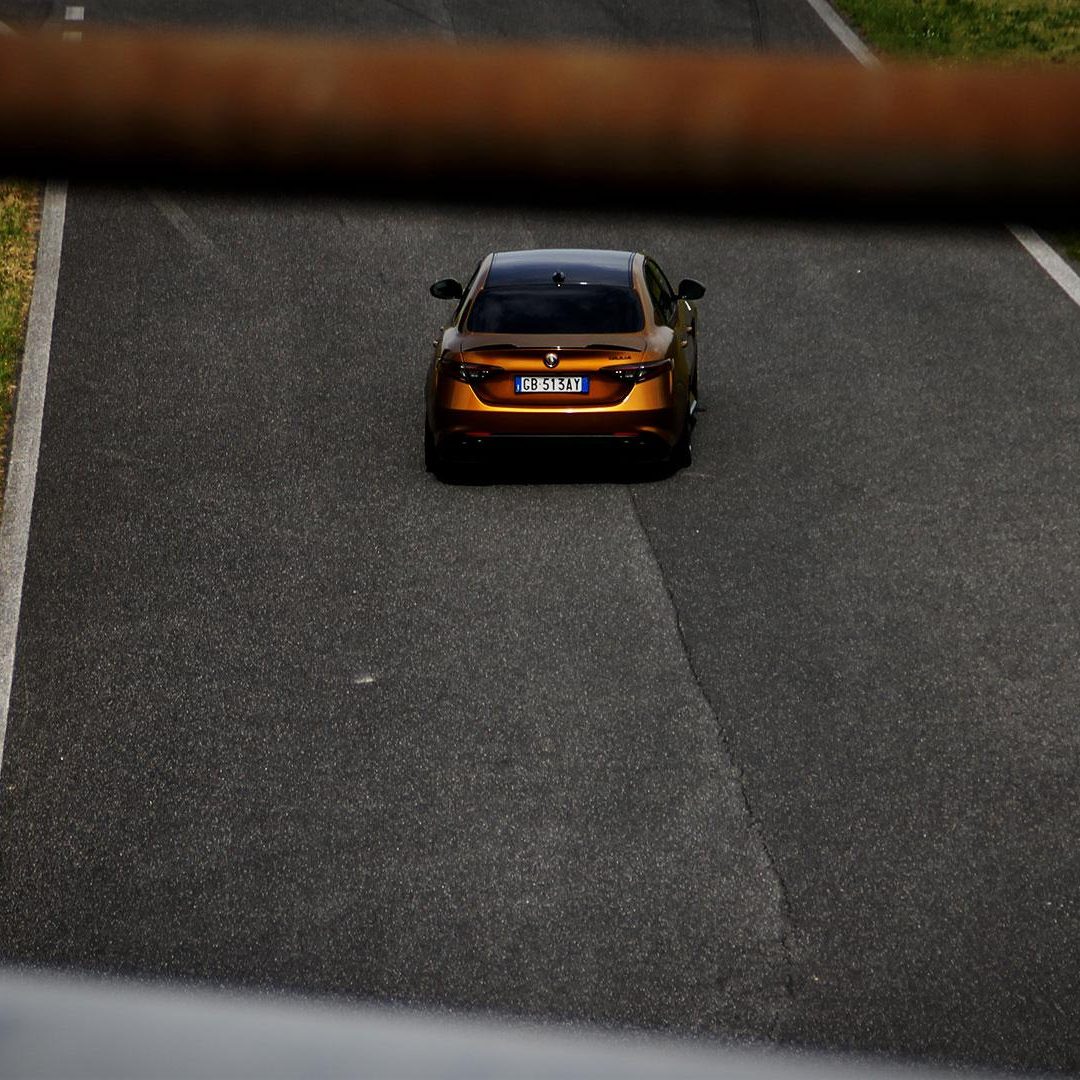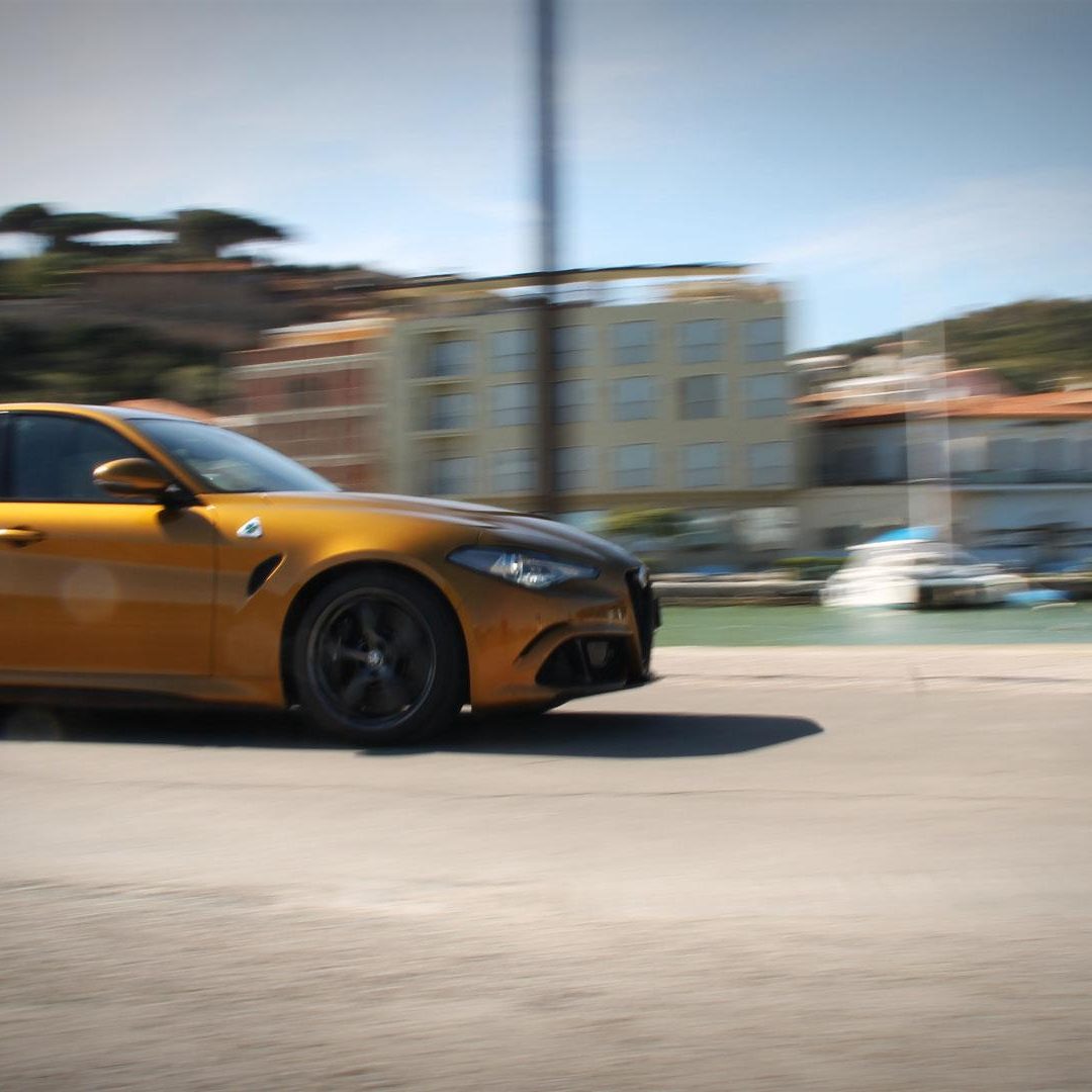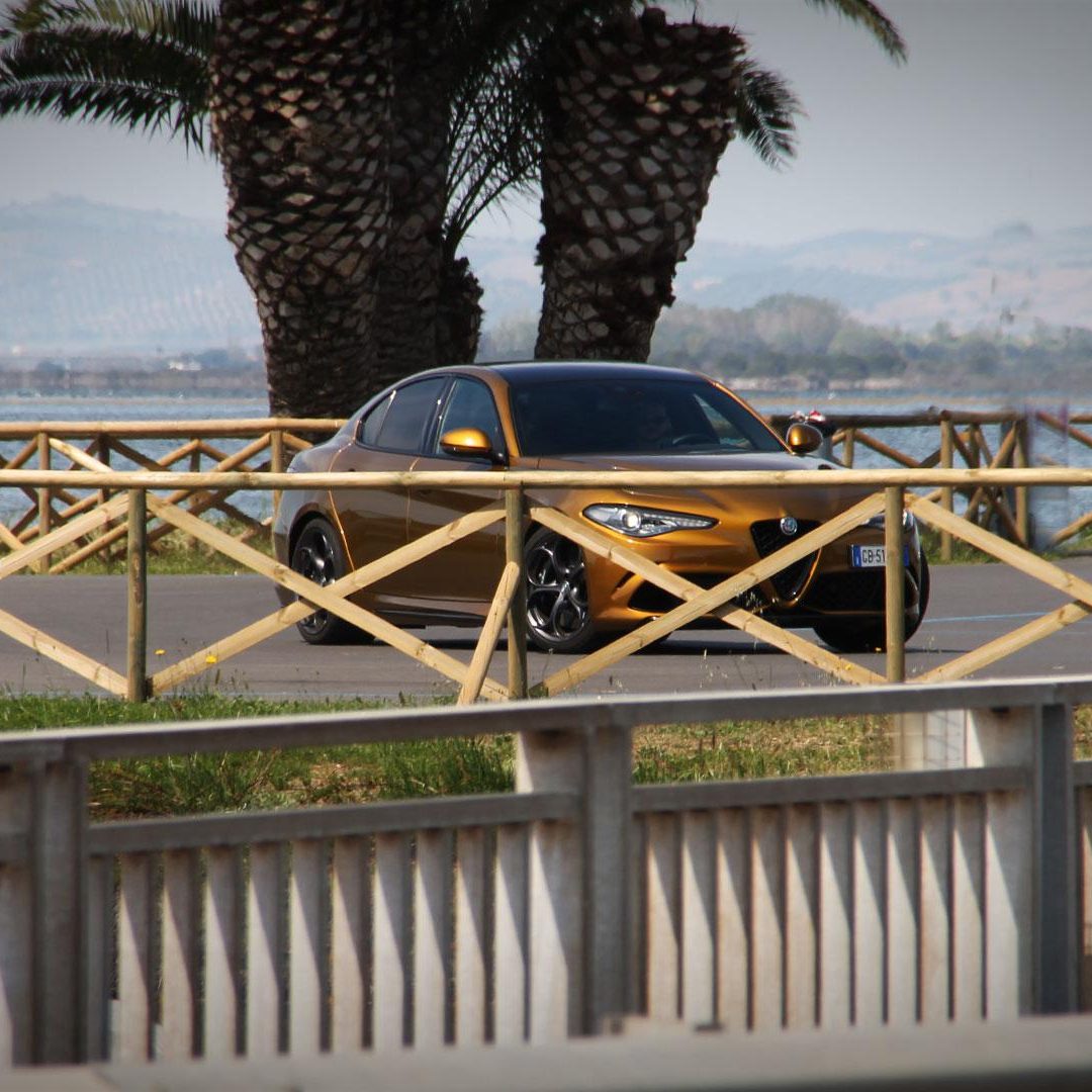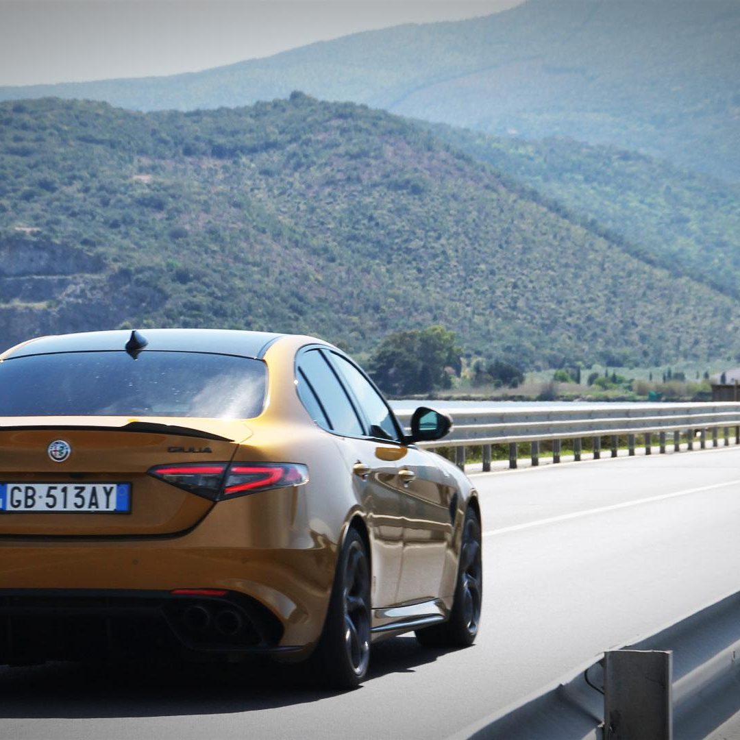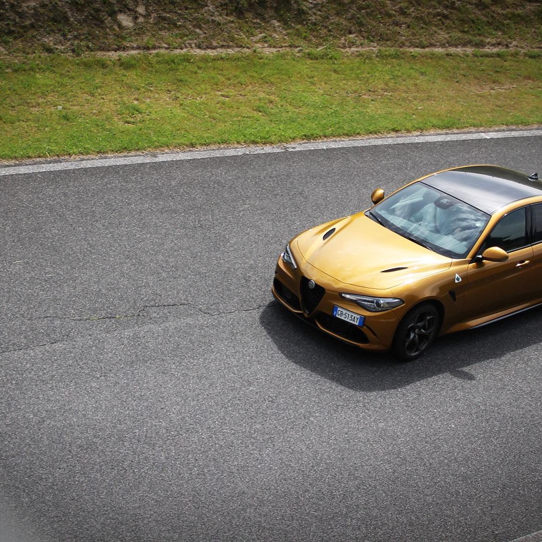 Ma il protagonista assoluto dell’esperienza di guida di Alfa Romeo Giulia Quadrifoglio è in maniera indiscussa uno ed uno solamente: il motore. Si tratta di un’unità piuttosto piccola (solo 2.9 litri di cubatura), ma non per questo non esuberante. Tutt’altro. Il biturbo italiano è un mare in burrasca. E ci pensano i suoi numero a dirlo: 510 CV di potenza, 600 Nm di coppia, da 0 a 100 km/h in soli 3.9 secondi e 307 km/h di velocità massima. Valori impressionanti e che vengono trasmessi alle ruote posteriori da un cambio automatico a 8 rapporti capace di cambiare marcia in soli 150 millisecondi (in modalità Race). E che vi assicuriamo essere un vero e proprio prodigio d’ingegneria per rapidità di passaggio marcia e per fluidità d’innesto. E lo scarico Akrapovic non manca di demarcare, con tutta una serie di scoppiettii, innesti e rilasci, nonché di esaltare il timbro vocale del propulsore. Soli 1.695 kg di peso in ordine di marcia (ripartiti al 50:50 tra davanti e dietro) e uno schema sospensioni AlfaTM Link a quadrilateri sovrapposti con asse di sterzo semi-virtuale davanti e AlfaTM Link con braccio verticale dietro completano la caratterizzazione tecnica di questa vettura, che monta cerchi da 19” gommati 245/35 all’anteriore e 285/30 al posteriore, e che, nella versione da noi provata, sfoggiano alle loro spalle un impianto frenante carboceramico che davvero lascia a bocca aperta per potenza ed efficacia. Lunga 4.643 mm, larga 1.860 mm e alta 1.450 mm, nonché con un passo di 2.820 mm, Giulia Quadrifoglio (che dispone di Torque Vectoring per ripartire la coppia tra le ruote dell’assale posteriore) non sorprende solo sotto il profilo tecnico, ma anche sotto quello tecnologico. Il sistema infotainment si relaziona con gli occupanti tramite uno schermo touch da 8.8” e mette a disposizione praticamente ogni informazione e servizio, compresi Apple Car Play e Android Auto. E, ciliegina sulla torta, una quantità esagerata di dispositivi ADAS, tra cui: Lane keeping Assist, Active Blind Spot Assist, Traffic Jam Assist e Highway Assist, Intelligent Speed Control, Traffic Sign Recognition, Driver Attention Assist. Insomma: di tutto e di più.