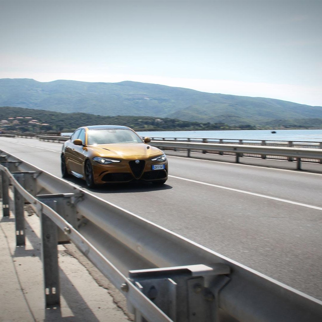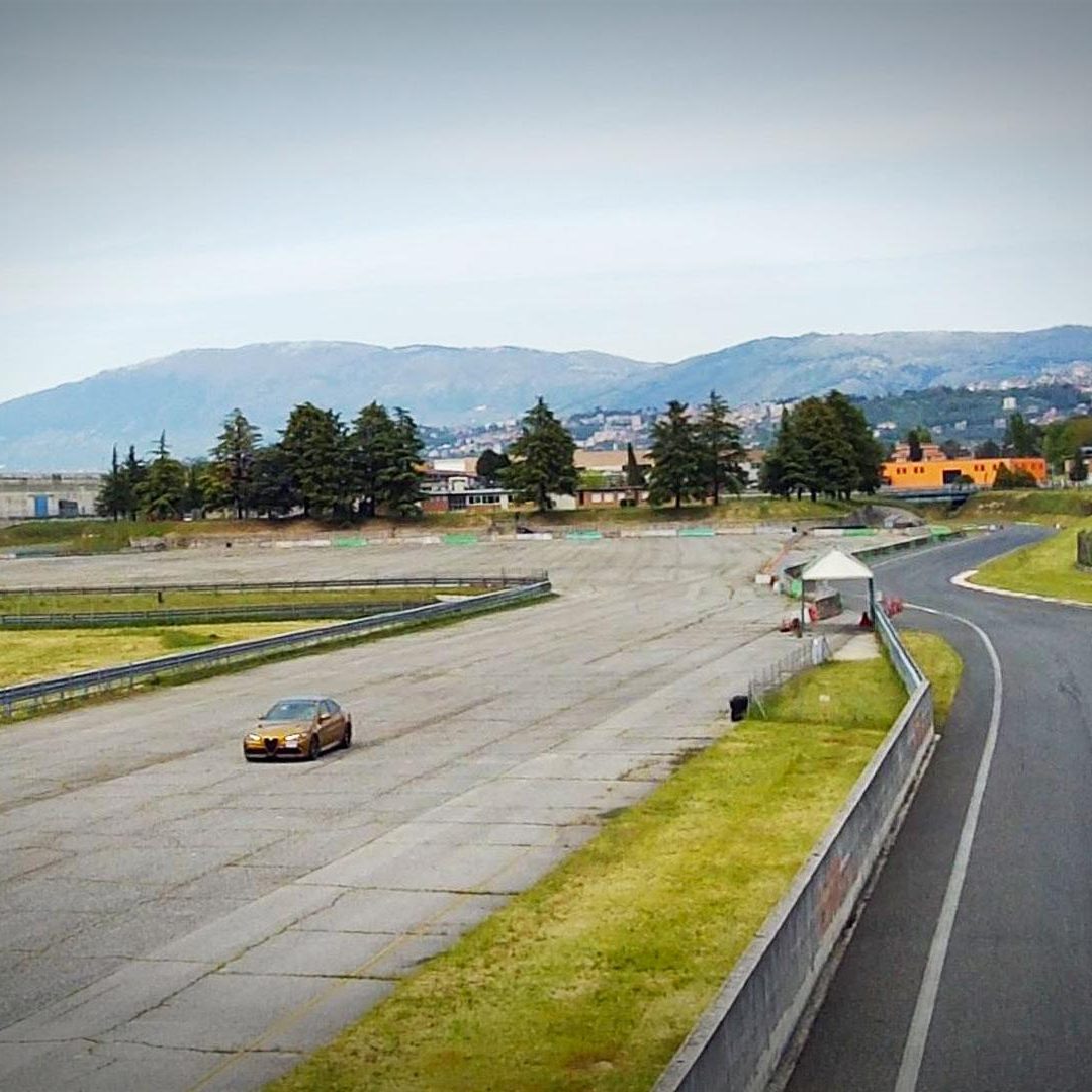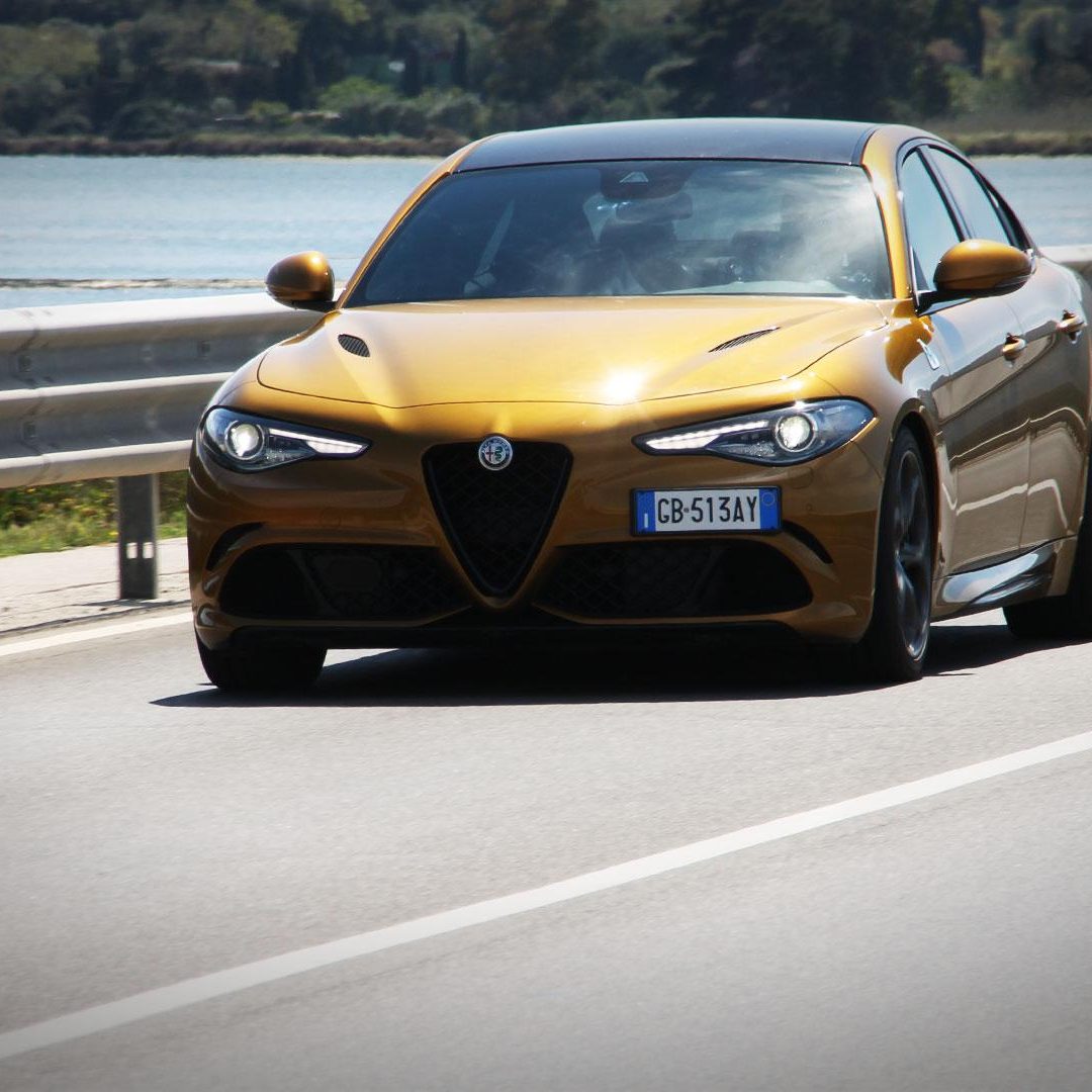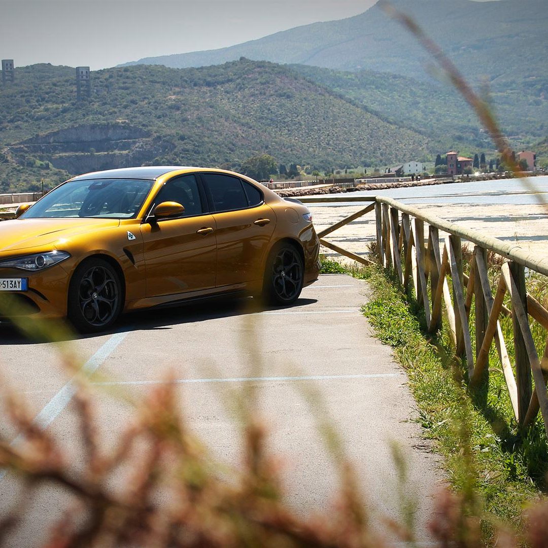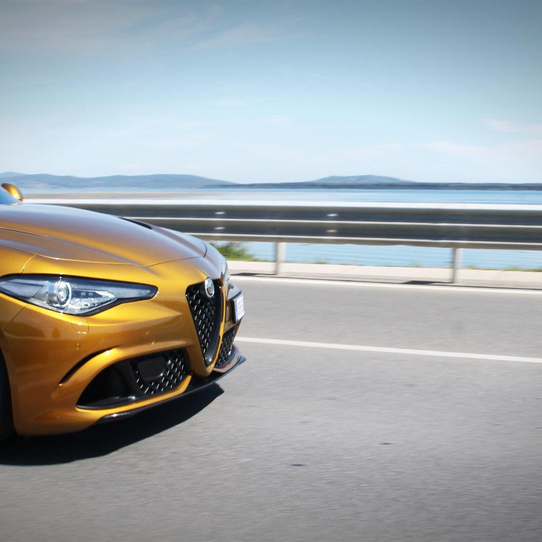 Ma il protagonista assoluto dell’esperienza di guida di Alfa Romeo Giulia Quadrifoglio è in maniera indiscussa uno ed uno solamente: il motore. Si tratta di un’unità piuttosto piccola (solo 2.9 litri di cubatura), ma non per questo non esuberante. Tutt’altro. Il biturbo italiano è un mare in burrasca. E ci pensano i suoi numero a dirlo: 510 CV di potenza, 600 Nm di coppia, da 0 a 100 km/h in soli 3.9 secondi e 307 km/h di velocità massima. Valori impressionanti e che vengono trasmessi alle ruote posteriori da un cambio automatico a 8 rapporti capace di cambiare marcia in soli 150 millisecondi (in modalità Race). E che vi assicuriamo essere un vero e proprio prodigio d’ingegneria per rapidità di passaggio marcia e per fluidità d’innesto. E lo scarico Akrapovic non manca di demarcare, con tutta una serie di scoppiettii, innesti e rilasci, nonché di esaltare il timbro vocale del propulsore. Soli 1.695 kg di peso in ordine di marcia (ripartiti al 50:50 tra davanti e dietro) e uno schema sospensioni AlfaTM Link a quadrilateri sovrapposti con asse di sterzo semi-virtuale davanti e AlfaTM Link con braccio verticale dietro completano la caratterizzazione tecnica di questa vettura, che monta cerchi da 19” gommati 245/35 all’anteriore e 285/30 al posteriore, e che, nella versione da noi provata, sfoggiano alle loro spalle un impianto frenante carboceramico che davvero lascia a bocca aperta per potenza ed efficacia. Lunga 4.643 mm, larga 1.860 mm e alta 1.450 mm, nonché con un passo di 2.820 mm, Giulia Quadrifoglio (che dispone di Torque Vectoring per ripartire la coppia tra le ruote dell’assale posteriore) non sorprende solo sotto il profilo tecnico, ma anche sotto quello tecnologico. Il sistema infotainment si relaziona con gli occupanti tramite uno schermo touch da 8.8” e mette a disposizione praticamente ogni informazione e servizio, compresi Apple Car Play e Android Auto. E, ciliegina sulla torta, una quantità esagerata di dispositivi ADAS, tra cui: Lane keeping Assist, Active Blind Spot Assist, Traffic Jam Assist e Highway Assist, Intelligent Speed Control, Traffic Sign Recognition, Driver Attention Assist. Insomma: di tutto e di più.