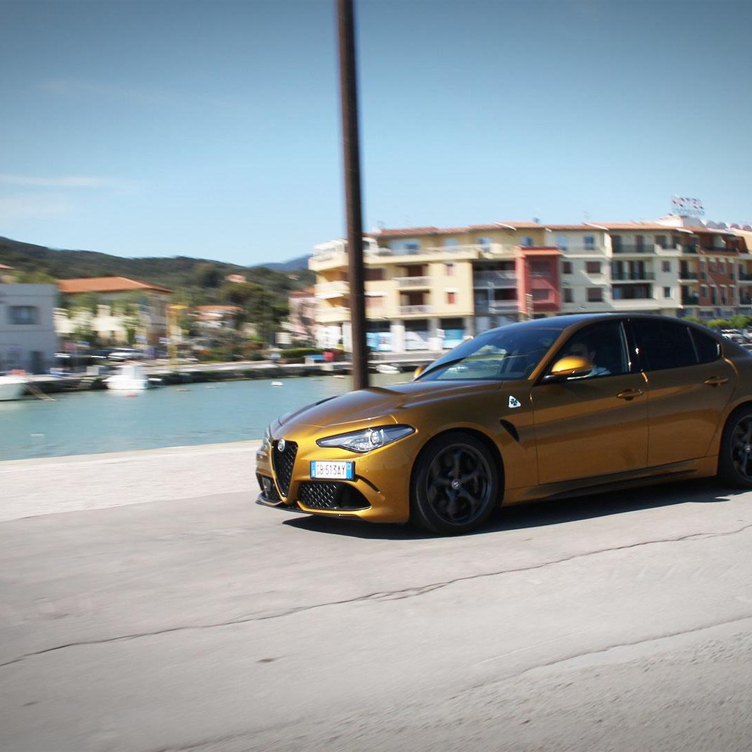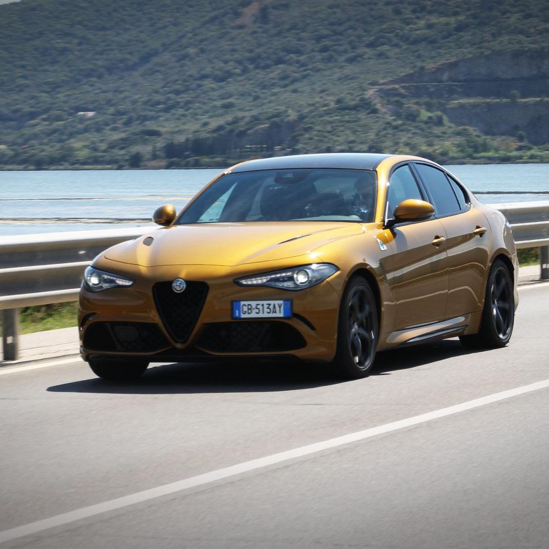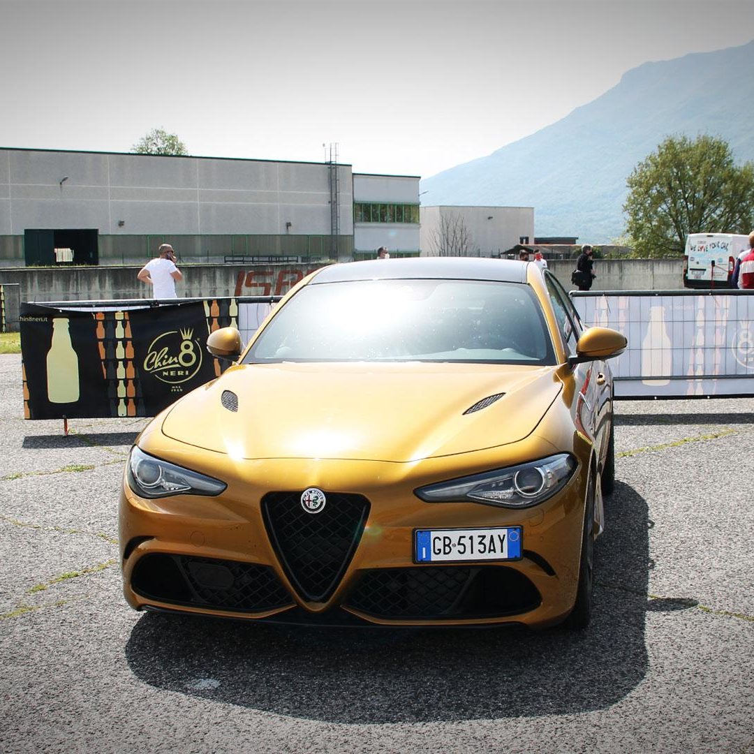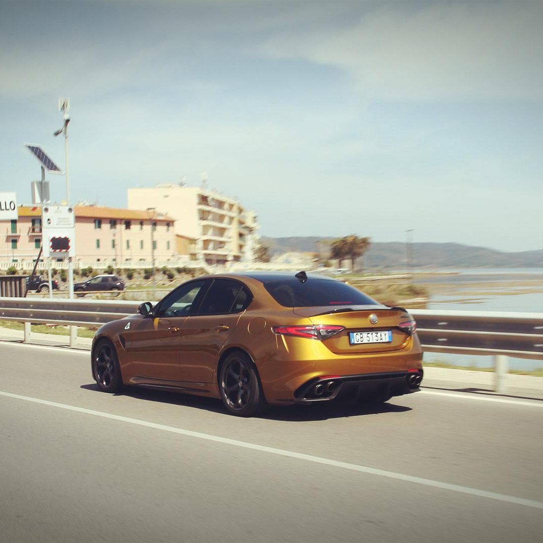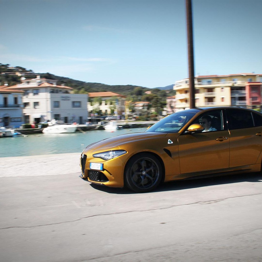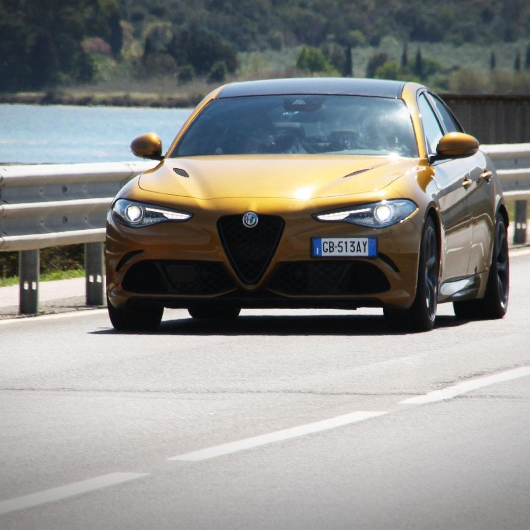 Ma il protagonista assoluto dell’esperienza di guida di Alfa Romeo Giulia Quadrifoglio è in maniera indiscussa uno ed uno solamente: il motore. Si tratta di un’unità piuttosto piccola (solo 2.9 litri di cubatura), ma non per questo non esuberante. Tutt’altro. Il biturbo italiano è un mare in burrasca. E ci pensano i suoi numero a dirlo: 510 CV di potenza, 600 Nm di coppia, da 0 a 100 km/h in soli 3.9 secondi e 307 km/h di velocità massima. Valori impressionanti e che vengono trasmessi alle ruote posteriori da un cambio automatico a 8 rapporti capace di cambiare marcia in soli 150 millisecondi (in modalità Race). E che vi assicuriamo essere un vero e proprio prodigio d’ingegneria per rapidità di passaggio marcia e per fluidità d’innesto. E lo scarico Akrapovic non manca di demarcare, con tutta una serie di scoppiettii, innesti e rilasci, nonché di esaltare il timbro vocale del propulsore. Soli 1.695 kg di peso in ordine di marcia (ripartiti al 50:50 tra davanti e dietro) e uno schema sospensioni AlfaTM Link a quadrilateri sovrapposti con asse di sterzo semi-virtuale davanti e AlfaTM Link con braccio verticale dietro completano la caratterizzazione tecnica di questa vettura, che monta cerchi da 19” gommati 245/35 all’anteriore e 285/30 al posteriore, e che, nella versione da noi provata, sfoggiano alle loro spalle un impianto frenante carboceramico che davvero lascia a bocca aperta per potenza ed efficacia. Lunga 4.643 mm, larga 1.860 mm e alta 1.450 mm, nonché con un passo di 2.820 mm, Giulia Quadrifoglio (che dispone di Torque Vectoring per ripartire la coppia tra le ruote dell’assale posteriore) non sorprende solo sotto il profilo tecnico, ma anche sotto quello tecnologico. Il sistema infotainment si relaziona con gli occupanti tramite uno schermo touch da 8.8” e mette a disposizione praticamente ogni informazione e servizio, compresi Apple Car Play e Android Auto. E, ciliegina sulla torta, una quantità esagerata di dispositivi ADAS, tra cui: Lane keeping Assist, Active Blind Spot Assist, Traffic Jam Assist e Highway Assist, Intelligent Speed Control, Traffic Sign Recognition, Driver Attention Assist. Insomma: di tutto e di più.