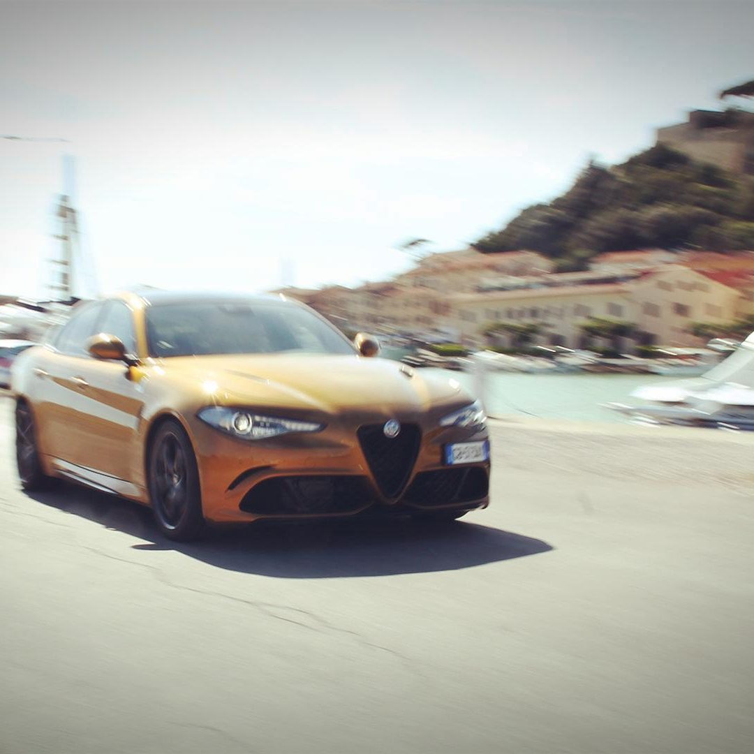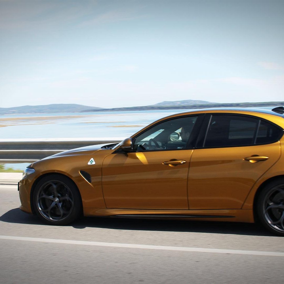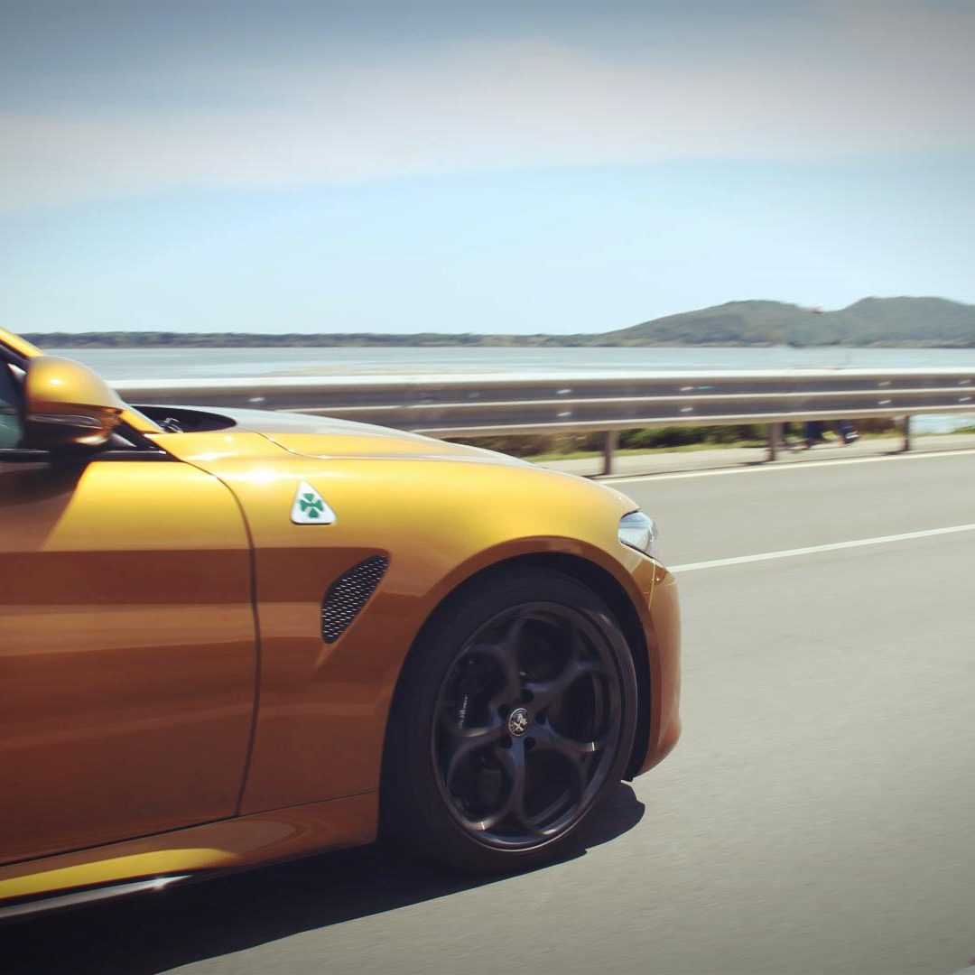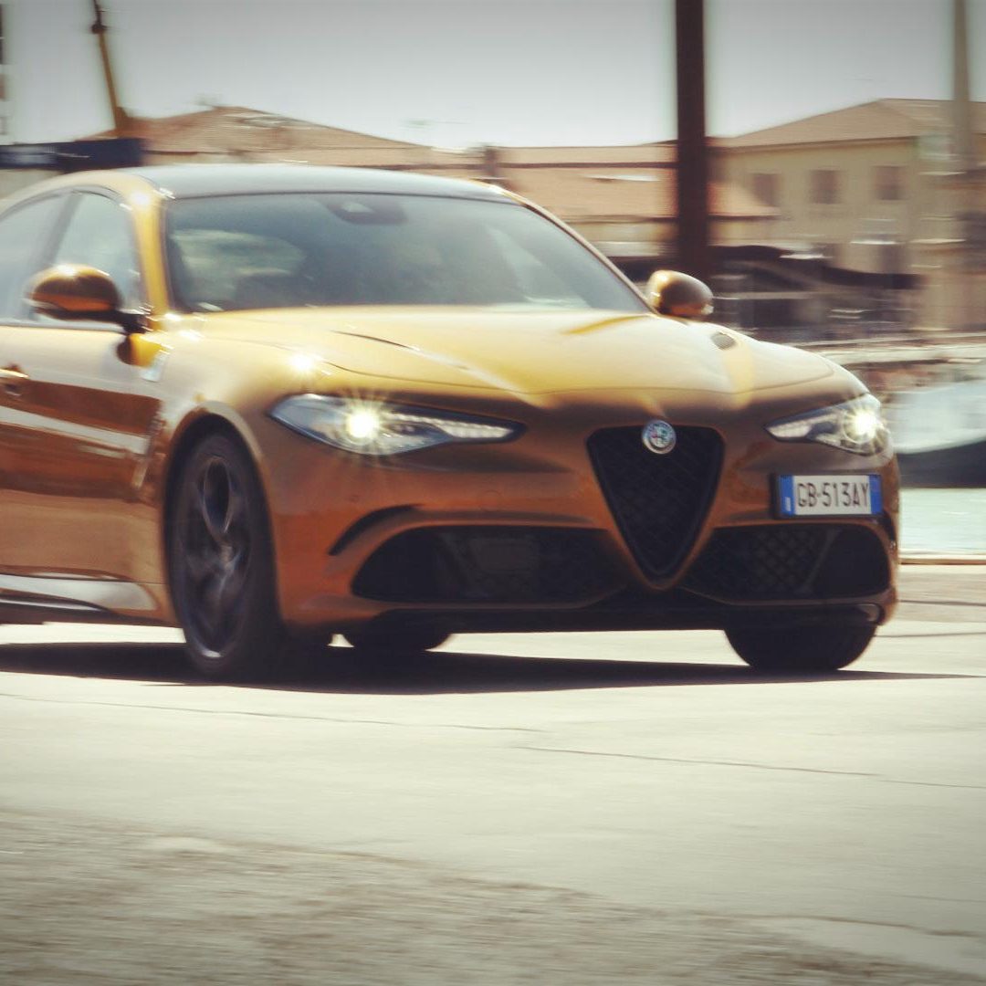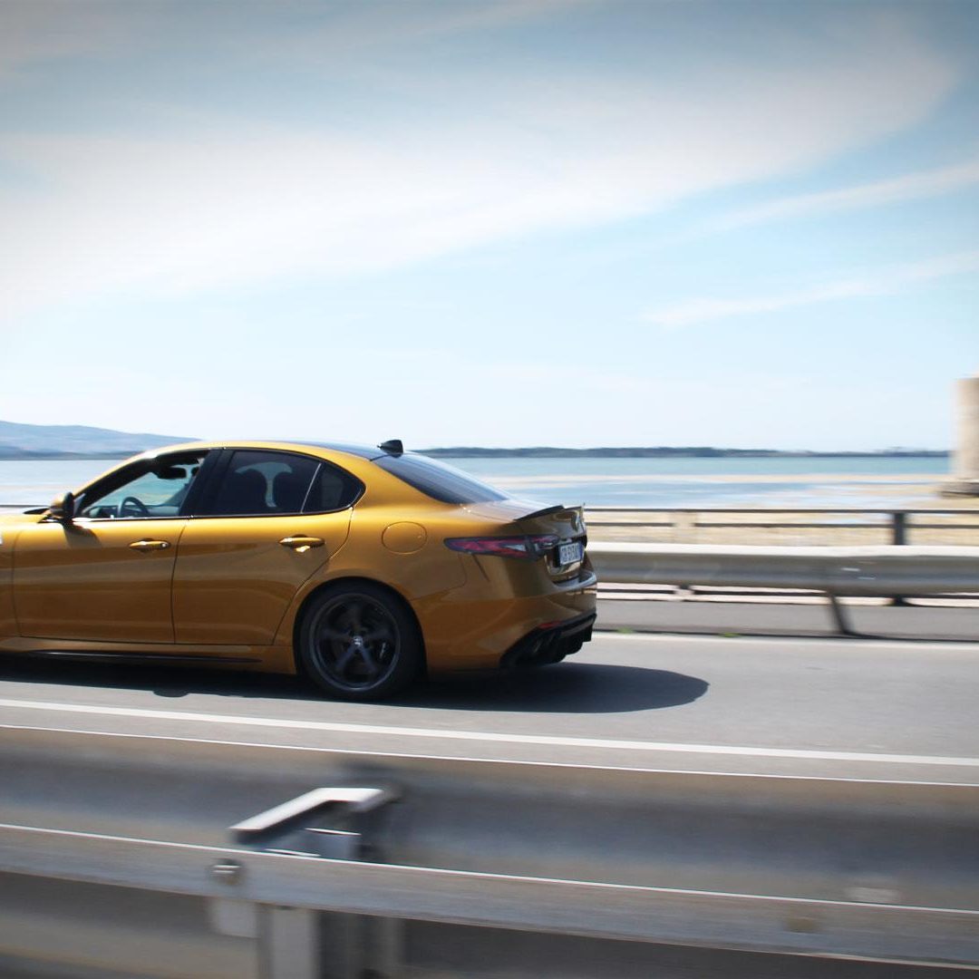 Ma il protagonista assoluto dell’esperienza di guida di Alfa Romeo Giulia Quadrifoglio è in maniera indiscussa uno ed uno solamente: il motore. Si tratta di un’unità piuttosto piccola (solo 2.9 litri di cubatura), ma non per questo non esuberante. Tutt’altro. Il biturbo italiano è un mare in burrasca. E ci pensano i suoi numero a dirlo: 510 CV di potenza, 600 Nm di coppia, da 0 a 100 km/h in soli 3.9 secondi e 307 km/h di velocità massima. Valori impressionanti e che vengono trasmessi alle ruote posteriori da un cambio automatico a 8 rapporti capace di cambiare marcia in soli 150 millisecondi (in modalità Race). E che vi assicuriamo essere un vero e proprio prodigio d’ingegneria per rapidità di passaggio marcia e per fluidità d’innesto. E lo scarico Akrapovic non manca di demarcare, con tutta una serie di scoppiettii, innesti e rilasci, nonché di esaltare il timbro vocale del propulsore. Soli 1.695 kg di peso in ordine di marcia (ripartiti al 50:50 tra davanti e dietro) e uno schema sospensioni AlfaTM Link a quadrilateri sovrapposti con asse di sterzo semi-virtuale davanti e AlfaTM Link con braccio verticale dietro completano la caratterizzazione tecnica di questa vettura, che monta cerchi da 19” gommati 245/35 all’anteriore e 285/30 al posteriore, e che, nella versione da noi provata, sfoggiano alle loro spalle un impianto frenante carboceramico che davvero lascia a bocca aperta per potenza ed efficacia. Lunga 4.643 mm, larga 1.860 mm e alta 1.450 mm, nonché con un passo di 2.820 mm, Giulia Quadrifoglio (che dispone di Torque Vectoring per ripartire la coppia tra le ruote dell’assale posteriore) non sorprende solo sotto il profilo tecnico, ma anche sotto quello tecnologico. Il sistema infotainment si relaziona con gli occupanti tramite uno schermo touch da 8.8” e mette a disposizione praticamente ogni informazione e servizio, compresi Apple Car Play e Android Auto. E, ciliegina sulla torta, una quantità esagerata di dispositivi ADAS, tra cui: Lane keeping Assist, Active Blind Spot Assist, Traffic Jam Assist e Highway Assist, Intelligent Speed Control, Traffic Sign Recognition, Driver Attention Assist. Insomma: di tutto e di più.