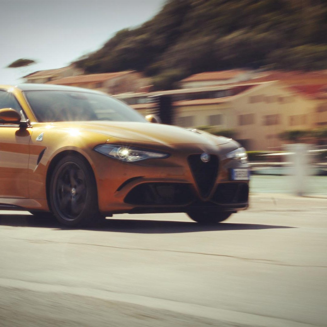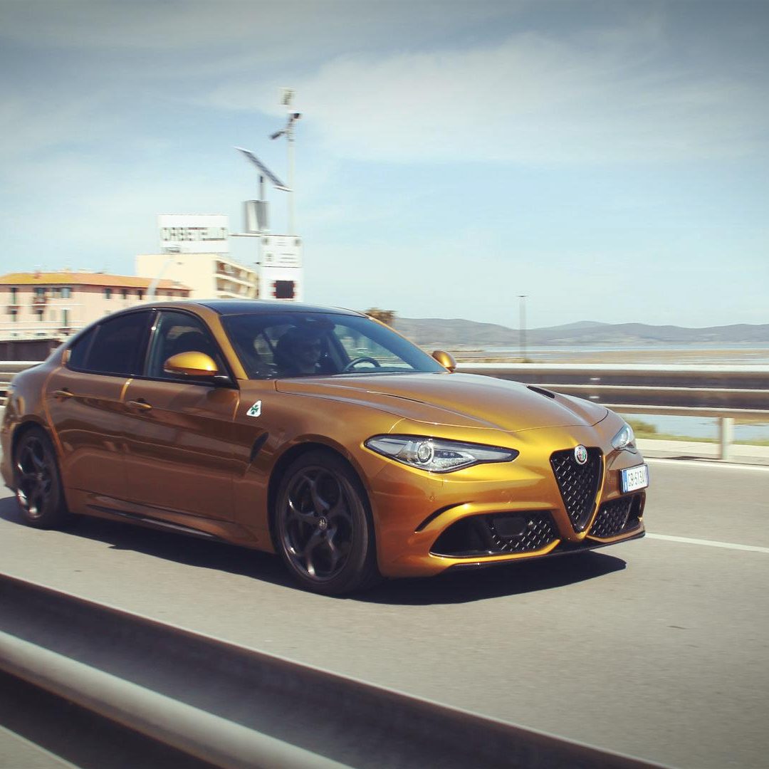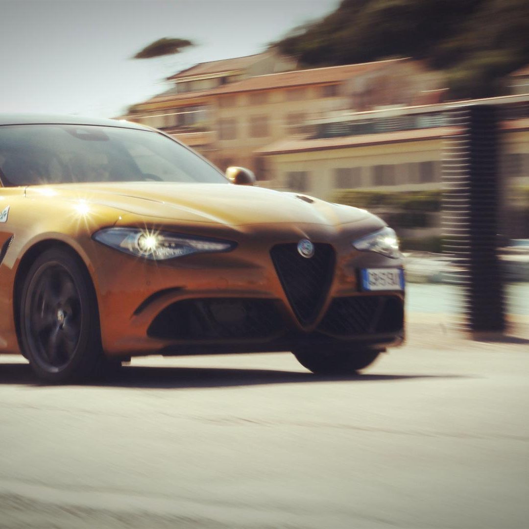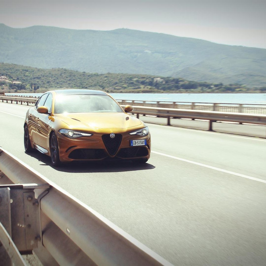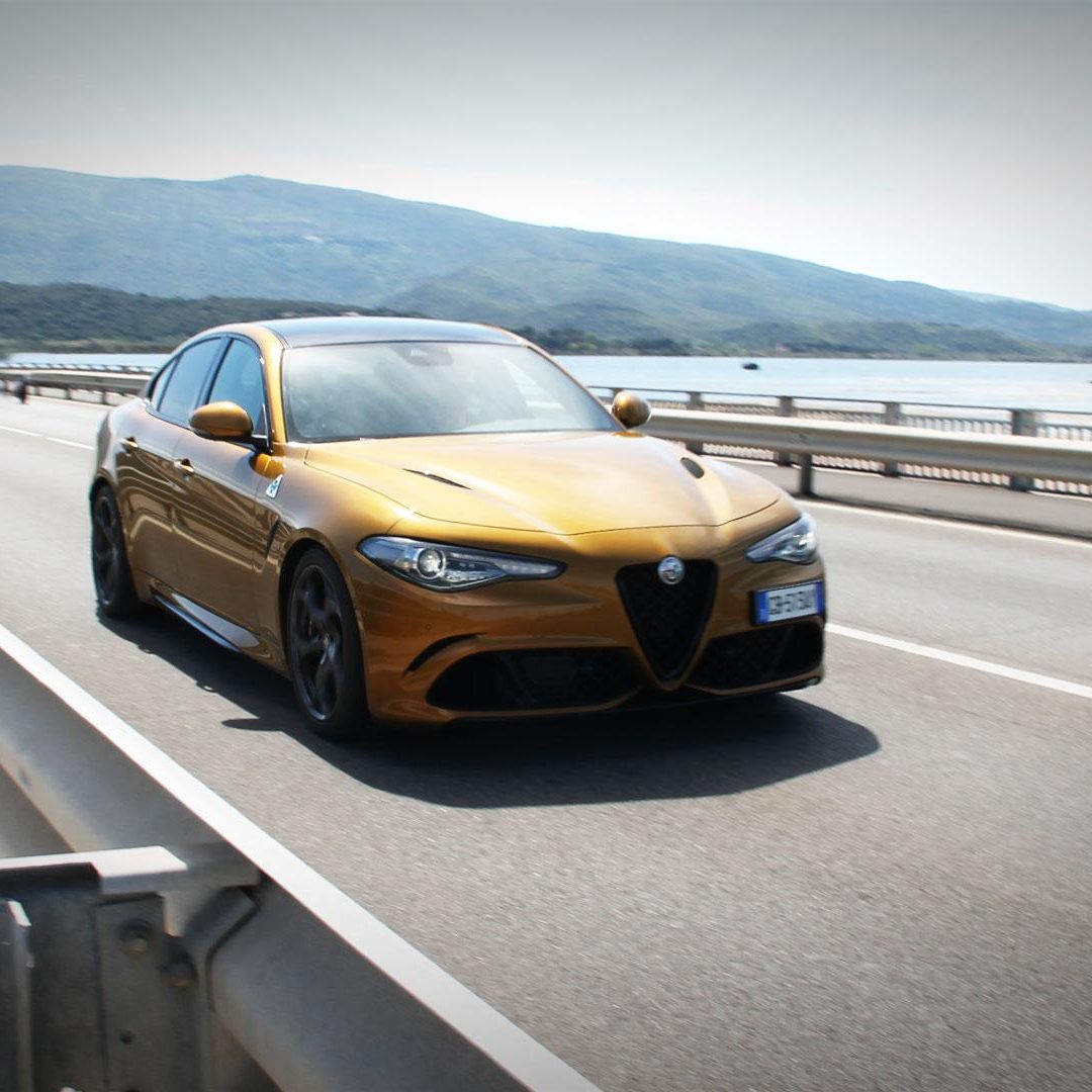 Ma il protagonista assoluto dell’esperienza di guida di Alfa Romeo Giulia Quadrifoglio è in maniera indiscussa uno ed uno solamente: il motore. Si tratta di un’unità piuttosto piccola (solo 2.9 litri di cubatura), ma non per questo non esuberante. Tutt’altro. Il biturbo italiano è un mare in burrasca. E ci pensano i suoi numero a dirlo: 510 CV di potenza, 600 Nm di coppia, da 0 a 100 km/h in soli 3.9 secondi e 307 km/h di velocità massima. Valori impressionanti e che vengono trasmessi alle ruote posteriori da un cambio automatico a 8 rapporti capace di cambiare marcia in soli 150 millisecondi (in modalità Race). E che vi assicuriamo essere un vero e proprio prodigio d’ingegneria per rapidità di passaggio marcia e per fluidità d’innesto. E lo scarico Akrapovic non manca di demarcare, con tutta una serie di scoppiettii, innesti e rilasci, nonché di esaltare il timbro vocale del propulsore. Soli 1.695 kg di peso in ordine di marcia (ripartiti al 50:50 tra davanti e dietro) e uno schema sospensioni AlfaTM Link a quadrilateri sovrapposti con asse di sterzo semi-virtuale davanti e AlfaTM Link con braccio verticale dietro completano la caratterizzazione tecnica di questa vettura, che monta cerchi da 19” gommati 245/35 all’anteriore e 285/30 al posteriore, e che, nella versione da noi provata, sfoggiano alle loro spalle un impianto frenante carboceramico che davvero lascia a bocca aperta per potenza ed efficacia. Lunga 4.643 mm, larga 1.860 mm e alta 1.450 mm, nonché con un passo di 2.820 mm, Giulia Quadrifoglio (che dispone di Torque Vectoring per ripartire la coppia tra le ruote dell’assale posteriore) non sorprende solo sotto il profilo tecnico, ma anche sotto quello tecnologico. Il sistema infotainment si relaziona con gli occupanti tramite uno schermo touch da 8.8” e mette a disposizione praticamente ogni informazione e servizio, compresi Apple Car Play e Android Auto. E, ciliegina sulla torta, una quantità esagerata di dispositivi ADAS, tra cui: Lane keeping Assist, Active Blind Spot Assist, Traffic Jam Assist e Highway Assist, Intelligent Speed Control, Traffic Sign Recognition, Driver Attention Assist. Insomma: di tutto e di più.