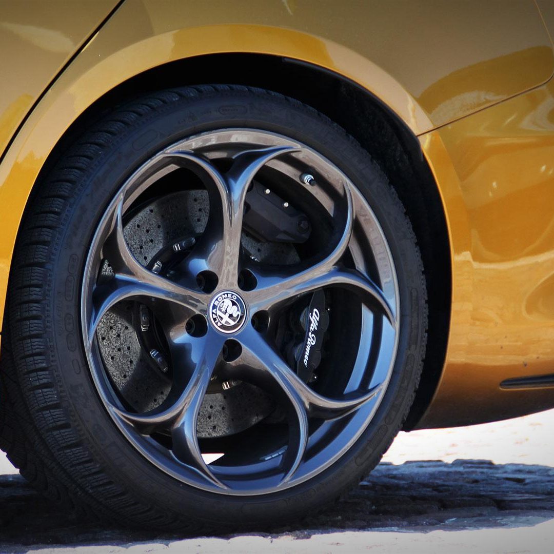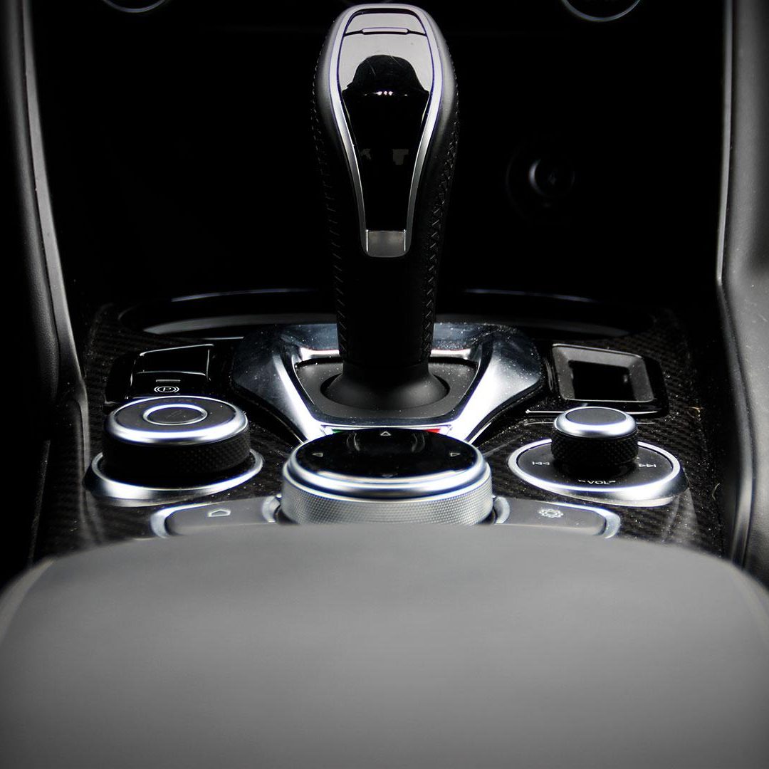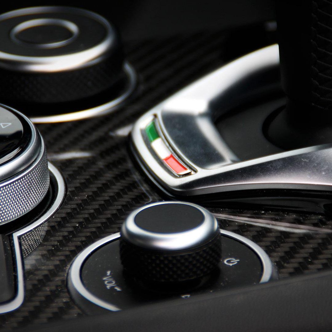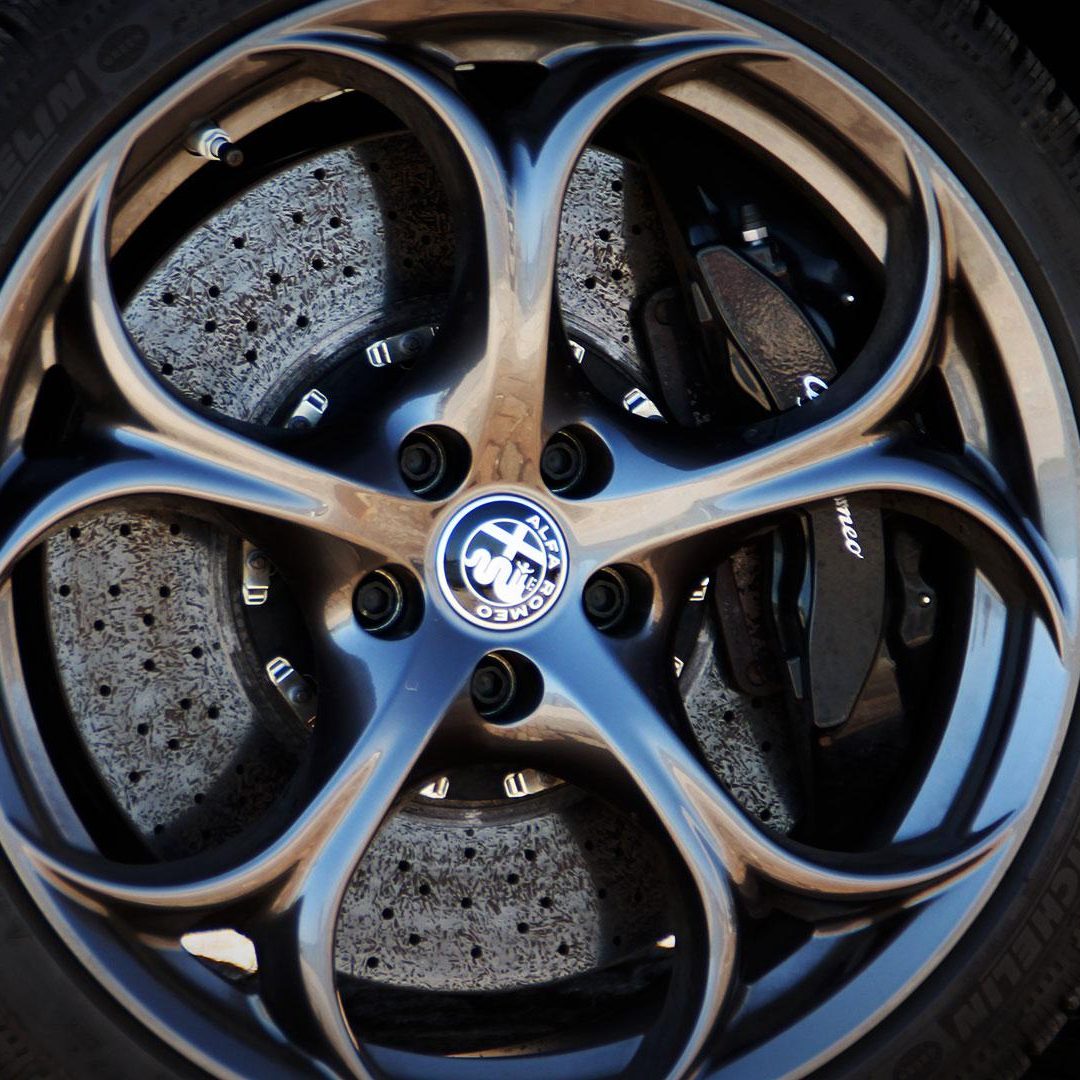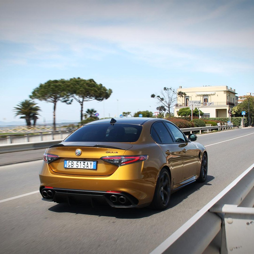 Molto ben rifinito l’ambiente interno, che mette alla vista superfici rivestite con pellami e Alcantara impreziosite da bellissime impunture a contrasto, inserti metallici e fibra di carbonio a profusione e numerosissimi vani per gli oggetti di piccole dimensioni. Nonché tanti punti per la ricarica dei device mobili. Una strumentazione che affianca elementi analogici e digitali, un volante davvero impeccabile (si potrebbe solo richiedere un po’ di spessore in più dalla corona in corrispondenza delle 9:15) con pulsante start e comandi integrati e con paddles metallici fissi alle spalle completa la caratterizzazione di un abitacolo che combina insieme eleganza e sportività e che non manca di far trasparire il logo del Quadrifoglio e il nostro bel Tricolore al fianco di sedili anteriori ampiamente regolabili. E come all’interno, anche all’esterno la fibra di carbonio la fa da padrona, tanto in elementi lasciati liberi alla vista (come superfici aerodinamiche, minigonne e tetto) quanto in quelli che lo nascondono (come cofano anteriore e bagagliaio). Insomma: una vera sportiva di razza travestita da berlina.