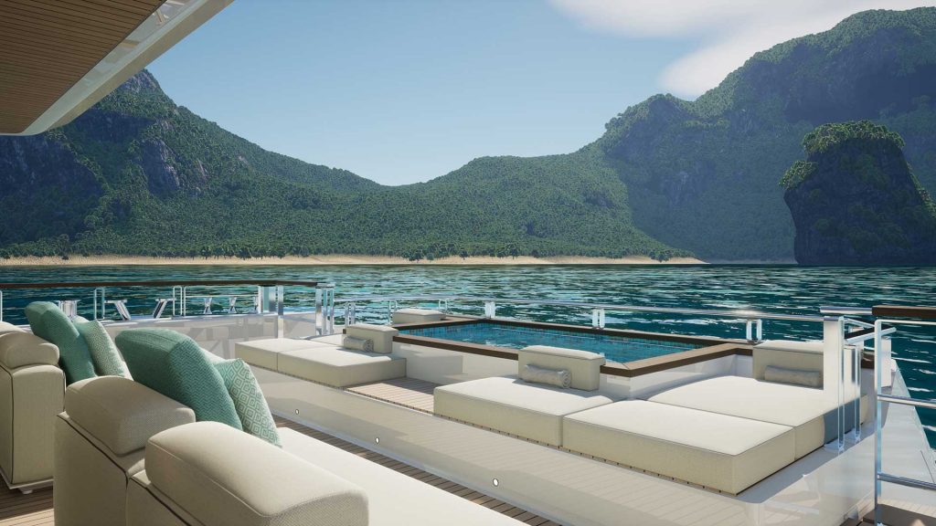 L’imbarcazione è dotata di una piscina sul ponte di poppa, che è posta sopra al garage dei water toys. L’area del ponte open-space consente di cenare all’aperto al coperto. A bordo possono essere ospitate 10 persone grazie ad un layout a cinque cabine composto da una master suite, che trova spazio sul ponte principale a prua e da quattro cabine disposte lungo il ponte inferiore.