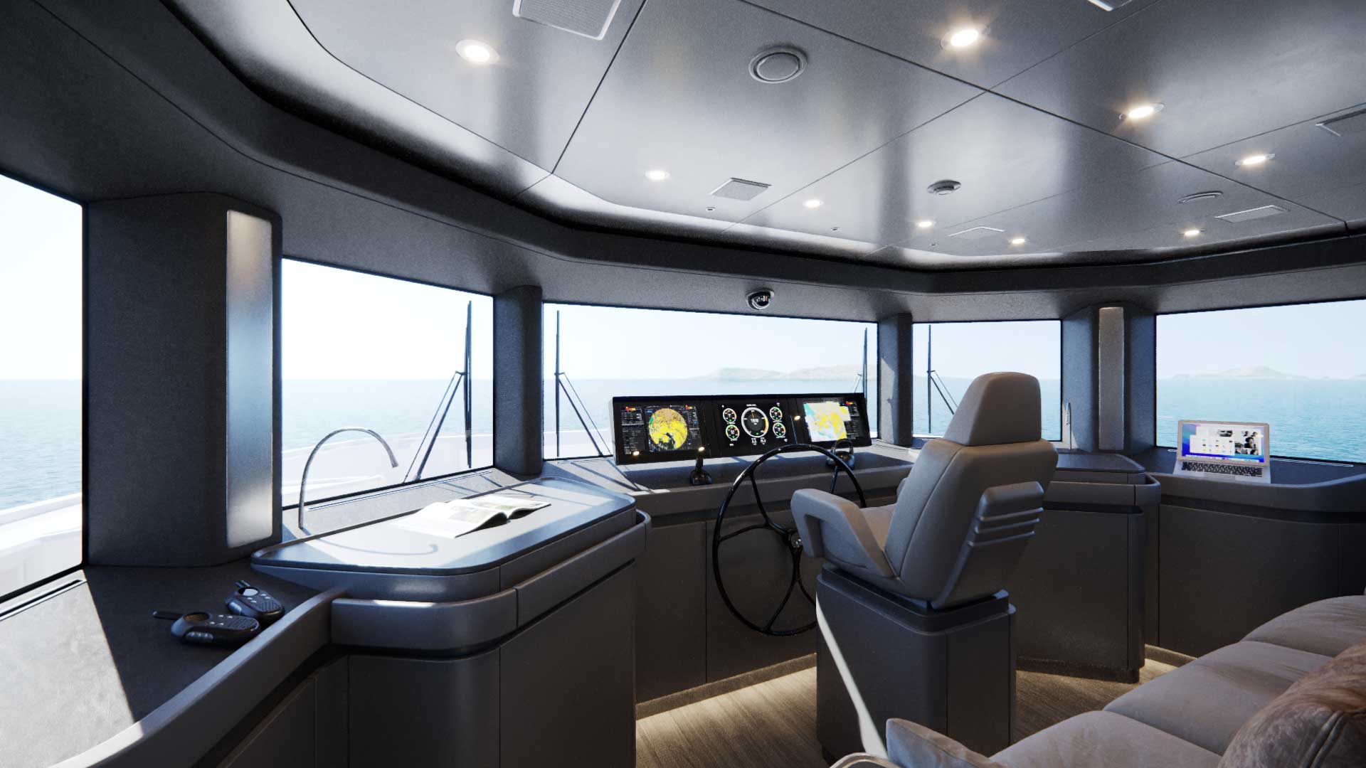 La privacy è garantita anche dalla separazione tra i percorsi di ospiti e crew, che dispone di una scala dedicata. La dotazione include anche una pantry super accessoriata e, in optional, l’offerta di una seconda day toilet nell’Upper. Le cabine sono cinque: l’armatoriale sulla prua del Main, a tutta larghezza e luminosissima, mentre il Lower accoglie le quattro cabine ospiti. Negli interni il cantiere ha chiesto a Igor Lobanov di optare per materiali naturali e, ove possibile, eco-compatibili, e per un design dalle linee morbide e arredi piacevoli al tatto: sono stati adottati elementi e ispirazioni all’Art Déco, come curve slanciate e superfici laccate scure. La palette di colori è neutra e chiara con alcuni elementi scuri o metallici in contrasto.