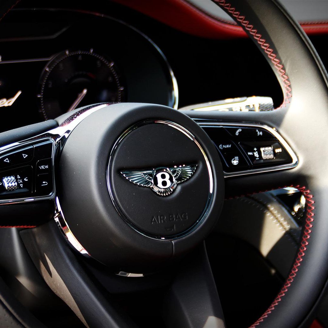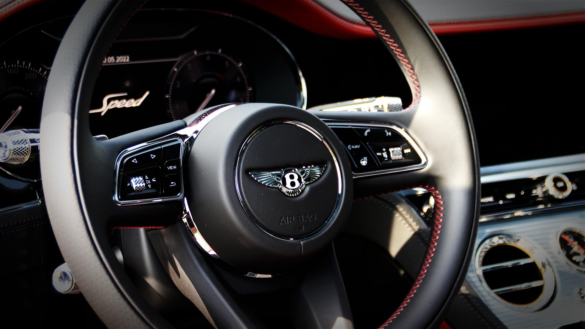 Come ci si aspetterebbe da una Bentley, l’abitacolo accoglie pilota e occupanti all’interno di un ambiente molto curato in cui è il comfort a fare la voce del leone. Si viene infatti davvero coccolati a bordo di Bentley Continental GT Speed: le sedute sono comode e accoglienti e consentono di macinare km in totale relax senza mai affaticare (e non mancano attenzioni come riscaldamento e ventilazione dei sedili, nonché le molteplici regolazioni e le funzioni di memoria); i piccoli oggetti trovano ampio spazio all’interno di numerosi vani (particolarmente degne di nota le feritoie ai lati del tunnel centrale per ospitare gli smartphone di pilota e passeggero); i bagagli trovano posto in un vano giusto per la natura della vettura; la luce naturale può essere incrementata grazie al tetto in vetro oscurabile da un filtro elettrico e i rivestimenti esibiscono con orgoglio Alcantara, pellami con motivo Diamond in Diamond di serie e tutta una serie di ricami a contrasto lasciati liberi alla vista. Ampiamente regolabile e co un’ottima impugnatura il volante, che integra tutti i comandi necessari alle 9:15 e i paddles di cambiata che seguono lo stesso nell’arco della rotazione. Lettering, loghi e innumerevoli superfici contrastanti tra loro completano un cockpit molto ricercato in termini di impatto visivo, ma che paga il dazio di troppi elementi plastici legati alle logiche di grande Gruppo. Impressionante il suono dell’impianto audio Naim for Bentley, che regala dei bassi davvero sensazionali e ottimo anche l’infotainment, sia per gestione (intuitiva) che per reattività e che si interfaccia con gli occupanti tramite un grandissimo schermo centrale rotante e mediante una strumentazione digitale che fornisce di più che tutte le informazioni necessarie alla guida e coadiuvata da un ottimamente leggibile Head-Up-Display. Il tutto mentre si è avvolti dal comfort acustico più totale: davvero un plauso all’insonorizzazione interna di questa Bentley, che permette di viaggiare immersi nel relax più totale. Solo in modalità SPORT (giustamente) il motore inizia a far sentire la sua presenza, ma senza mai risultare invasivo.