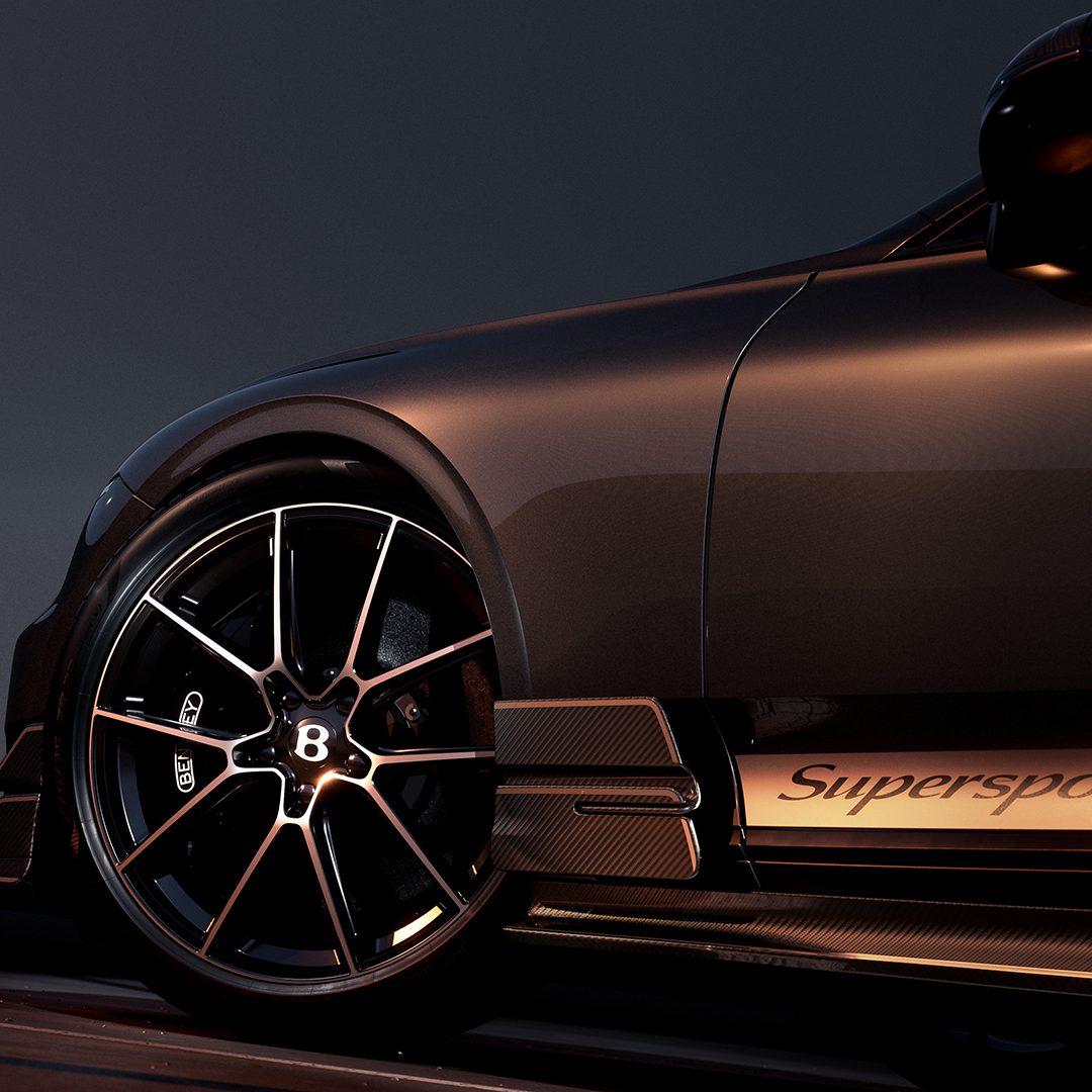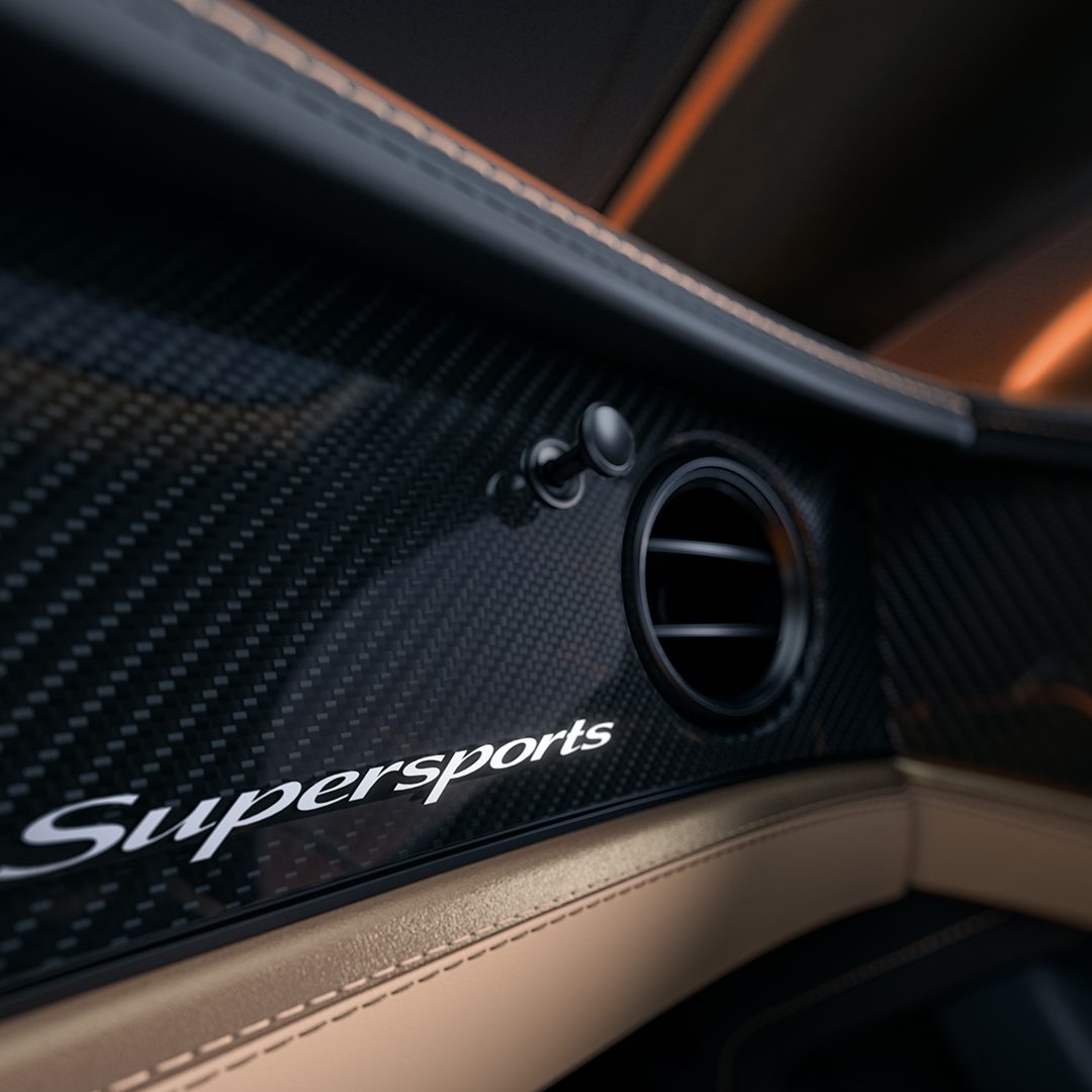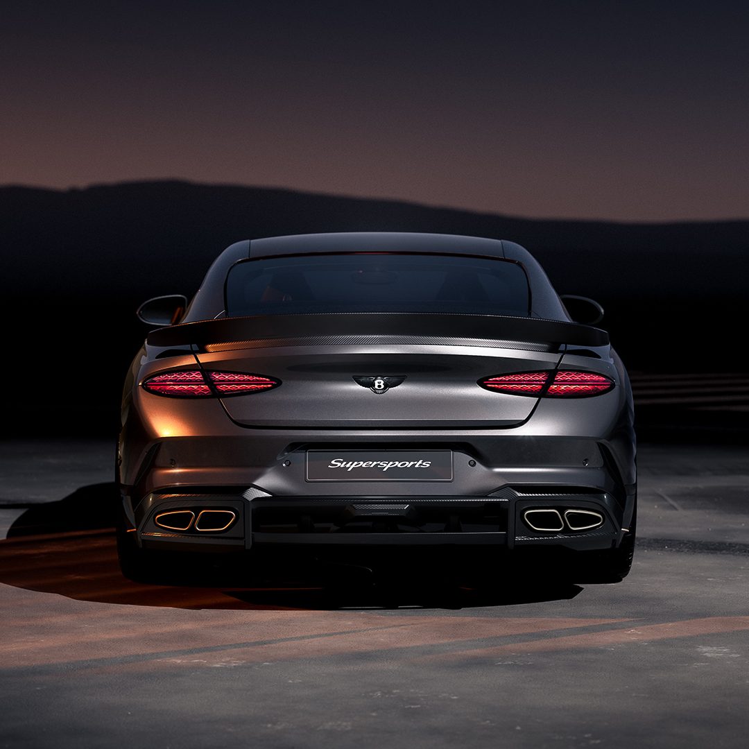 Come ormai Bentley ci ha abituati, anche la Continental GT Supersports sfrutta un telaio estremamente evoluto e finalizzato ad un solo e chiaro obiettivo: massimizzare le prestazioni dinamiche e restituire quindi un elevato handling alla guida. Ecco quindi che troviamo uno chassis dotato di doppi bracci trasversali in alluminio all’anteriore e di un assale posteriore multi-link, di molle pneumatiche e di nuovi ammortizzatori a doppia camera controllati in modo indipendente dalla centralina elettronica, tanto in estensione quanto in compressione. A coronare il tutto troviamo il Bentley Dynamic Ride, un sistema antirollio elettrico da 48 V che può applicare fino a 1300 Nm di coppia di reazione antirollio in 0,3 secondi. L’impianto frenante è il più grande mai visto su un’auto stradale: dischi in carbonio-carburo di silicio (CSiC) da 440 mm sull’asse anteriore (lavorati da pinze a 10 pistoncini), e dischi da 410 mm (con pinze a quattro pistoncini) al posteriore. Di serie. Le pinze vengono proposte in colore nero, ma come optional sono disponibili anche di colore rosso. E ovviamente non mancano primizie anche sul fronte aerodinamico (contribuendo inoltre ad incrementare la ‘muscolosità’ della vettura) per incrementare il carico verticale: davanti debutta un inedito paraurti con integrato lo splitter più grande mai visto su una Bentley stradale, mentre i fianchi mettono in mostra inedite minigonne. L’ala di coda fissa e l’estrattore (che integra ai lati le quattro uscite di scarico) in CFRP (insieme a tutta una serie di inedite soluzioni aerodinamiche) completano la dotazione, consentendo così – nel lavoro congiunto di tutte – di generare oltre 300 kg di deportanza in più rispetto a quelli promessi dalla Continental GT Speed.