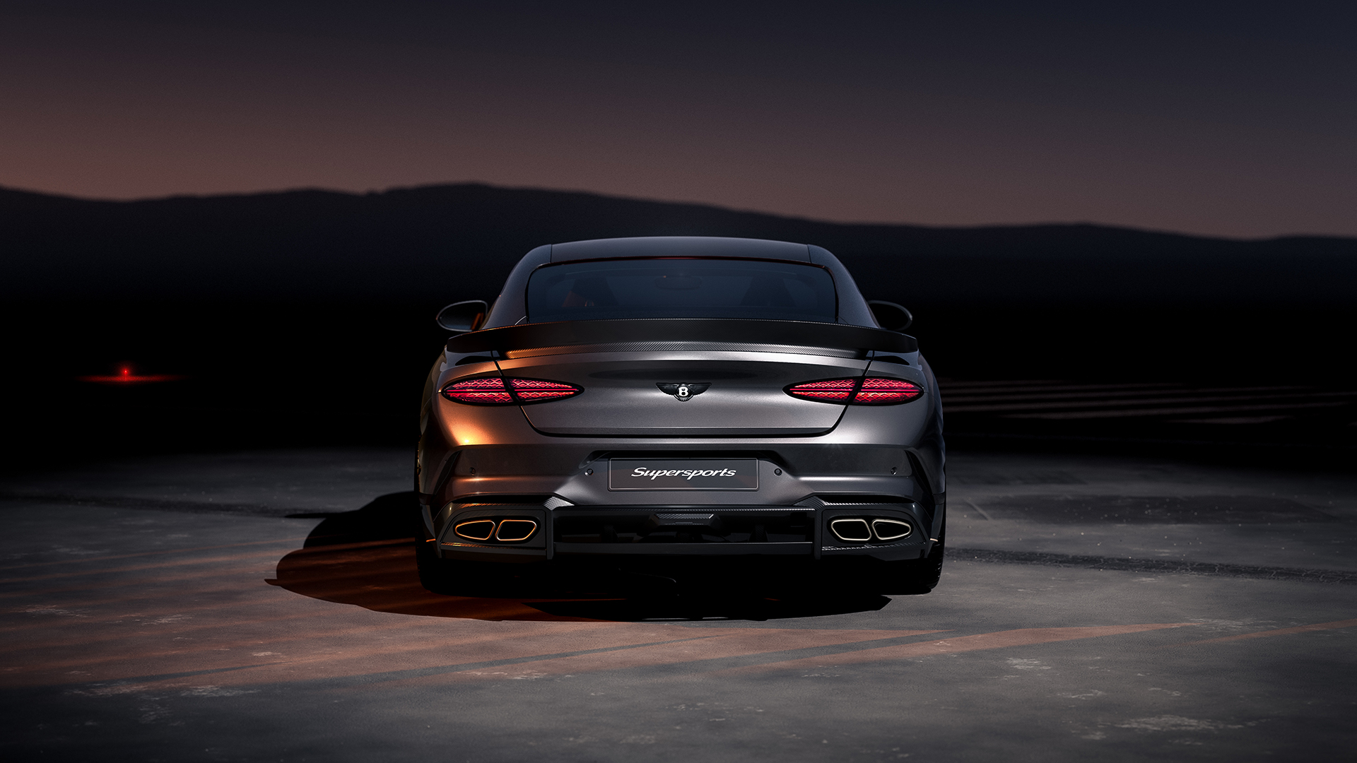 Come ormai Bentley ci ha abituati, anche la Continental GT Supersports sfrutta un telaio estremamente evoluto e finalizzato ad un solo e chiaro obiettivo: massimizzare le prestazioni dinamiche e restituire quindi un elevato handling alla guida. Ecco quindi che troviamo uno chassis dotato di doppi bracci trasversali in alluminio all’anteriore e di un assale posteriore multi-link, di molle pneumatiche e di nuovi ammortizzatori a doppia camera controllati in modo indipendente dalla centralina elettronica, tanto in estensione quanto in compressione. A coronare il tutto troviamo il Bentley Dynamic Ride, un sistema antirollio elettrico da 48 V che può applicare fino a 1300 Nm di coppia di reazione antirollio in 0,3 secondi. L’impianto frenante è il più grande mai visto su un’auto stradale: dischi in carbonio-carburo di silicio (CSiC) da 440 mm sull’asse anteriore (lavorati da pinze a 10 pistoncini), e dischi da 410 mm (con pinze a quattro pistoncini) al posteriore. Di serie. Le pinze vengono proposte in colore nero, ma come optional sono disponibili anche di colore rosso. E ovviamente non mancano primizie anche sul fronte aerodinamico (contribuendo inoltre ad incrementare la ‘muscolosità’ della vettura) per incrementare il carico verticale: davanti debutta un inedito paraurti con integrato lo splitter più grande mai visto su una Bentley stradale, mentre i fianchi mettono in mostra inedite minigonne. L’ala di coda fissa e l’estrattore (che integra ai lati le quattro uscite di scarico) in CFRP (insieme a tutta una serie di inedite soluzioni aerodinamiche) completano la dotazione, consentendo così – nel lavoro congiunto di tutte – di generare oltre 300 kg di deportanza in più rispetto a quelli promessi dalla Continental GT Speed.