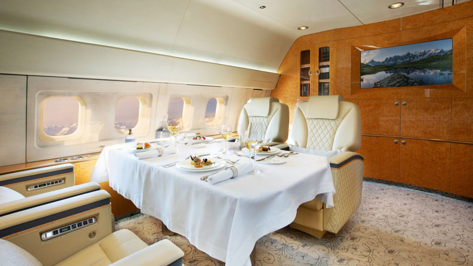 Forte di una cabina che mette a disposizione 28.7 metri di lunghezza e 3.45 metri di larghezza, il Boeing 767-200ER “SkyLady” dispone di due piloti e di 5 membri dell’equipaggio ed è in grado di mantenere una velocità di crociera di 476 nodi (860 km/h) per 6.700 miglia nautiche di autonomia e mette a disposizione degli occupanti tutti i comfort, tra cui l’accesso a Internet tramite WiFi, i servizi streaming online ad alta definizione, degli schermi 4K da 43”, i sistemi di intrattenimento individuali HD con device portatili, degli iPad per tutti i passeggeri e un sistema di selezione media precaricato. Se volete volare in grande stile insomma, questo è l’aereo che fa per voi!