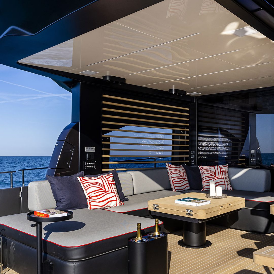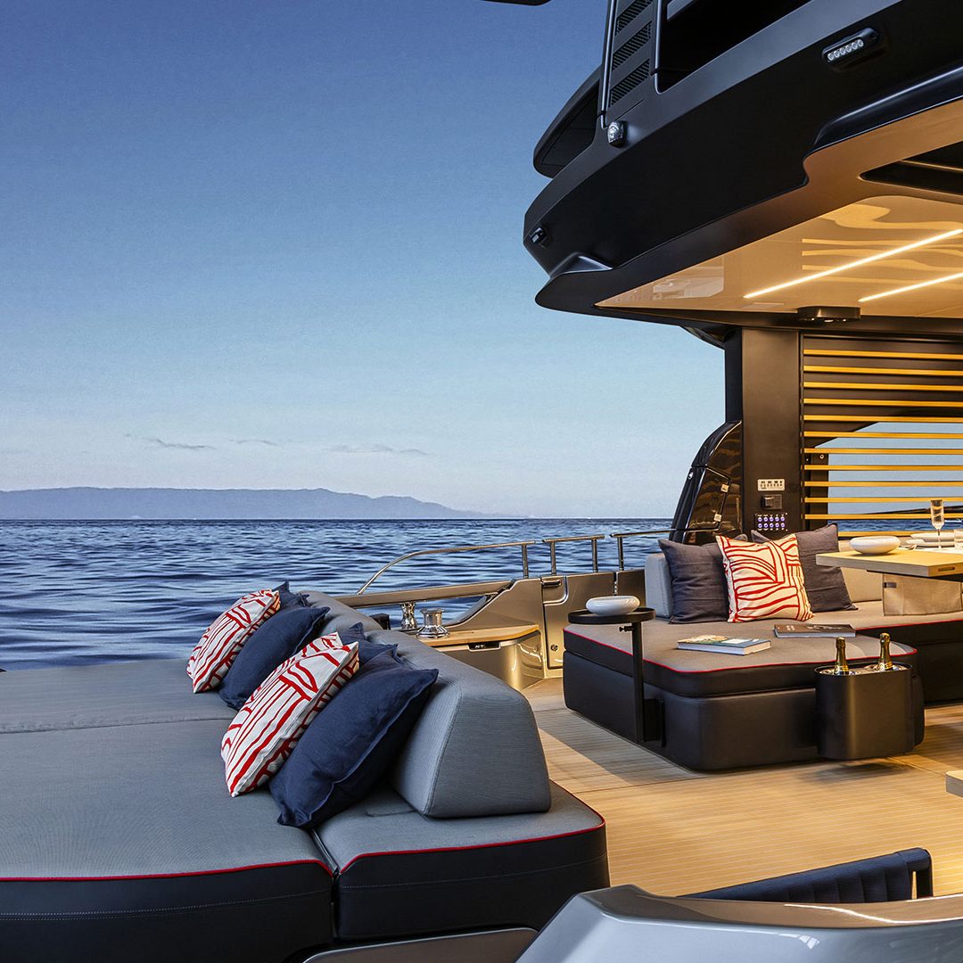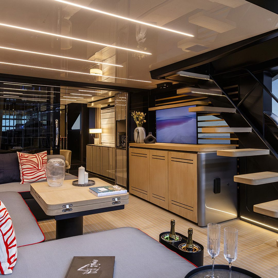 Il flybridge, compatto e privo di t-top, contribuisce a un profilo filante, rivelando al contempo grandi spazi, con prendisole, zona living e una timoniera ergonomica dalle proporzioni equilibrate, in una commistione tra funzionalità e comfort. Il cuore pulsante dello yacht è il salone riparato dal flybridge, un ambiente che si sviluppa in profondità, aprendosi completamente verso poppa per offrire una vista ininterrotta sul mare. Le grandi vetrate laterali elettriche non solo aggiungono un elemento scenografico, ma creano giochi di luce e ombra attraverso le fenditure in legno dall’evidente riferimento esotico, che arricchiscono l’atmosfera e favoriscono una ventilazione naturale. Una sensazione enfatizzata dalla continuità visiva verso l’orizzonte a poppa, oltre la copertura data dal fly.