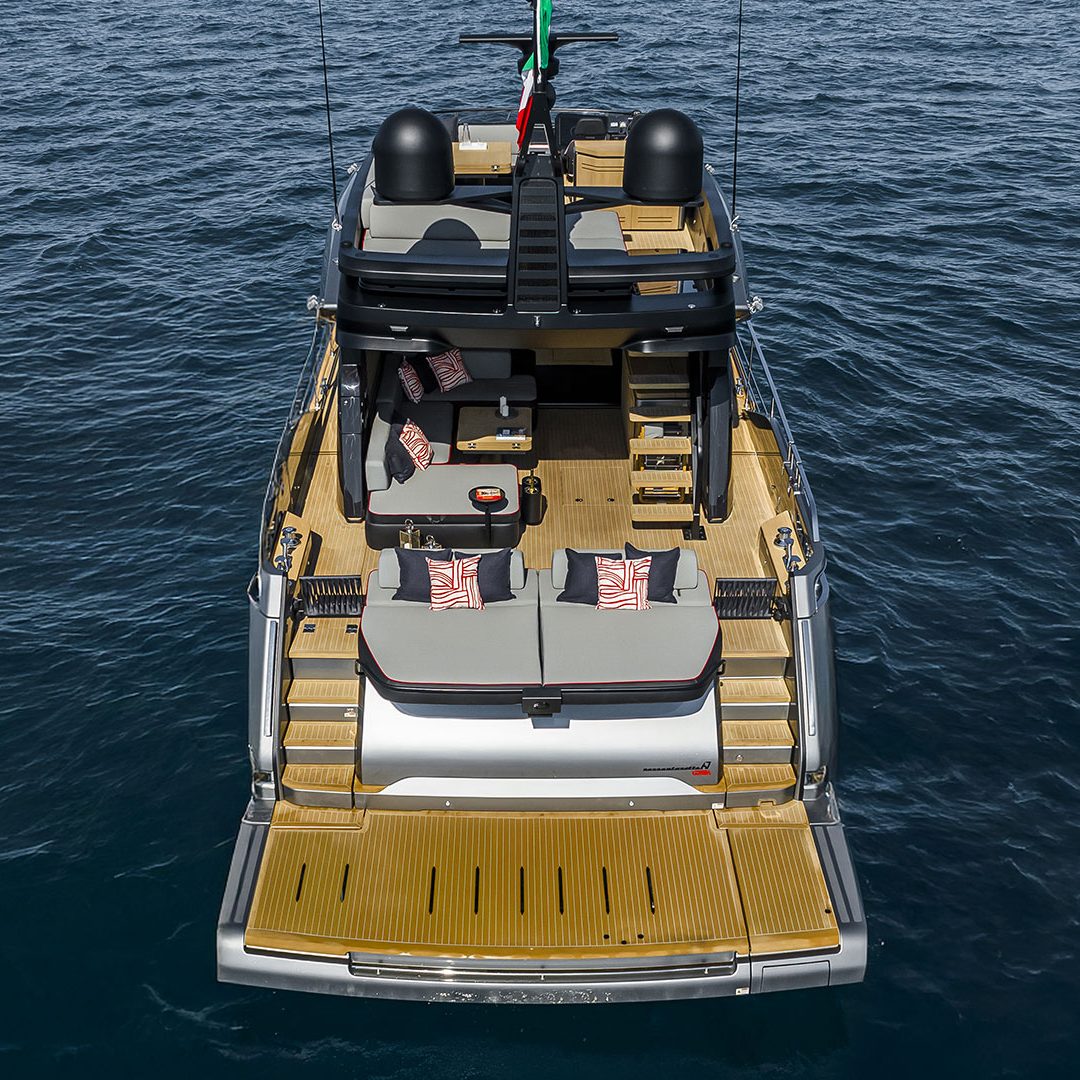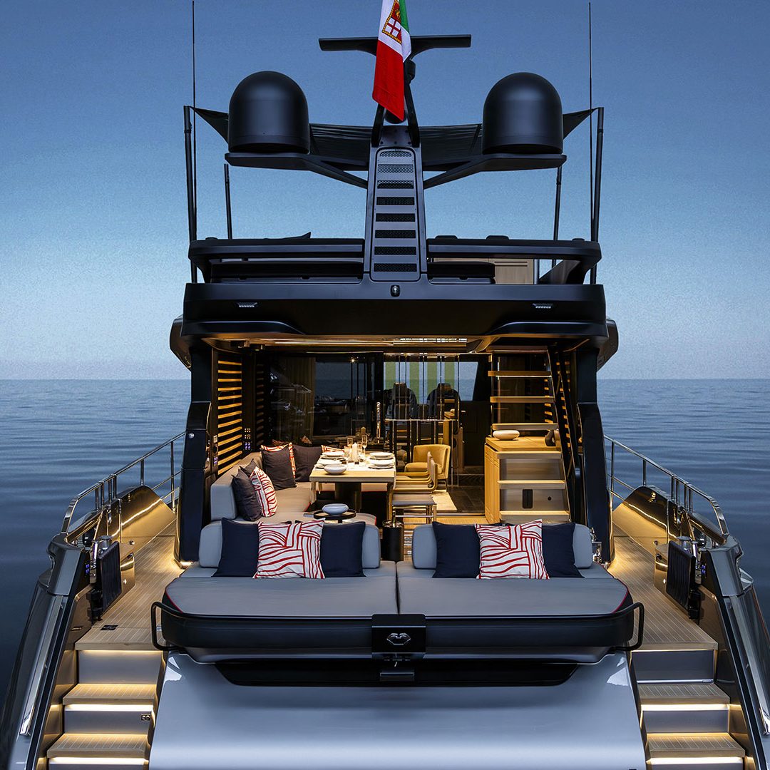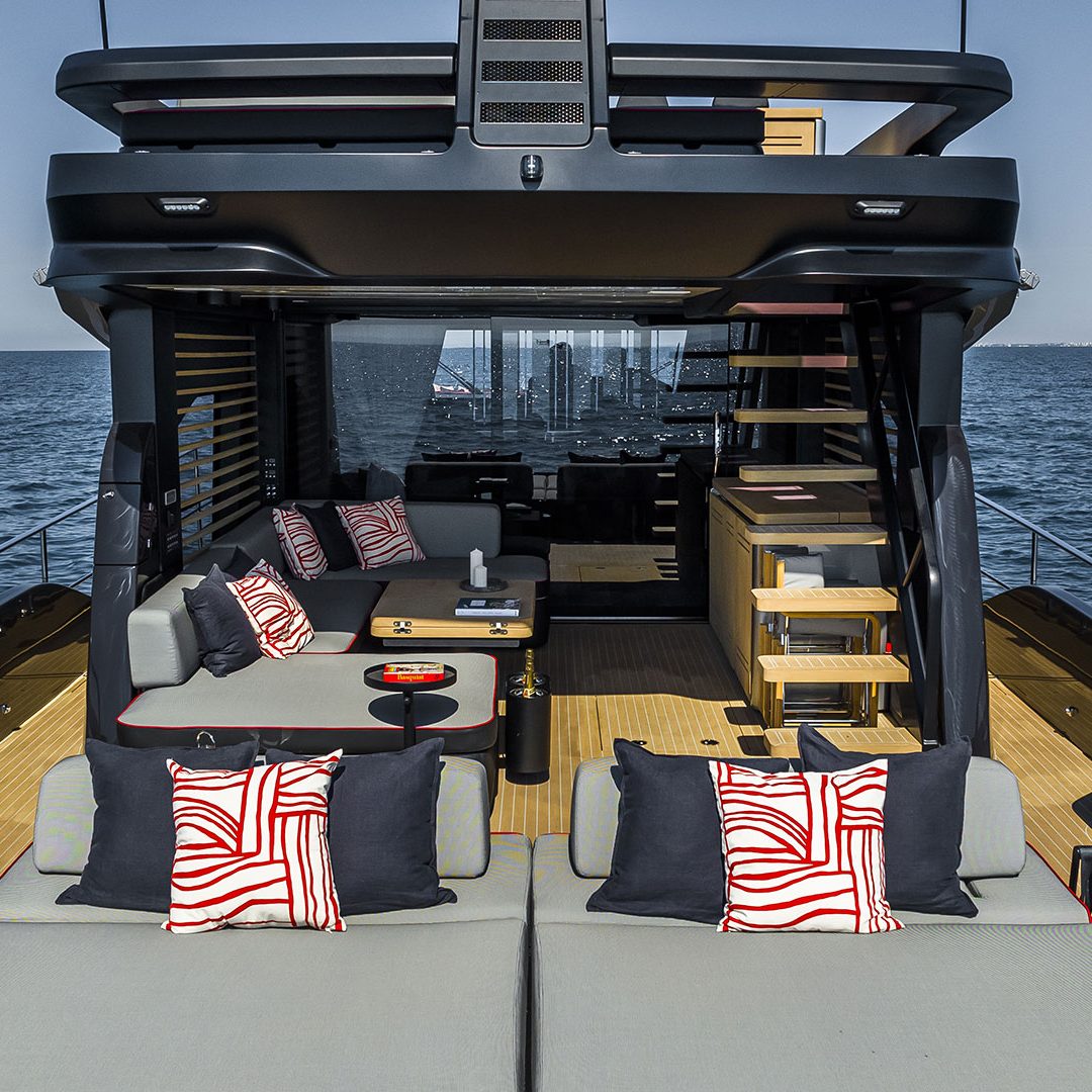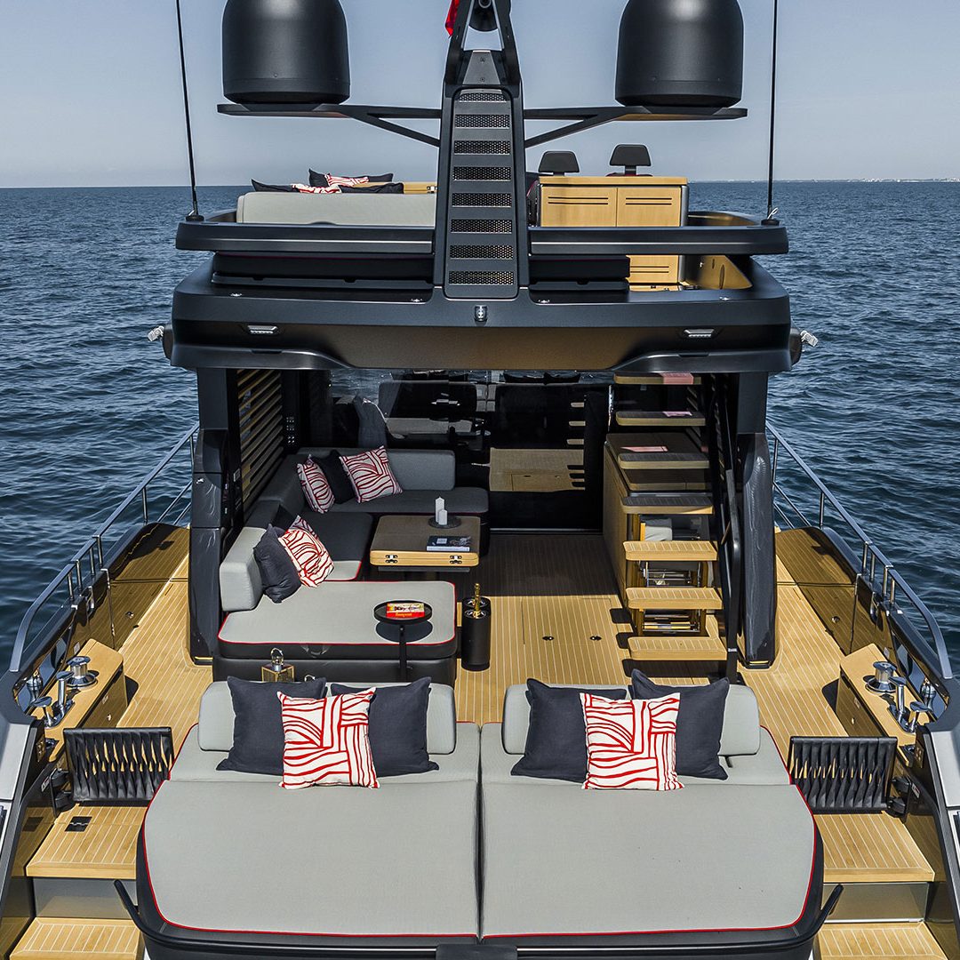 Il flybridge, compatto e privo di t-top, contribuisce a un profilo filante, rivelando al contempo grandi spazi, con prendisole, zona living e una timoniera ergonomica dalle proporzioni equilibrate, in una commistione tra funzionalità e comfort. Il cuore pulsante dello yacht è il salone riparato dal flybridge, un ambiente che si sviluppa in profondità, aprendosi completamente verso poppa per offrire una vista ininterrotta sul mare. Le grandi vetrate laterali elettriche non solo aggiungono un elemento scenografico, ma creano giochi di luce e ombra attraverso le fenditure in legno dall’evidente riferimento esotico, che arricchiscono l’atmosfera e favoriscono una ventilazione naturale. Una sensazione enfatizzata dalla continuità visiva verso l’orizzonte a poppa, oltre la copertura data dal fly.