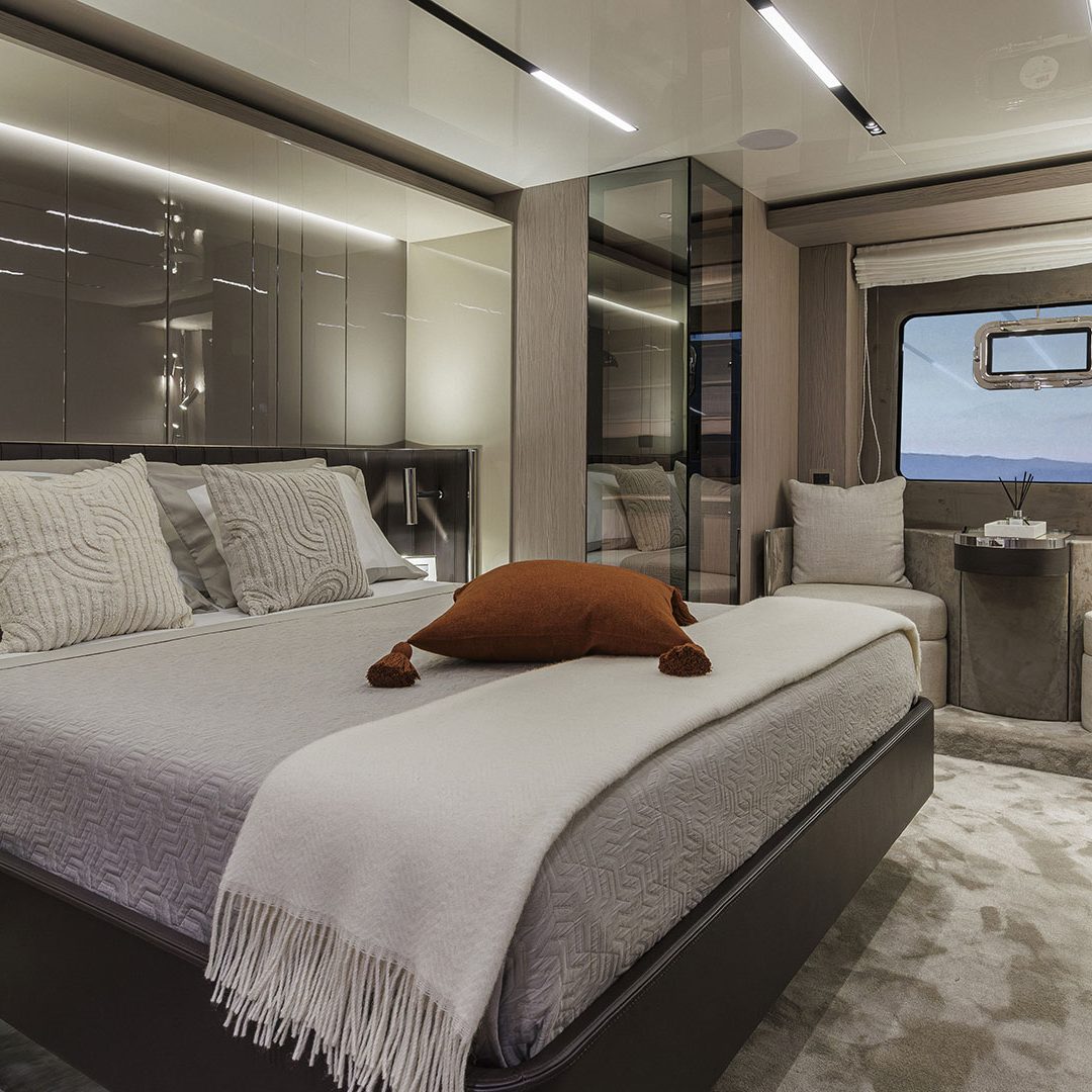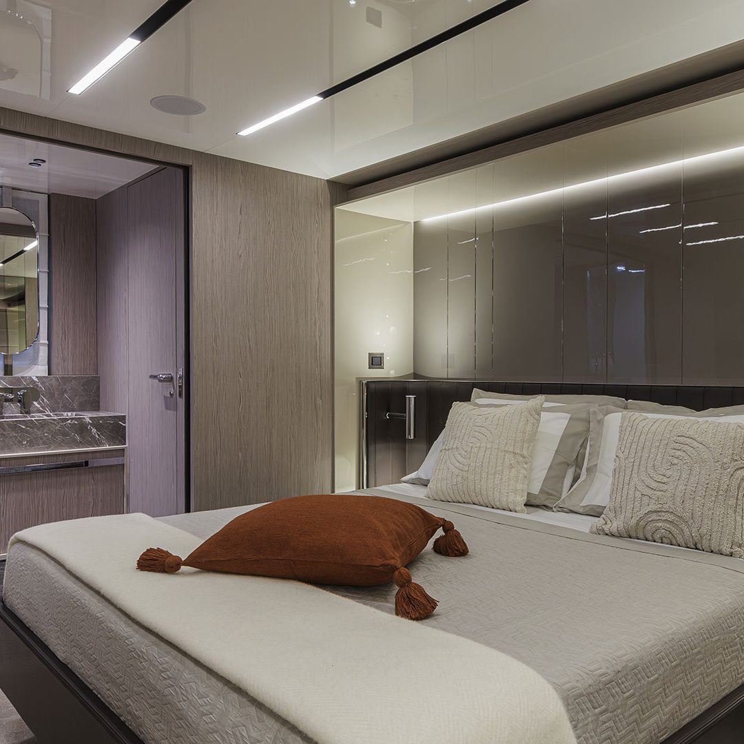 La cucina è il cuore pulsante che serve l’area living indoor, un rifugio privato dove ritirarsi in intimità e relax. Il suo design caratterizza appieno l’armatore del Sessantasette 67 Corsa. Sul ponte inferiore troviamo la suite armatoriale full-beam, caratterizzata da un bagno a murata impreziosito da vetri fumé. In questo modo si abbattono le barriere visive, pur mantenendo la privacy in ambienti come la zona toilette. Una scelta che racchiude quasi un linguaggio intrinseco, capace di trasformare questo ambiente in un rifugio di totale libertà e senza inibizioni.