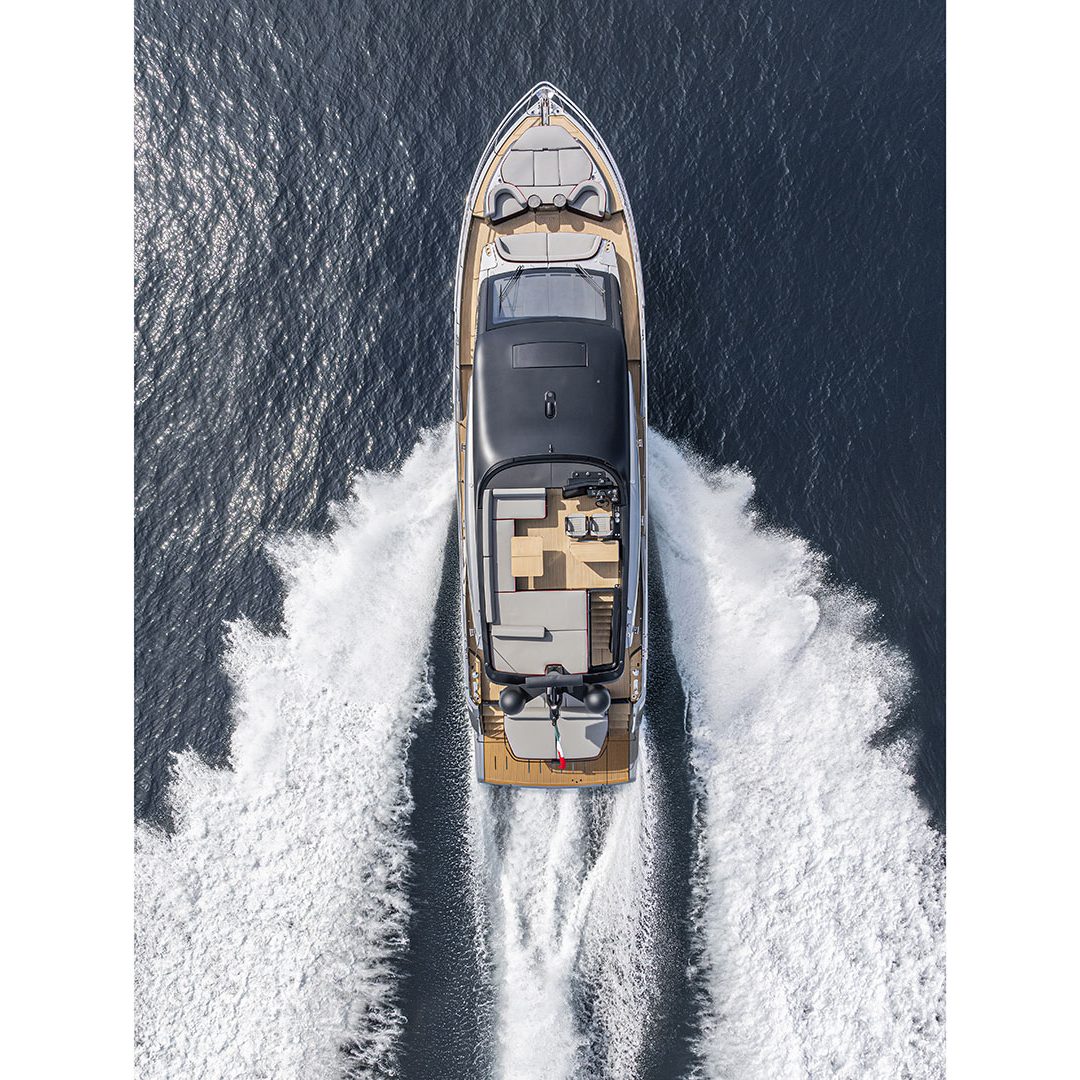 La prima unità del Sessantasette 67 Corsa è allestita nel décor Milano, i cui colori si ispirano alle spiagge incontaminate e dove le moquette sembrano commutarsi in un qualcosa di verticale e diventare pareti. I materiali si alternano volutamente tra caldi e freddi, mentre la luce si muove con una modalità diversa sulle pelli lucide e opache, creando un’alternanza di suggestioni, esaltate anche dal lighting design interno. Il design di Christian Grande celebra il dialogo continuo tra interno ed esterno: una porta a vetri collega il living al pozzetto di poppa, mentre aperture strategiche come la porta laterale e le finestre completamente apribili permettono alla luce naturale e alla brezza marina di avvolgere delicatamente gli spazi, creando un’atmosfera di connessione con il mare. Il main deck si presenta come un vero e proprio open space. La timoneria offre una postazione privilegiata ma al tempo stesso nascosta e privata.