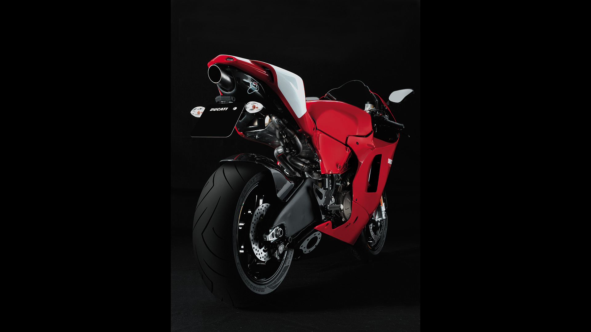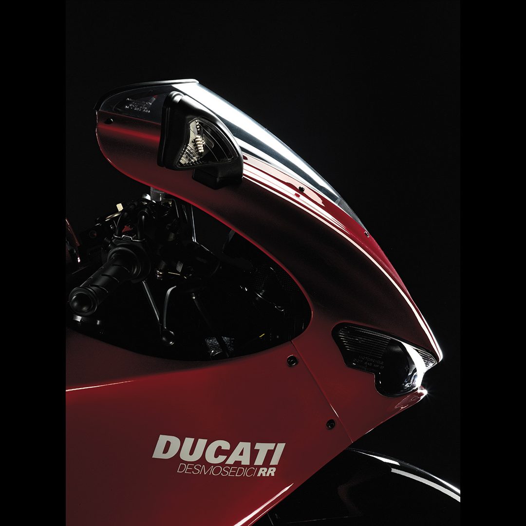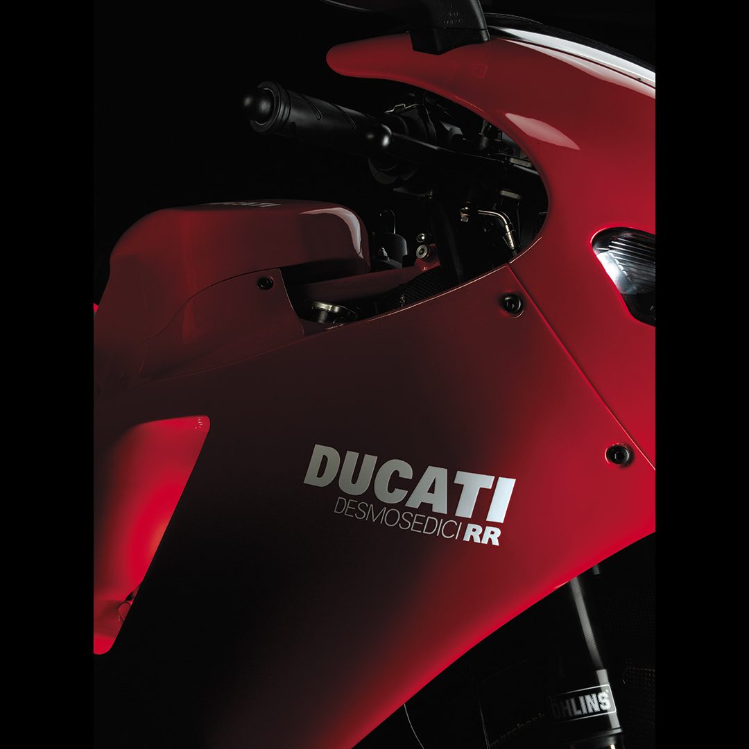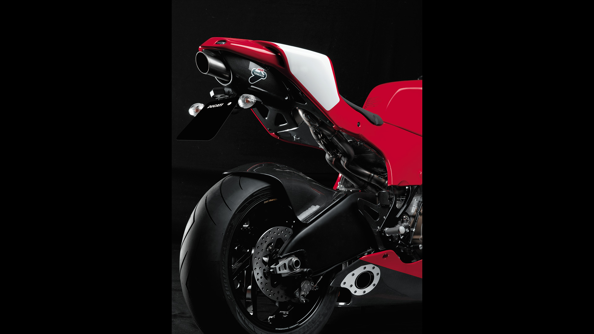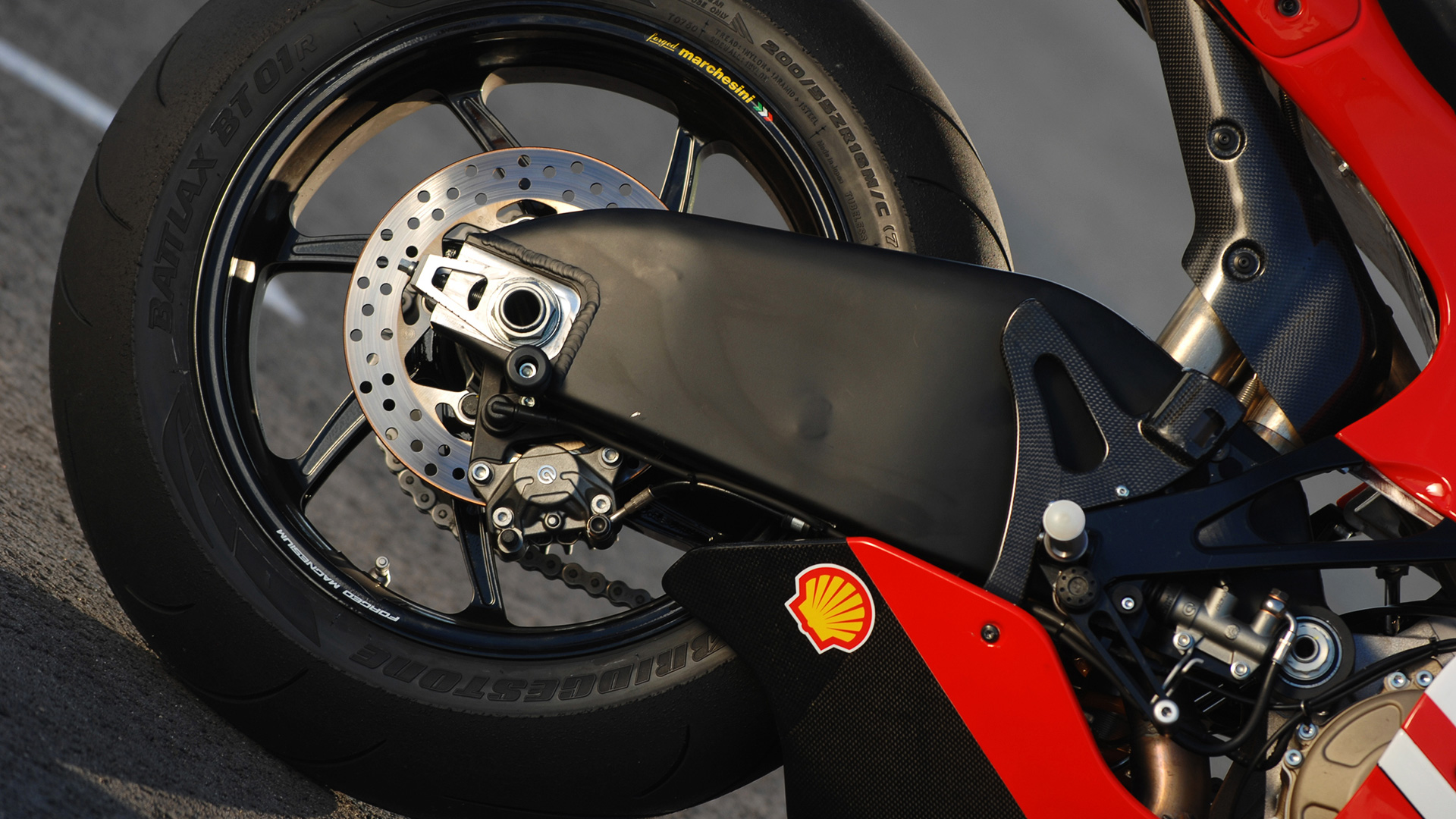 Ma andiamo diretti al dunque: il cuore della Desmosedici RR pulsava nel quattrocilindri desmodromico. Un’unità da 989 cc con architettura quadricilindrica a L e con fasatura Twin Pulse (ovvero a scoppi asimmetrici) e ovviamente con distribuzione desmodromica con 16 valvole in titanio (Desmosedici, per l’appunto). La potenza? Oltre 200 CV con scarico Racing (il cui kit veniva fornito a corredo di ogni moto). Ovviamente di prim’ordine la dotazione tecnica. Di quelle da far ‘leccare i baffi’ a tutti gli appassionati: quattro corpi farfallati con iniettori a 12 fori sopra farfalla; doppio albero a camme in testa e con comando a cascata di ingranaggi; bielle in titanio; cambio estraibile a sei marce; basamenti e teste fusi in terra; coperchi in magnesio fusi in terra; impianto di scarico 4 in 2 in 1 con silenziatore dotato di uscite a camino (arriverà poi un kit accessorio che permetterà di modificare codone e scarico sulla falsariga della Desmosedici GP7 che vinse il titolo iridato con Stoner – con singola uscita di scarico Termignoni sotto al codino e uscite al di sotto del basamento – ed ispirato a quello della 1098) e frizione multidisco a secco con antisaltellamento e con comando idraulico. Sul fronte della ciclistica, la Ducati Desmosedici RR si fregiava di: telaio ibrido a traliccio in tubi d’acciaio; telaietto reggisella in fibra di carbonio, con speciali resine ad elevata resistenza termica; forcella Öhlins da 43 mm pressurizzata, regolabile in compressione, in estensione e precarico (con trattamento TiN per gli steli); monoammortizzatore Öhlins con regolazione in estensione alta/bassa velocità di compressione e precarico con attuatore idraulico e cerchi Marchesini forgiati in lega di magnesio a 7 razze. Ciliegine sulla torta: pompa radiale con leva snodata e remote adjuster abbinata a pinze radiali Brembo monoblocco con dischi da 320 x 6 mm GP6 wet race; cruscotto elettronico multifunzionale con indicatore LCD, sviluppato in collaborazione con Ducati Corse; serbatoio in lega di alluminio e carene interamente in fibra di carbonio. A chiudere il cerchio della squisita dotazione della moto erano gli pneumatici Bridgsestone appositamente realizzati per la Desmosedici RR, che presentavano uno speciale intaglio, e con struttura e profilo sviluppati ad hoc. Insomma: un vero capolavoro di ingegneria racing omologata per la strada.