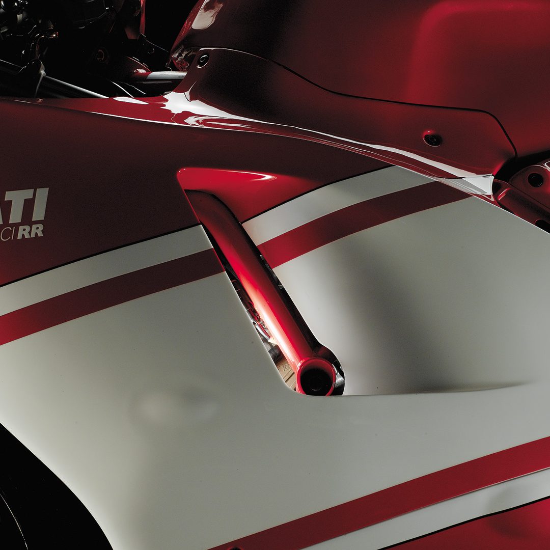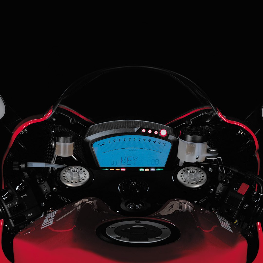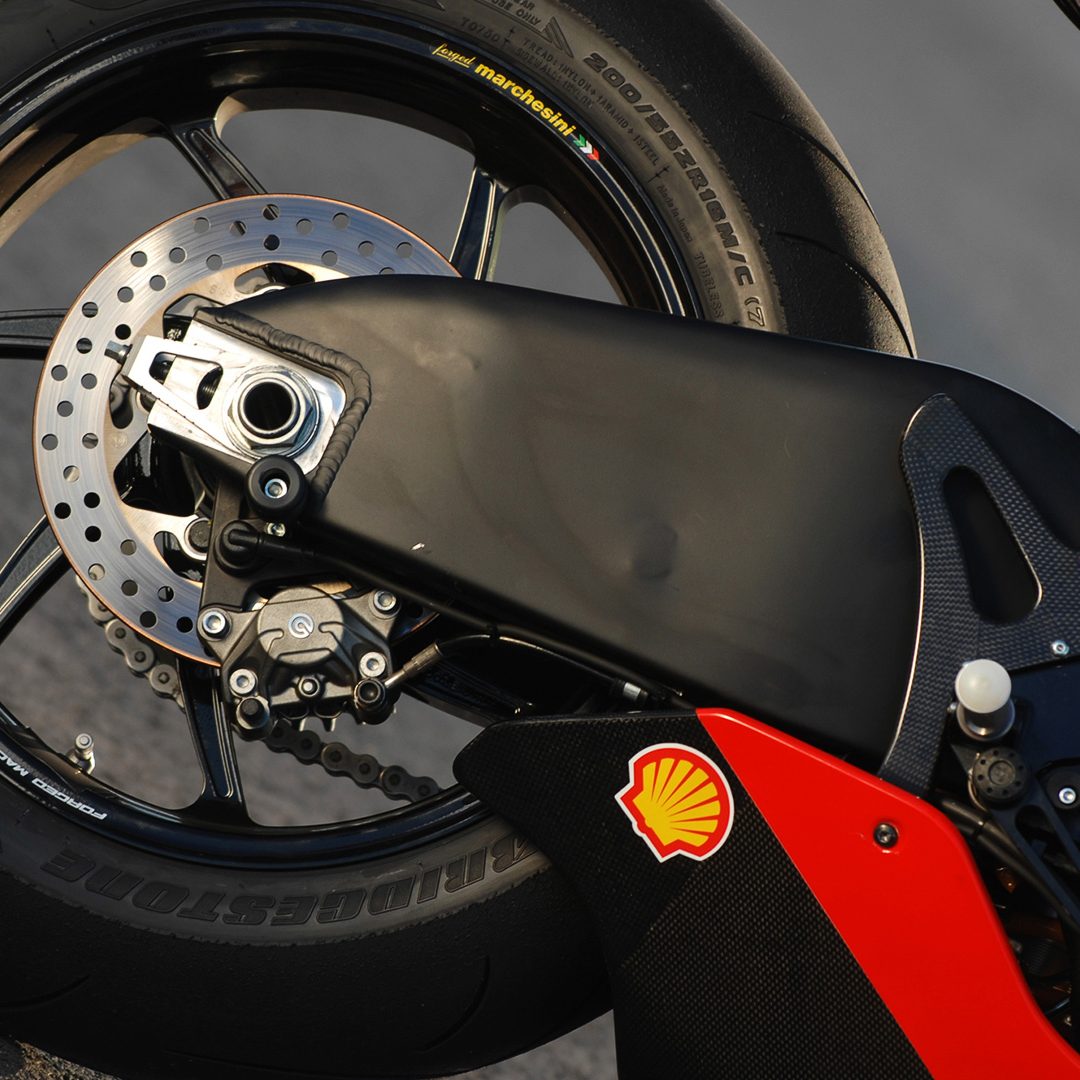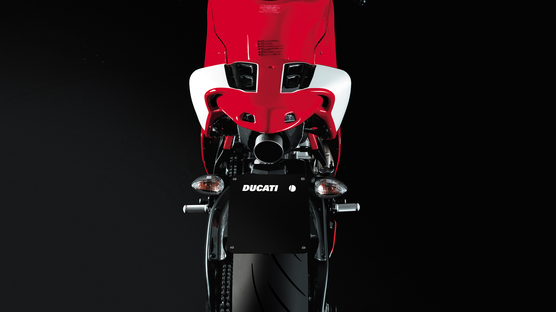 Ma andiamo diretti al dunque: il cuore della Desmosedici RR pulsava nel quattrocilindri desmodromico. Un’unità da 989 cc con architettura quadricilindrica a L e con fasatura Twin Pulse (ovvero a scoppi asimmetrici) e ovviamente con distribuzione desmodromica con 16 valvole in titanio (Desmosedici, per l’appunto). La potenza? Oltre 200 CV con scarico Racing (il cui kit veniva fornito a corredo di ogni moto). Ovviamente di prim’ordine la dotazione tecnica. Di quelle da far ‘leccare i baffi’ a tutti gli appassionati: quattro corpi farfallati con iniettori a 12 fori sopra farfalla; doppio albero a camme in testa e con comando a cascata di ingranaggi; bielle in titanio; cambio estraibile a sei marce; basamenti e teste fusi in terra; coperchi in magnesio fusi in terra; impianto di scarico 4 in 2 in 1 con silenziatore dotato di uscite a camino (arriverà poi un kit accessorio che permetterà di modificare codone e scarico sulla falsariga della Desmosedici GP7 che vinse il titolo iridato con Stoner – con singola uscita di scarico Termignoni sotto al codino e uscite al di sotto del basamento – ed ispirato a quello della 1098) e frizione multidisco a secco con antisaltellamento e con comando idraulico. Sul fronte della ciclistica, la Ducati Desmosedici RR si fregiava di: telaio ibrido a traliccio in tubi d’acciaio; telaietto reggisella in fibra di carbonio, con speciali resine ad elevata resistenza termica; forcella Öhlins da 43 mm pressurizzata, regolabile in compressione, in estensione e precarico (con trattamento TiN per gli steli); monoammortizzatore Öhlins con regolazione in estensione alta/bassa velocità di compressione e precarico con attuatore idraulico e cerchi Marchesini forgiati in lega di magnesio a 7 razze. Ciliegine sulla torta: pompa radiale con leva snodata e remote adjuster abbinata a pinze radiali Brembo monoblocco con dischi da 320 x 6 mm GP6 wet race; cruscotto elettronico multifunzionale con indicatore LCD, sviluppato in collaborazione con Ducati Corse; serbatoio in lega di alluminio e carene interamente in fibra di carbonio. A chiudere il cerchio della squisita dotazione della moto erano gli pneumatici Bridgsestone appositamente realizzati per la Desmosedici RR, che presentavano uno speciale intaglio, e con struttura e profilo sviluppati ad hoc. Insomma: un vero capolavoro di ingegneria racing omologata per la strada.