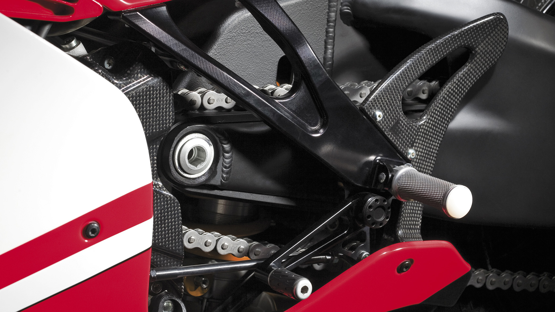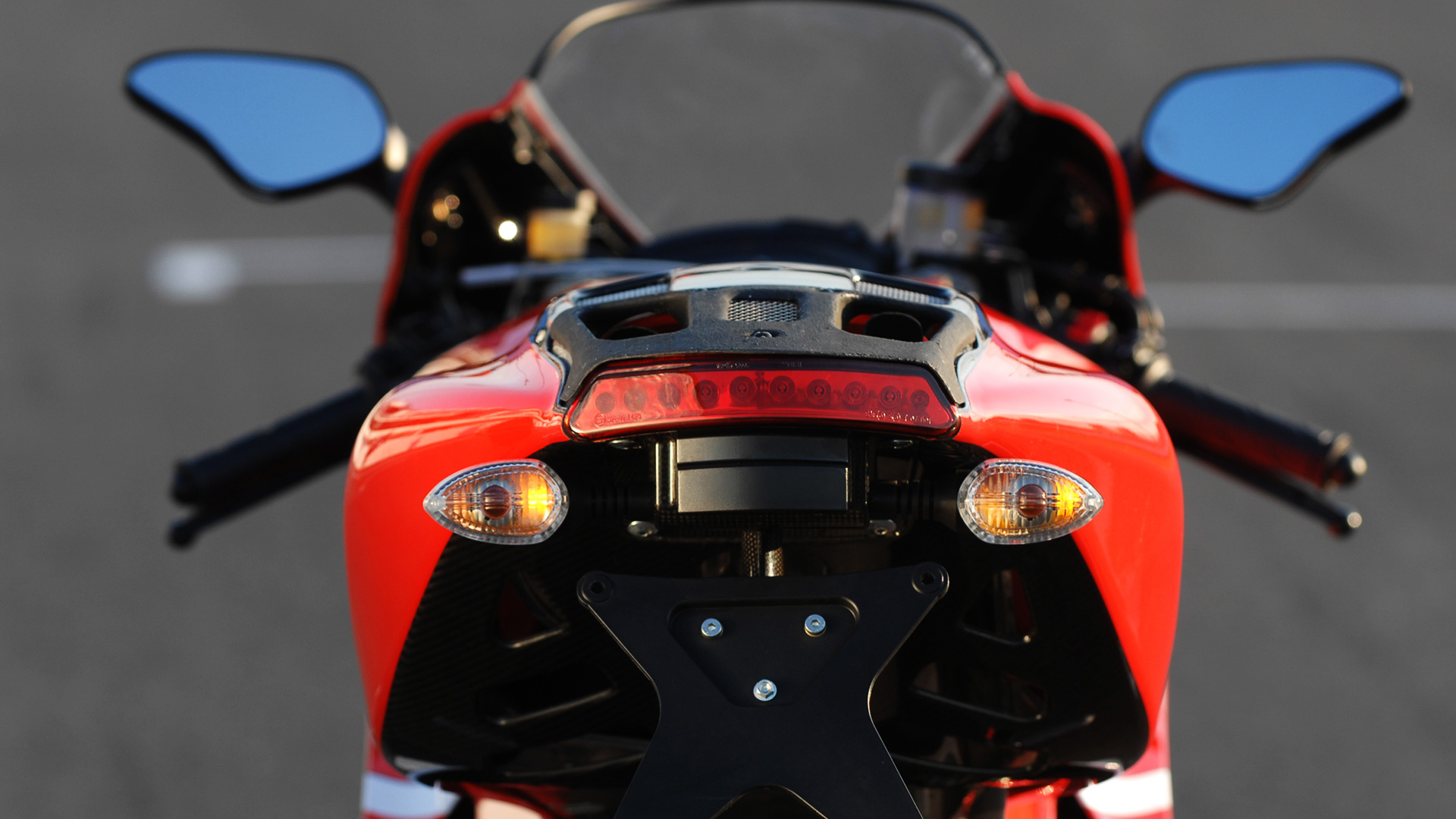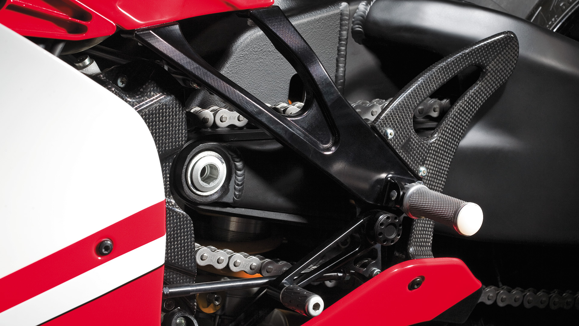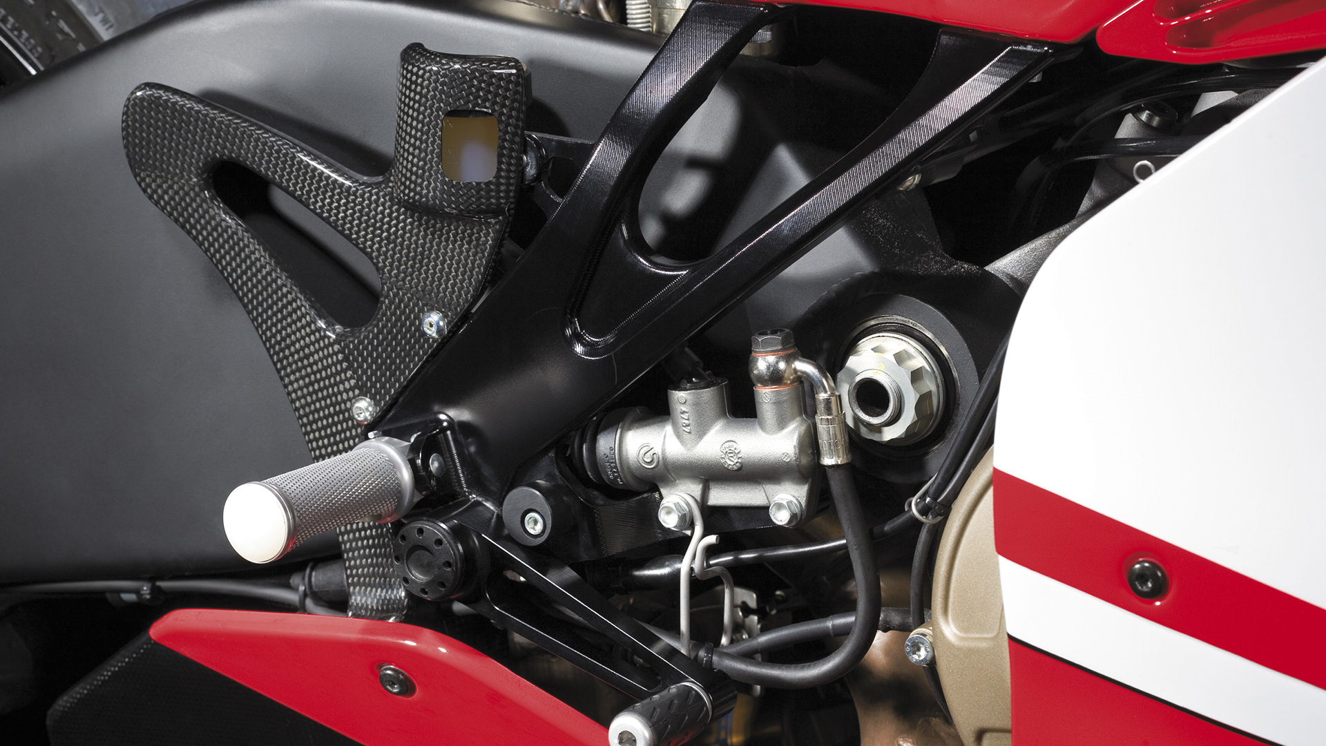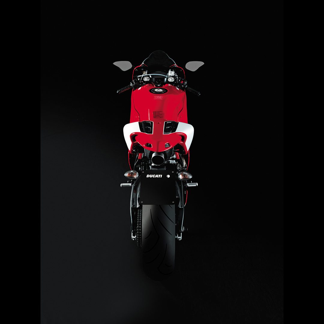 Ma andiamo diretti al dunque: il cuore della Desmosedici RR pulsava nel quattrocilindri desmodromico. Un’unità da 989 cc con architettura quadricilindrica a L e con fasatura Twin Pulse (ovvero a scoppi asimmetrici) e ovviamente con distribuzione desmodromica con 16 valvole in titanio (Desmosedici, per l’appunto). La potenza? Oltre 200 CV con scarico Racing (il cui kit veniva fornito a corredo di ogni moto). Ovviamente di prim’ordine la dotazione tecnica. Di quelle da far ‘leccare i baffi’ a tutti gli appassionati: quattro corpi farfallati con iniettori a 12 fori sopra farfalla; doppio albero a camme in testa e con comando a cascata di ingranaggi; bielle in titanio; cambio estraibile a sei marce; basamenti e teste fusi in terra; coperchi in magnesio fusi in terra; impianto di scarico 4 in 2 in 1 con silenziatore dotato di uscite a camino (arriverà poi un kit accessorio che permetterà di modificare codone e scarico sulla falsariga della Desmosedici GP7 che vinse il titolo iridato con Stoner – con singola uscita di scarico Termignoni sotto al codino e uscite al di sotto del basamento – ed ispirato a quello della 1098) e frizione multidisco a secco con antisaltellamento e con comando idraulico. Sul fronte della ciclistica, la Ducati Desmosedici RR si fregiava di: telaio ibrido a traliccio in tubi d’acciaio; telaietto reggisella in fibra di carbonio, con speciali resine ad elevata resistenza termica; forcella Öhlins da 43 mm pressurizzata, regolabile in compressione, in estensione e precarico (con trattamento TiN per gli steli); monoammortizzatore Öhlins con regolazione in estensione alta/bassa velocità di compressione e precarico con attuatore idraulico e cerchi Marchesini forgiati in lega di magnesio a 7 razze. Ciliegine sulla torta: pompa radiale con leva snodata e remote adjuster abbinata a pinze radiali Brembo monoblocco con dischi da 320 x 6 mm GP6 wet race; cruscotto elettronico multifunzionale con indicatore LCD, sviluppato in collaborazione con Ducati Corse; serbatoio in lega di alluminio e carene interamente in fibra di carbonio. A chiudere il cerchio della squisita dotazione della moto erano gli pneumatici Bridgsestone appositamente realizzati per la Desmosedici RR, che presentavano uno speciale intaglio, e con struttura e profilo sviluppati ad hoc. Insomma: un vero capolavoro di ingegneria racing omologata per la strada.