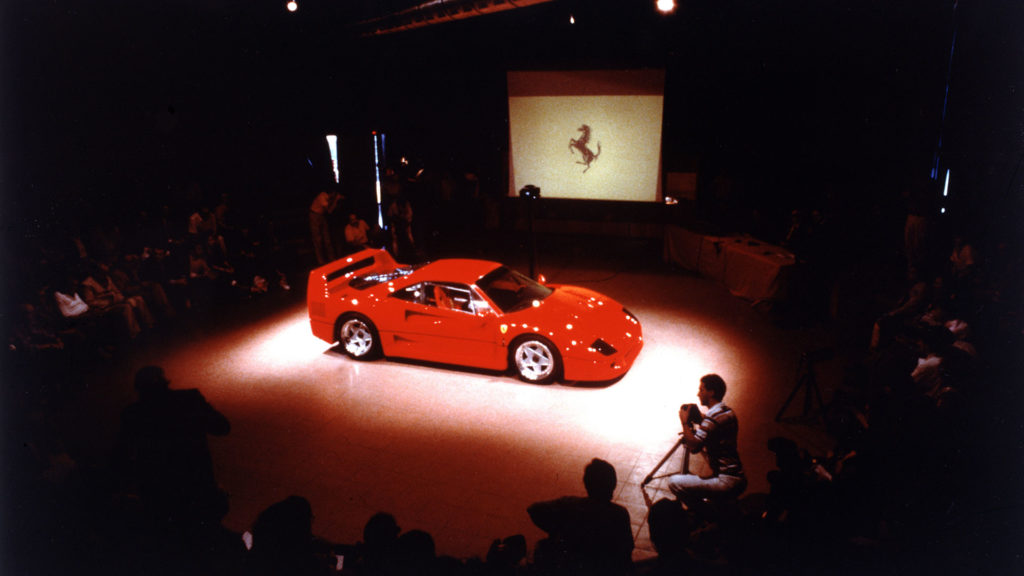 Nei piani iniziali l’auto doveva essere svelata al Motor Show di Francoforte, ma i vertici FIAT posero il veto poiché vi erano timori che un evento di tale portata avrebbe totalmente offuscato l’attenzione per il lancio della nuova Alfa Romeo 164. Visto il successo che avrebbe riscosso poco dopo la Ferrari F40, e quello che continua a rappresentare oggi, si può dire che avessero ragione. E così la presentazione della F40 avvenne in una cornice, forse più intima, il 21 luglio 1987 al Centro Civico di Maranello, in una atmosfera quasi mistica, anche perché di quella macchina non si sapeva nulla prima di allora. Nessuna notizia, nessuna foto, la riservatezza attorno al progetto era assoluta e solo le persone direttamente coinvolte nella progettazione, oltre ai fedelissimi di Enzo, erano al corrente di quello che da lì a poco sarebbe accaduto. Il giorno successivo alla presentazione, a fronte delle 400 unità previste, a Maranello giunsero oltre novecento fax di richiesta. Per cercare di soddisfare nel miglior modo possibile tutte quelle richieste, venne deciso di dare priorità ai già proprietari della 288 GTO, mentre le rimanenti sarebbero state vendute ai clienti più fedeli.