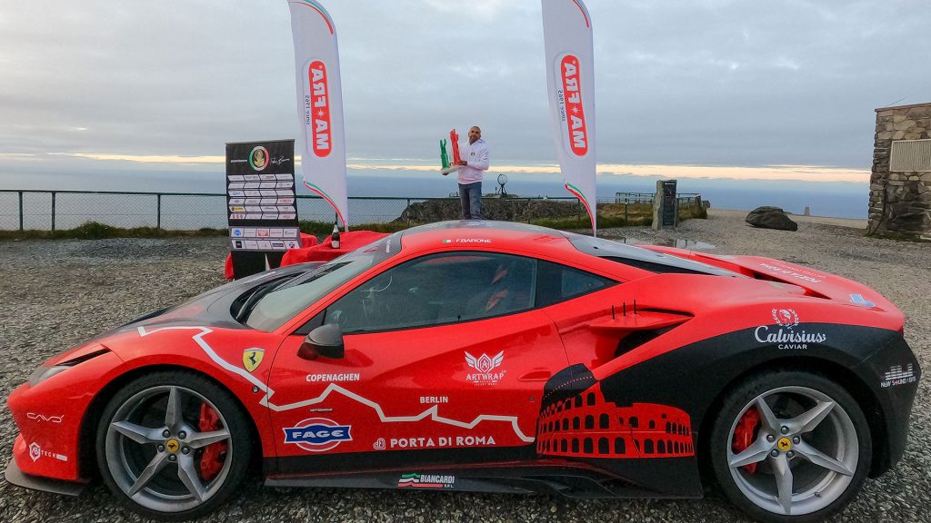 Riescono nella storica impresa (che vi abbiamo documentato live con una diretta Instagram dedicata) di raggiungere Capo Nord, partendo da Roma, in meno di 49 ore Fabio Barone e il suo copilota Alessandro Tedino. L’equipaggio italiano, a bordo di una Ferrari F8 Tributo, partito in data sabato 4 settembre dalla maestosa via dei Fori Imperiali (Roma), ha raggiunto Capo Nord percorrendo oltre 4.400 km di distanza nel tempo ufficiale di 45h 20m 37s.