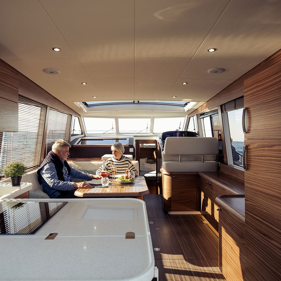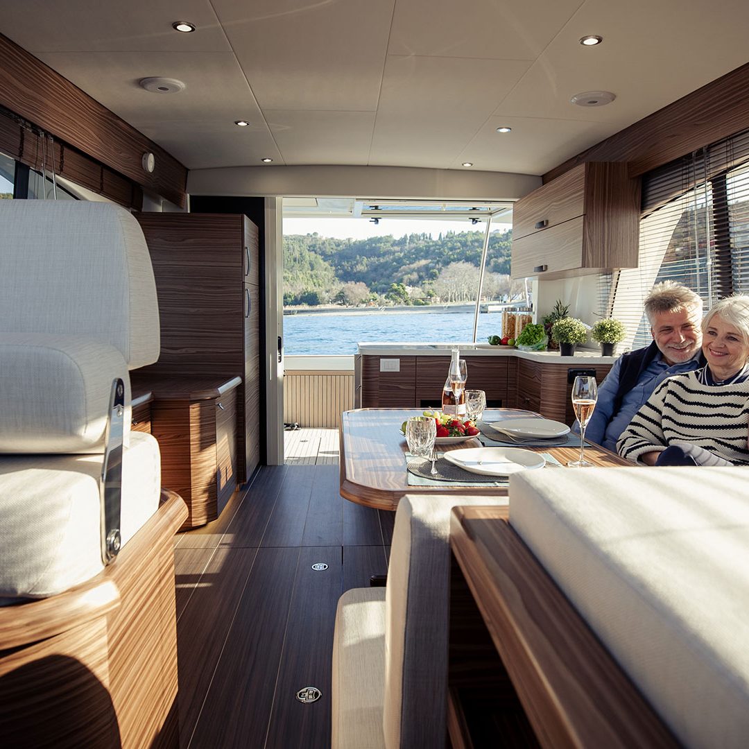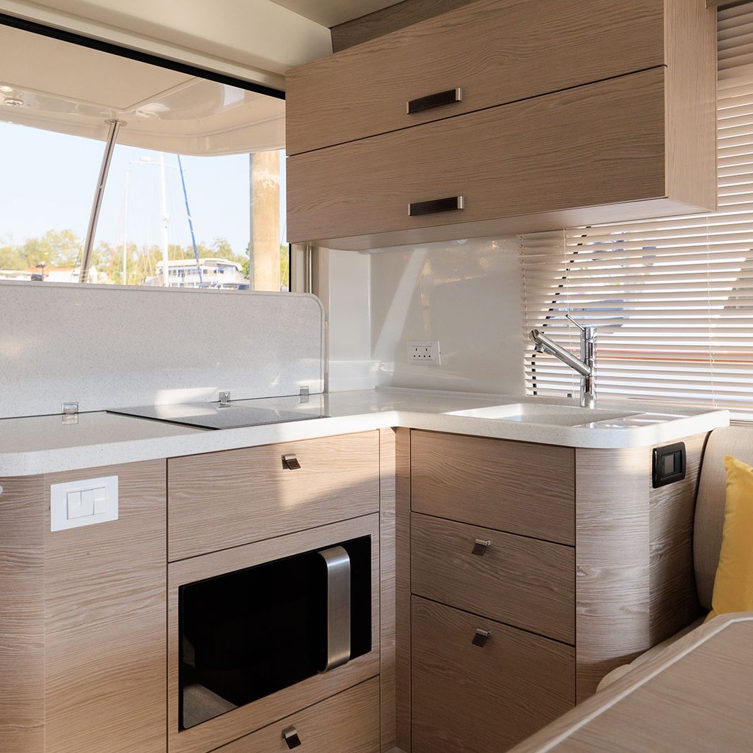 Il layout dello yacht è progettato per offrire tanto funzionalità che interazione sociale. La cucina di poppa è collegata all’area salotto del pozzetto, trasformandola in una estensione dello spazio abitativo interno. La cucina è dotata di un frigorifero/congelatore full-size. All’interno del salone, la vista panoramica a 360˚ inonda lo spazio di luce naturale. A quanto elencato si aggiunge una porta laterale del navigatore.