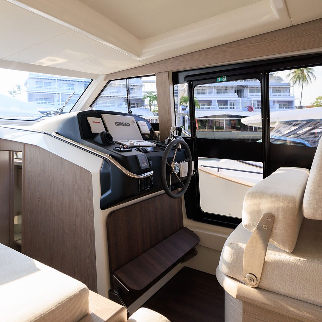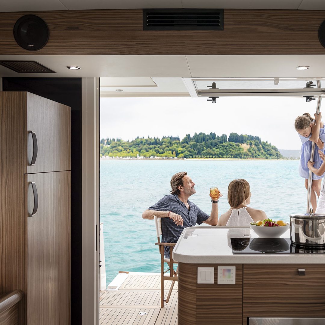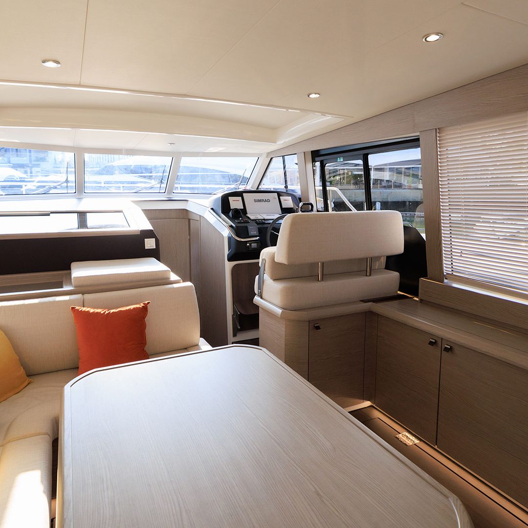 Il layout dello yacht è progettato per offrire tanto funzionalità che interazione sociale. La cucina di poppa è collegata all’area salotto del pozzetto, trasformandola in una estensione dello spazio abitativo interno. La cucina è dotata di un frigorifero/congelatore full-size. All’interno del salone, la vista panoramica a 360˚ inonda lo spazio di luce naturale. A quanto elencato si aggiunge una porta laterale del navigatore.