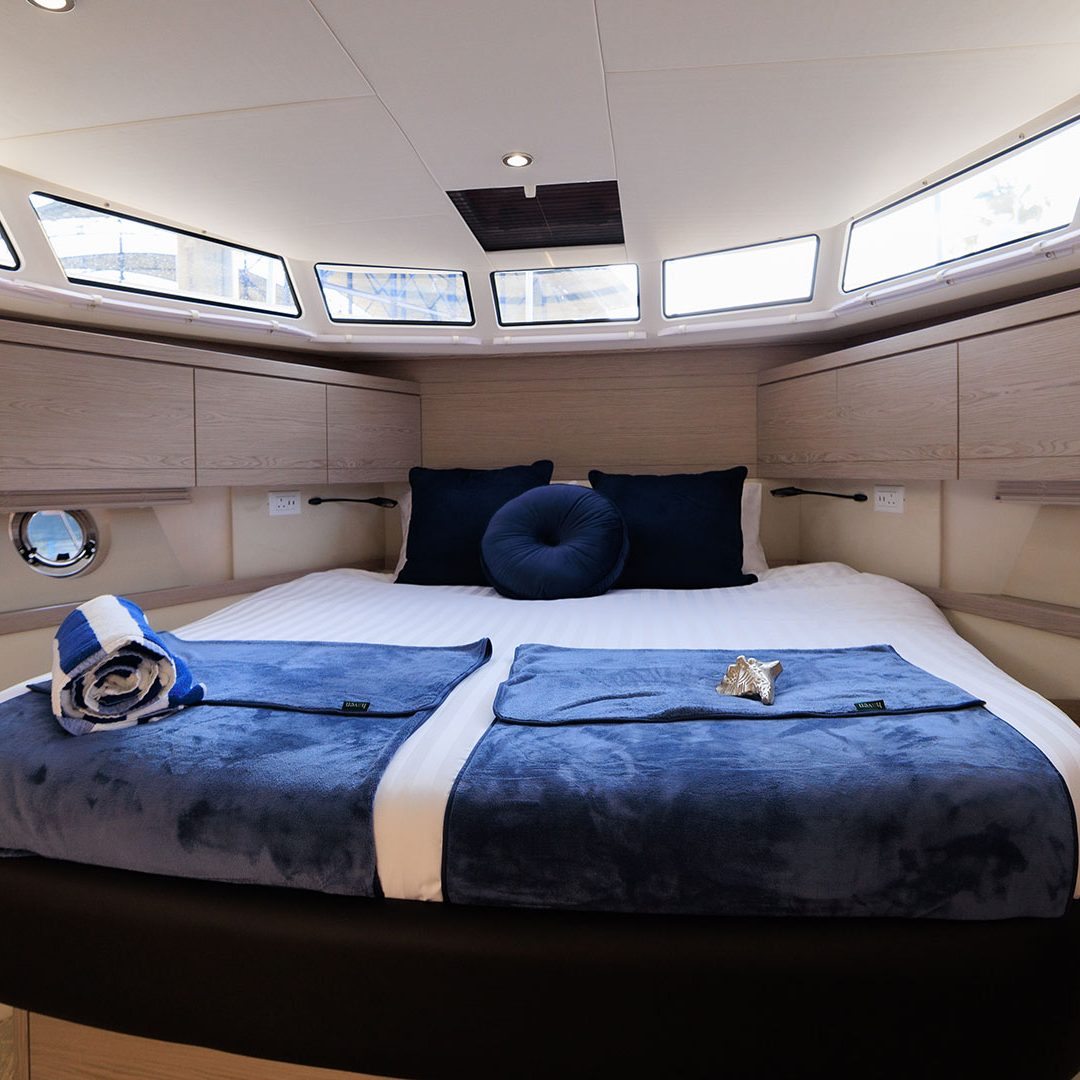 Sottocoperta, il Greenline 40 dispone gli alloggi per gli ospiti, tra cui una cabina armatoriale e una cabina ospiti ben arredata. Gli interni mettono in mostra mobili in legno a grana fine, con opzioni per finiture personalizzate in noce, teak o rovere argentato. Questi materiali di prima qualità contribuiscono a creare un ambiente caldo e invitante.