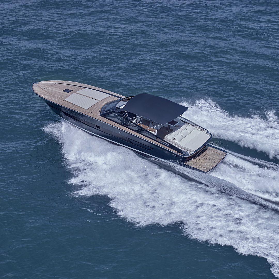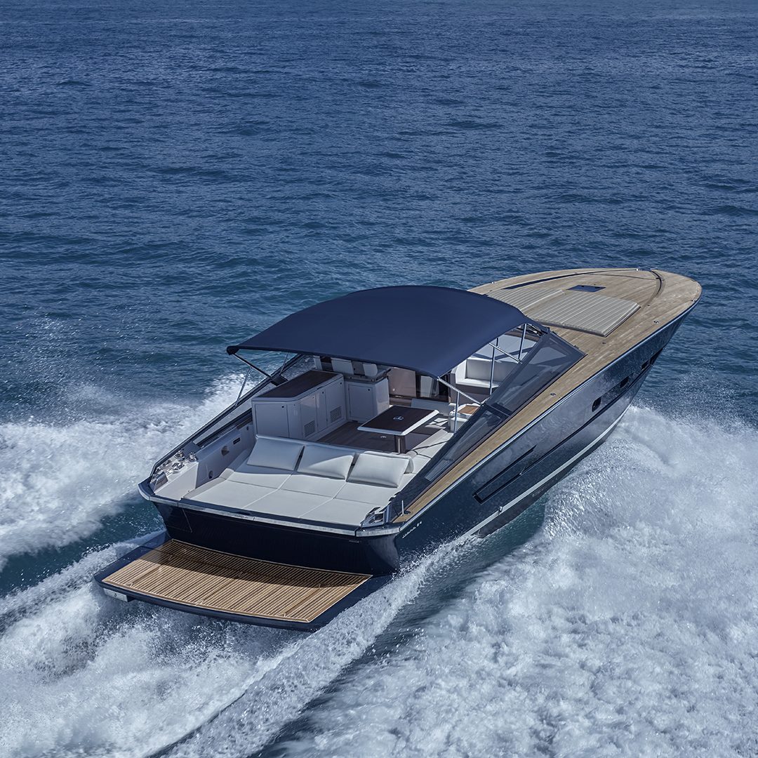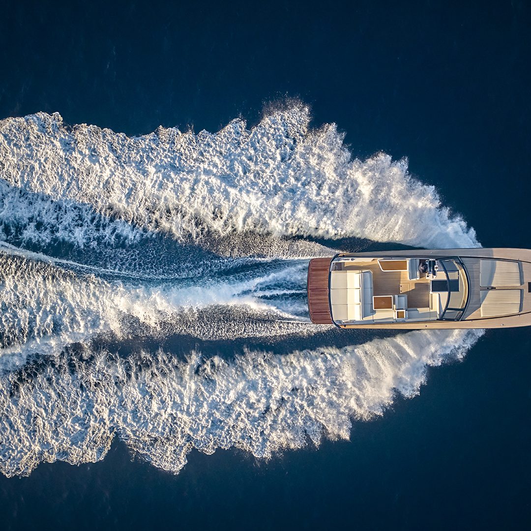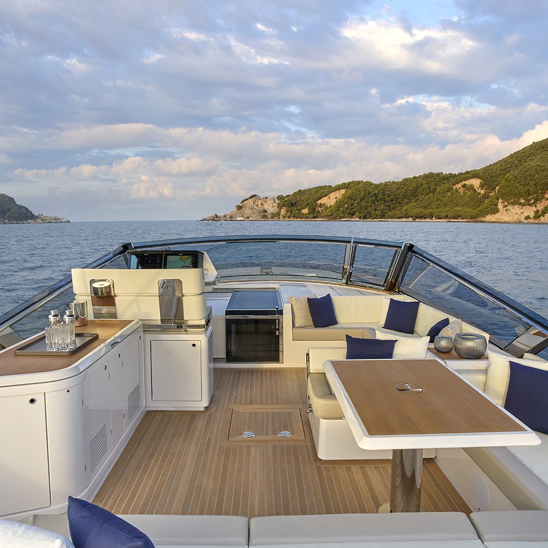 Il main deck presenta un layout ottimizzato, con un’area poppiera occupata quasi interamente da un ampio prendisole, affiancato sul lato sinistro da un passaggio per l’accesso a bordo. Al di sotto del prendisole troviamo un vano da 1.800 litri pensato per lo stivaggio dei water toys. Grande novità il layout a doppio pozzetto dell’area living esterna, che presenta due zone interamente dedicate al relax. I due divani a C, collegati da una panca trasversale che può essere dotata schienale basculante, si trasformano in due salotti esterni adiacenti, capaci di accogliere oltre 10 persone, mentre il pozzetto a poppa è completato da un tavolo. Il secondo pozzetto, situato a ridosso del parabrezza, offre agli ospiti una zona protetta dal vento e dall’acqua durante la navigazione. A corredo troviamo una ghiacciaia posizionata tra i due divani, mentre sul lato di sinistra trova invece spazio un mobile bar dotato di lavello attrezzabile con frigorifero, icemaker e piastra cottura (optional). E ad ombreggiare le aree living troviamo un tendalino fisso e smontabile. Sempre sul lato di sinistra si trova la plancia di comando, con una seduta in grado di ospitare due persone e un cruscotto flottante dotato di sistema di navigazione Simrad gestibile attraverso due display touch chartplotter da 12’’, estendibili a 16’’ nella versione optional. Inoltre la postazione di guida è dotata di portabicchieri e di vano porta oggetti integrati. L’accesso all’area di prua è collocato sulla porzione di dritta del parabrezza: una soluzione che consente di mantenere libero il parabrezza centrale e che promette di rendere più agevole il passaggio verso la zona prodiera conservando il tambuccio aperto, consentendo così anche l’accesso centrale verso sottocoperta. Il parabrezza invece presenta inoltre un vetro a tutta altezza. A prua troviamo invece un prendisole dotato di vano porta oggetti e porta bicchieri ed incassato nella coperta.