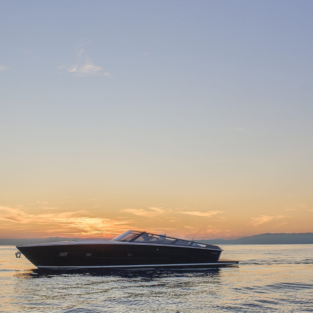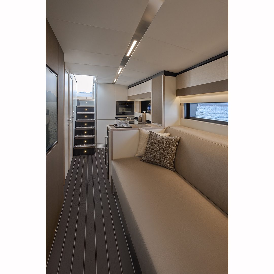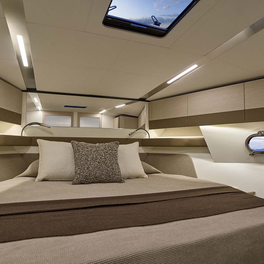 Scendendo lungo i gradini che conducono al lower deck ci si immerge in un ambiente in cui trovano spazio una cucina attrezzata, una dinette, due cabine e due bagni. A centro barca, sul lato di sinistra, si sviluppa la zona cucina, in cui sono presenti un lavello, una piastra a induzione e un frigorifero a tutta altezza. Su richiesta sono inoltre disponibili un forno e una lavastoviglie. Adiacente alla cucina troviamo la dinette (che offre spazio per relax e per pasteggiare e che consente l’ingresso di luce naturale grazie ad una vetrata laterale), composta da un divano abbinato a un tavolo pieghevole e stivabile (quest’ultimo opzionale), mentre sulla parete frontale può essere incassato un televisore da 55’’. Sul lato di dritta, sempre a centro barca, si trova la cabina ospiti, disponibile in due configurazioni: con un letto alla francese oppure con letti a castello. La cabina è servita da un bagno en-suite, che all’occorrenza può fungere anche da dayhead per gli ospiti grazie al secondo accesso dal disimpegno. A prua si apre la cabina armatoriale, illuminata e arieggiata dai due oblò laterali e da un osteriggio. Il letto matrimoniale, posizionato centralmente, è dotato di due cassettoni alla base per lo stivaggio, mentre ai lati trovano posto due armadi. Sul lato di dritta si accede invece al bagno armatoriale privato. L’ambiente interno mette in mostra legno, pelle e tessuto. Si è inoltre puntato su due elementi stilistici lineari che seguono la lunghezza dell’imbarcazione dalla cucina fino alla cabina armatoriale: le ante dei mobili a parete sono caratterizzate da un profilo decorativo in pelle, mentre il cielino bianco presenta una fascia in laminato metallizzato che ingloba i faretti.