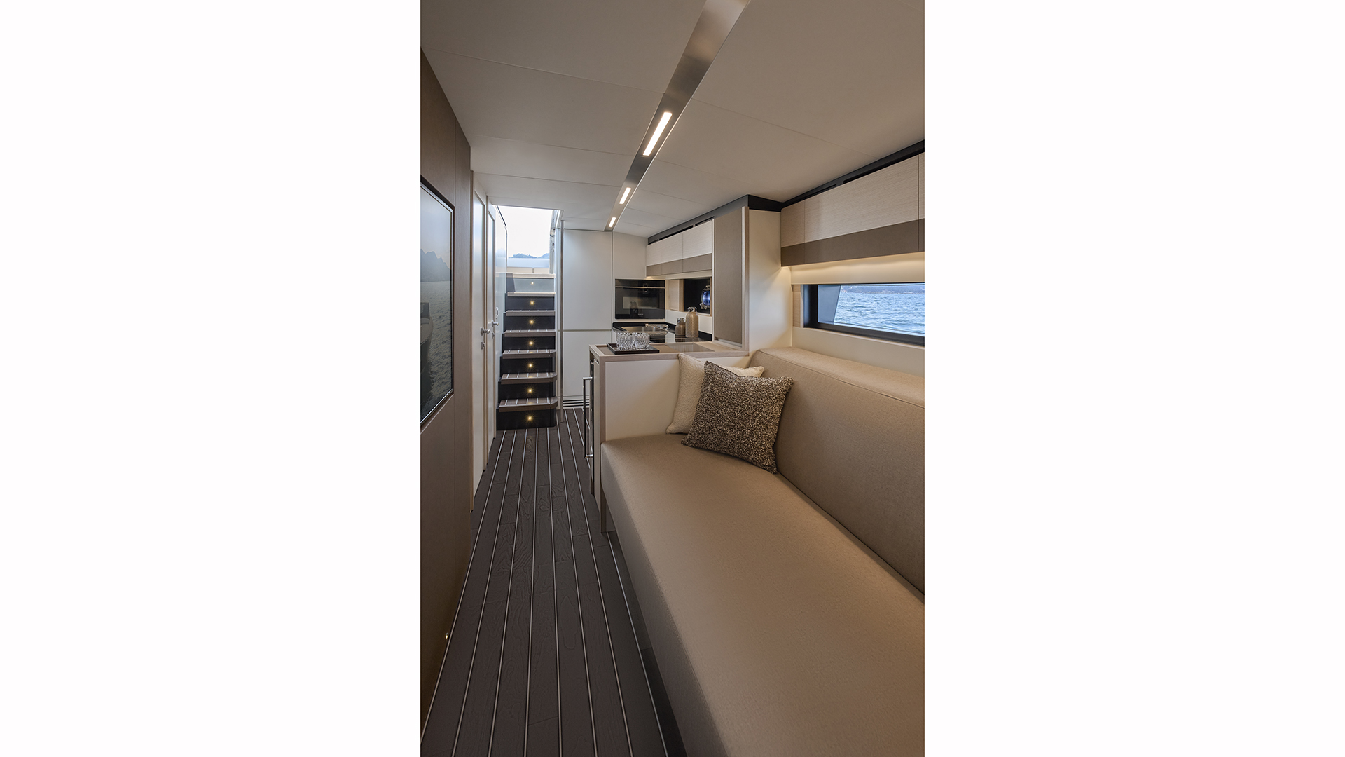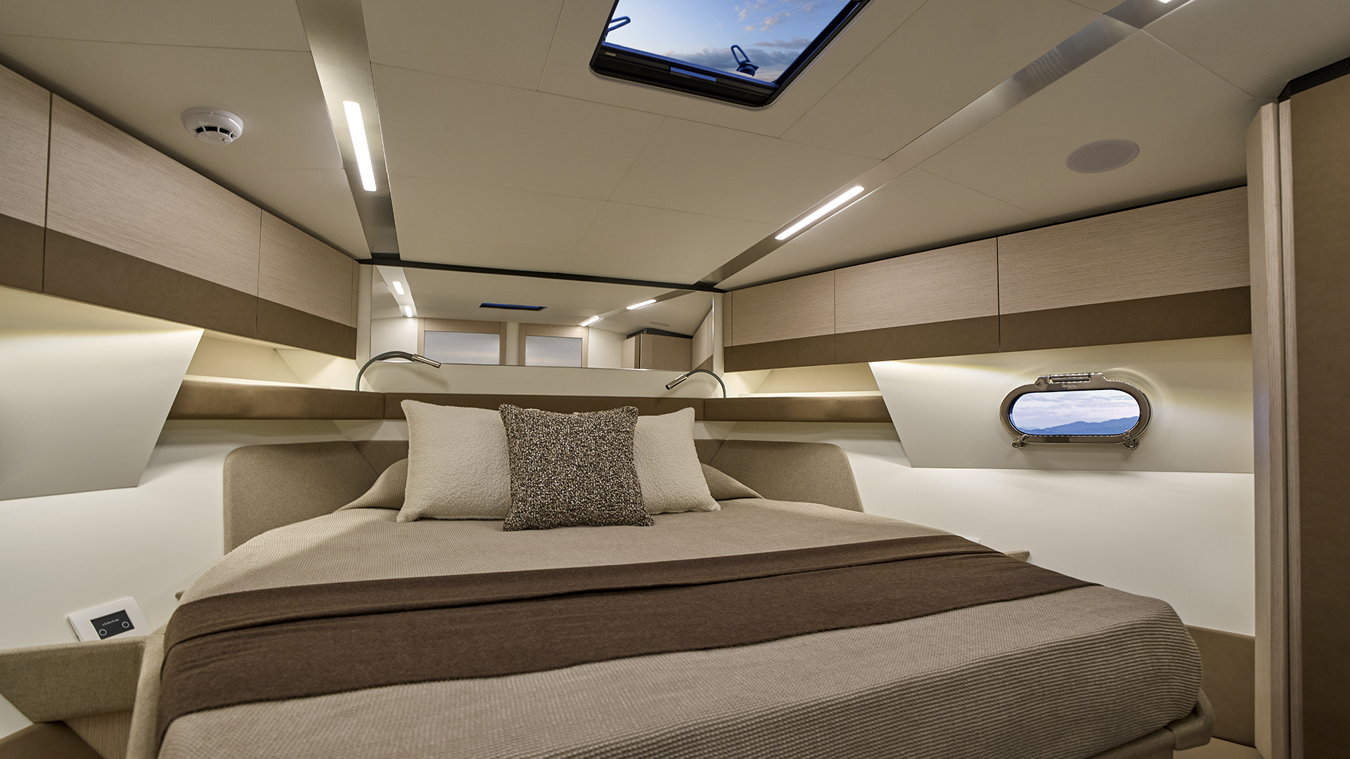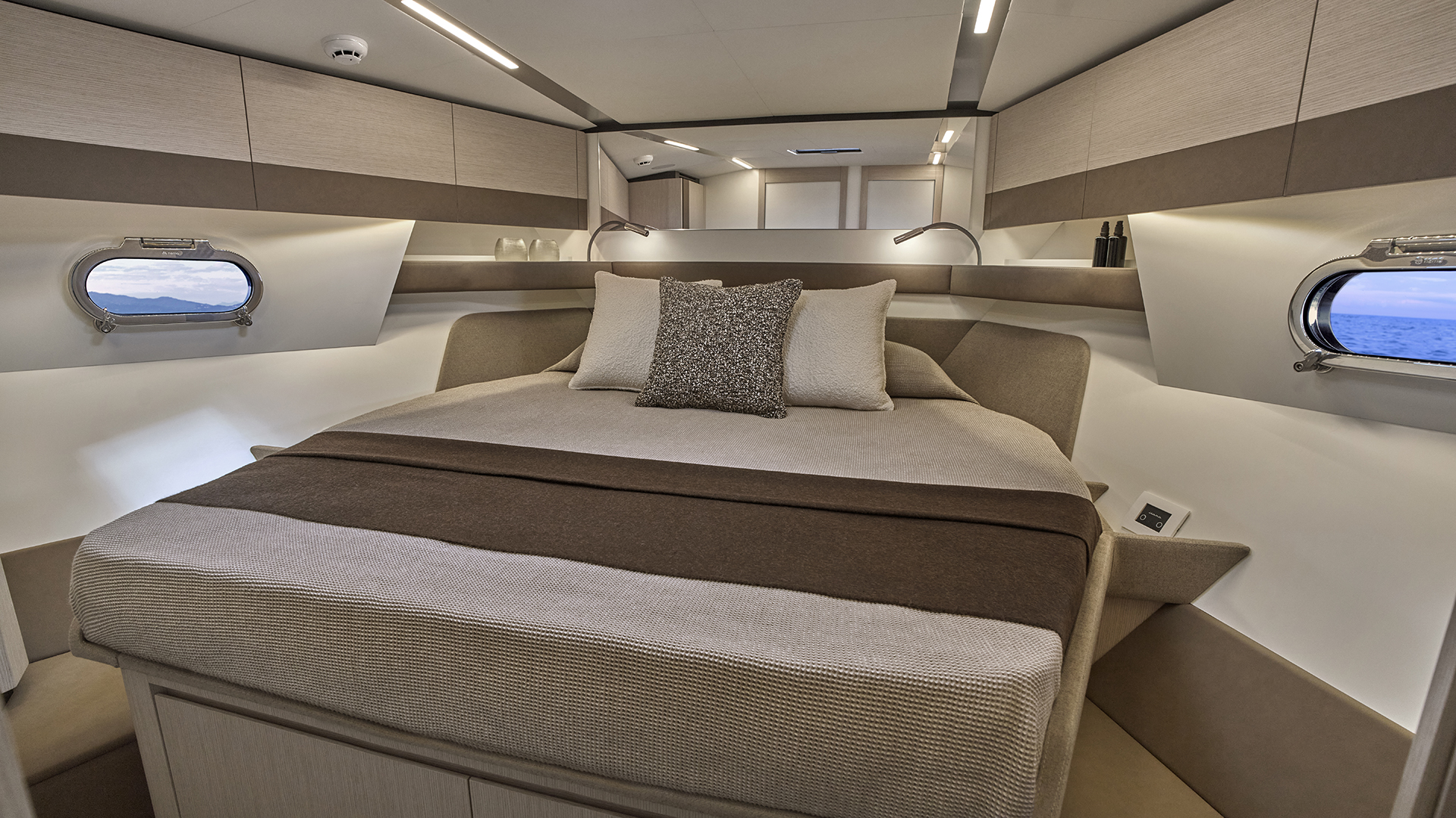 Scendendo lungo i gradini che conducono al lower deck ci si immerge in un ambiente in cui trovano spazio una cucina attrezzata, una dinette, due cabine e due bagni. A centro barca, sul lato di sinistra, si sviluppa la zona cucina, in cui sono presenti un lavello, una piastra a induzione e un frigorifero a tutta altezza. Su richiesta sono inoltre disponibili un forno e una lavastoviglie. Adiacente alla cucina troviamo la dinette (che offre spazio per relax e per pasteggiare e che consente l’ingresso di luce naturale grazie ad una vetrata laterale), composta da un divano abbinato a un tavolo pieghevole e stivabile (quest’ultimo opzionale), mentre sulla parete frontale può essere incassato un televisore da 55’’. Sul lato di dritta, sempre a centro barca, si trova la cabina ospiti, disponibile in due configurazioni: con un letto alla francese oppure con letti a castello. La cabina è servita da un bagno en-suite, che all’occorrenza può fungere anche da dayhead per gli ospiti grazie al secondo accesso dal disimpegno. A prua si apre la cabina armatoriale, illuminata e arieggiata dai due oblò laterali e da un osteriggio. Il letto matrimoniale, posizionato centralmente, è dotato di due cassettoni alla base per lo stivaggio, mentre ai lati trovano posto due armadi. Sul lato di dritta si accede invece al bagno armatoriale privato. L’ambiente interno mette in mostra legno, pelle e tessuto. Si è inoltre puntato su due elementi stilistici lineari che seguono la lunghezza dell’imbarcazione dalla cucina fino alla cabina armatoriale: le ante dei mobili a parete sono caratterizzate da un profilo decorativo in pelle, mentre il cielino bianco presenta una fascia in laminato metallizzato che ingloba i faretti.