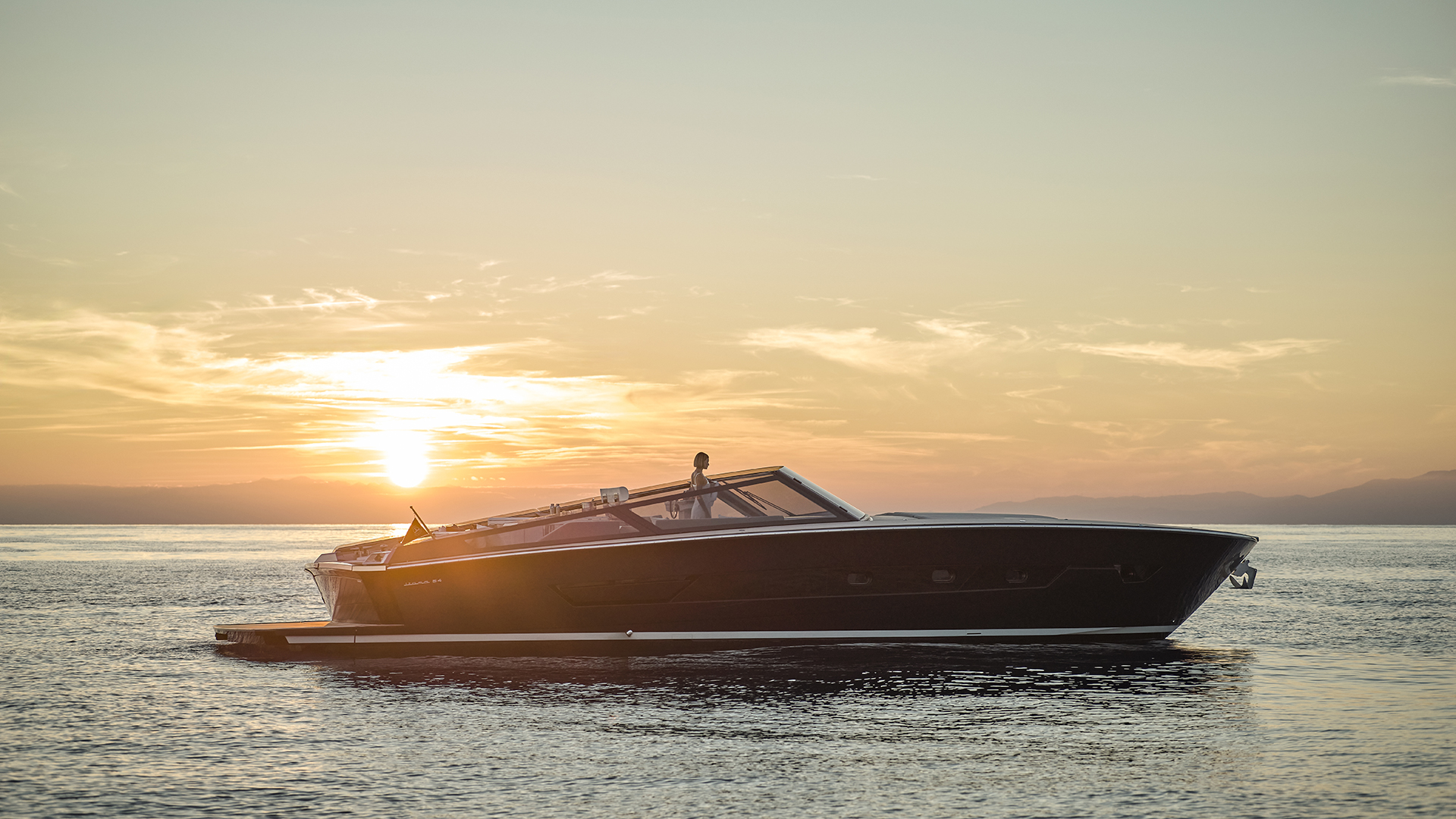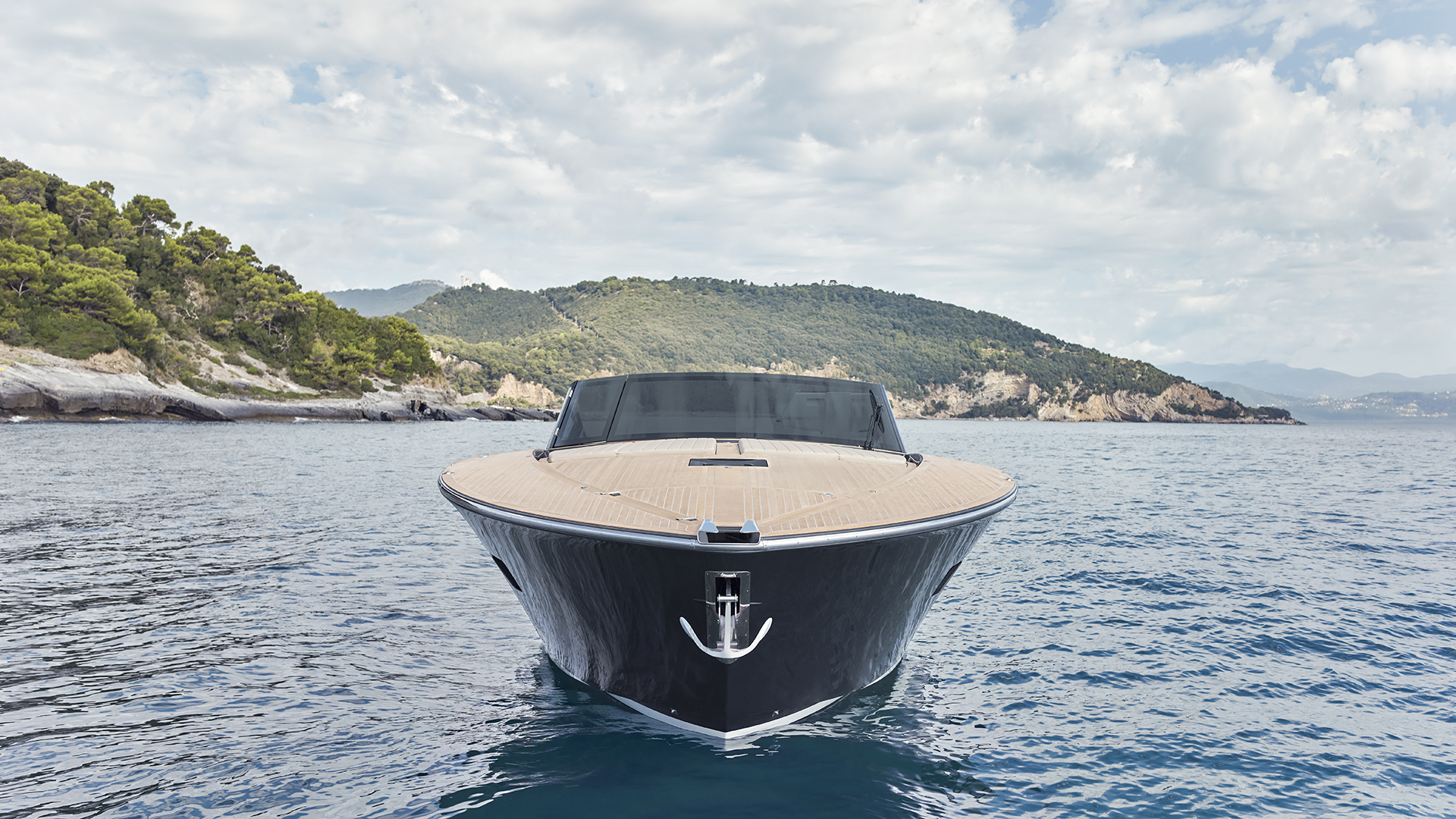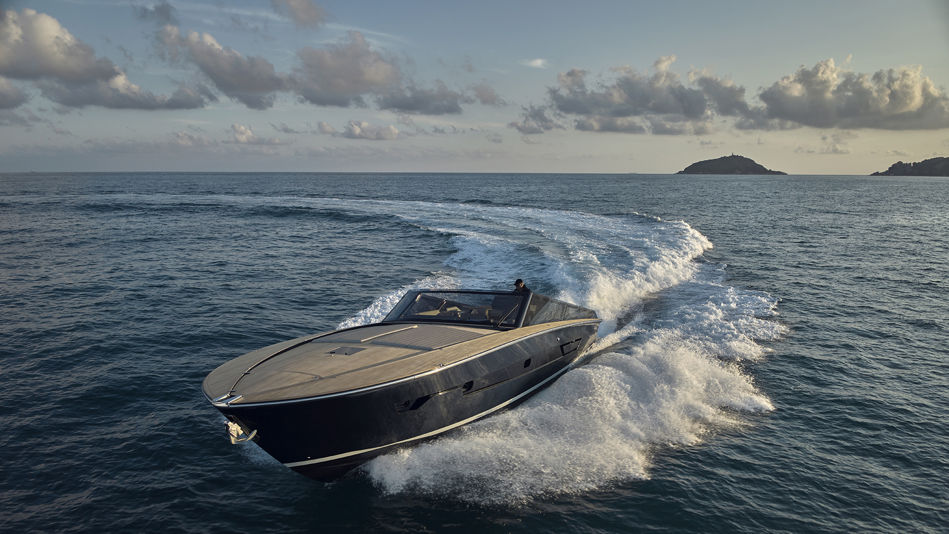 Scendendo lungo i gradini che conducono al lower deck ci si immerge in un ambiente in cui trovano spazio una cucina attrezzata, una dinette, due cabine e due bagni. A centro barca, sul lato di sinistra, si sviluppa la zona cucina, in cui sono presenti un lavello, una piastra a induzione e un frigorifero a tutta altezza. Su richiesta sono inoltre disponibili un forno e una lavastoviglie. Adiacente alla cucina troviamo la dinette (che offre spazio per relax e per pasteggiare e che consente l’ingresso di luce naturale grazie ad una vetrata laterale), composta da un divano abbinato a un tavolo pieghevole e stivabile (quest’ultimo opzionale), mentre sulla parete frontale può essere incassato un televisore da 55’’. Sul lato di dritta, sempre a centro barca, si trova la cabina ospiti, disponibile in due configurazioni: con un letto alla francese oppure con letti a castello. La cabina è servita da un bagno en-suite, che all’occorrenza può fungere anche da dayhead per gli ospiti grazie al secondo accesso dal disimpegno. A prua si apre la cabina armatoriale, illuminata e arieggiata dai due oblò laterali e da un osteriggio. Il letto matrimoniale, posizionato centralmente, è dotato di due cassettoni alla base per lo stivaggio, mentre ai lati trovano posto due armadi. Sul lato di dritta si accede invece al bagno armatoriale privato. L’ambiente interno mette in mostra legno, pelle e tessuto. Si è inoltre puntato su due elementi stilistici lineari che seguono la lunghezza dell’imbarcazione dalla cucina fino alla cabina armatoriale: le ante dei mobili a parete sono caratterizzate da un profilo decorativo in pelle, mentre il cielino bianco presenta una fascia in laminato metallizzato che ingloba i faretti.