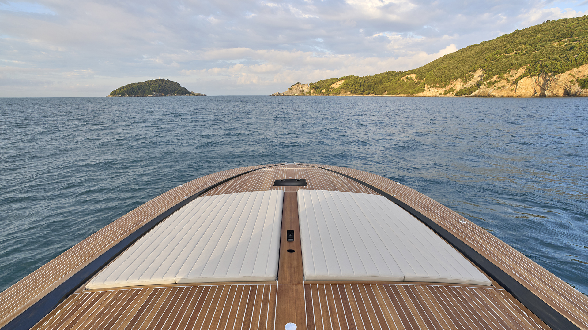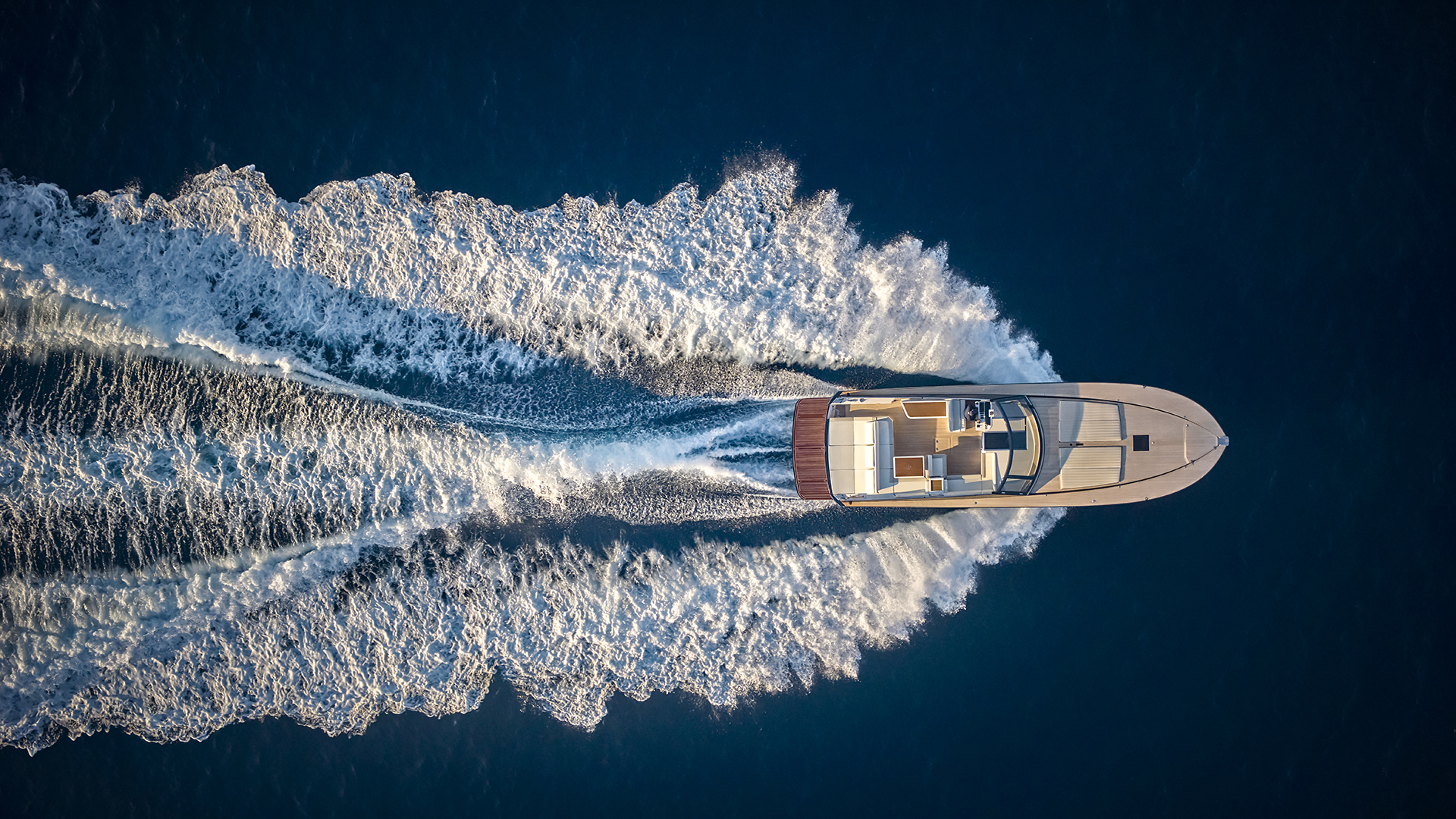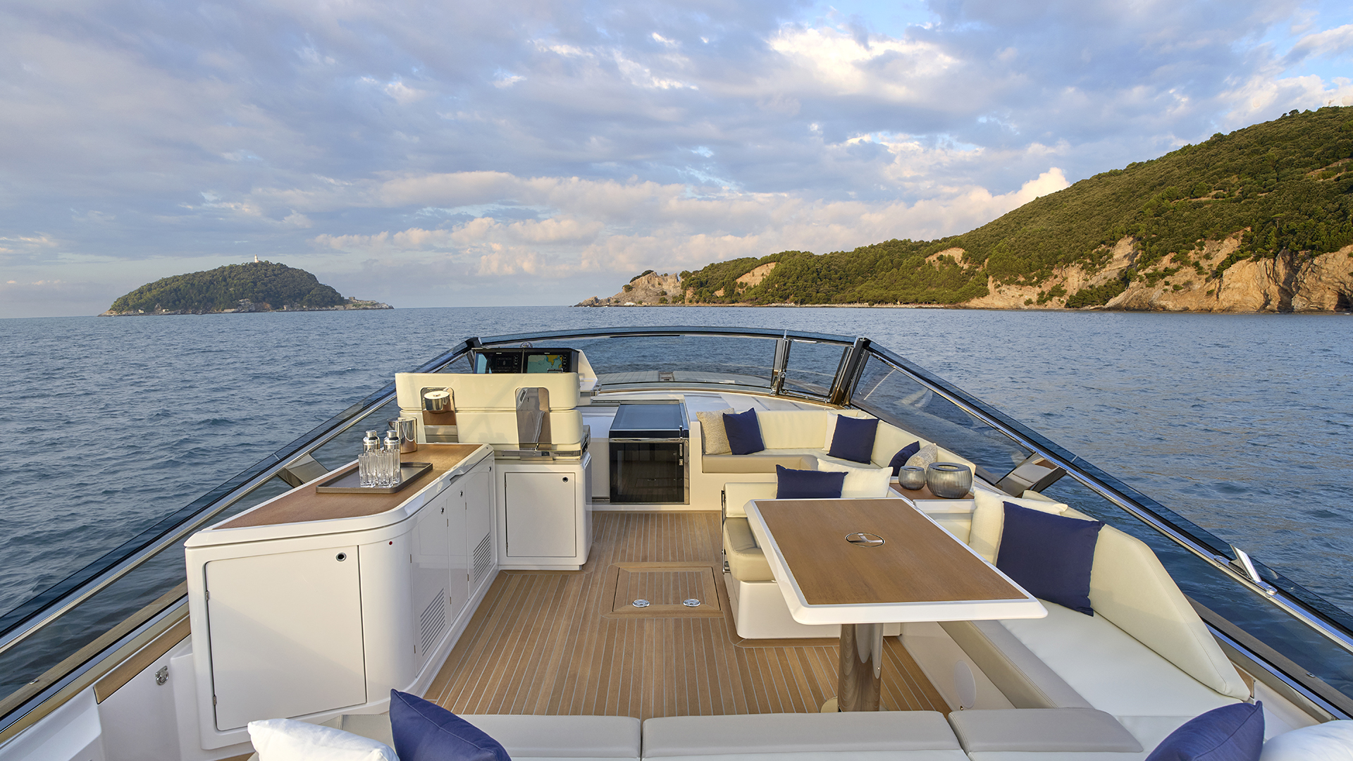 Il main deck presenta un layout ottimizzato, con un’area poppiera occupata quasi interamente da un ampio prendisole, affiancato sul lato sinistro da un passaggio per l’accesso a bordo. Al di sotto del prendisole troviamo un vano da 1.800 litri pensato per lo stivaggio dei water toys. Grande novità il layout a doppio pozzetto dell’area living esterna, che presenta due zone interamente dedicate al relax. I due divani a C, collegati da una panca trasversale che può essere dotata schienale basculante, si trasformano in due salotti esterni adiacenti, capaci di accogliere oltre 10 persone, mentre il pozzetto a poppa è completato da un tavolo. Il secondo pozzetto, situato a ridosso del parabrezza, offre agli ospiti una zona protetta dal vento e dall’acqua durante la navigazione. A corredo troviamo una ghiacciaia posizionata tra i due divani, mentre sul lato di sinistra trova invece spazio un mobile bar dotato di lavello attrezzabile con frigorifero, icemaker e piastra cottura (optional). E ad ombreggiare le aree living troviamo un tendalino fisso e smontabile. Sempre sul lato di sinistra si trova la plancia di comando, con una seduta in grado di ospitare due persone e un cruscotto flottante dotato di sistema di navigazione Simrad gestibile attraverso due display touch chartplotter da 12’’, estendibili a 16’’ nella versione optional. Inoltre la postazione di guida è dotata di portabicchieri e di vano porta oggetti integrati. L’accesso all’area di prua è collocato sulla porzione di dritta del parabrezza: una soluzione che consente di mantenere libero il parabrezza centrale e che promette di rendere più agevole il passaggio verso la zona prodiera conservando il tambuccio aperto, consentendo così anche l’accesso centrale verso sottocoperta. Il parabrezza invece presenta inoltre un vetro a tutta altezza. A prua troviamo invece un prendisole dotato di vano porta oggetti e porta bicchieri ed incassato nella coperta.