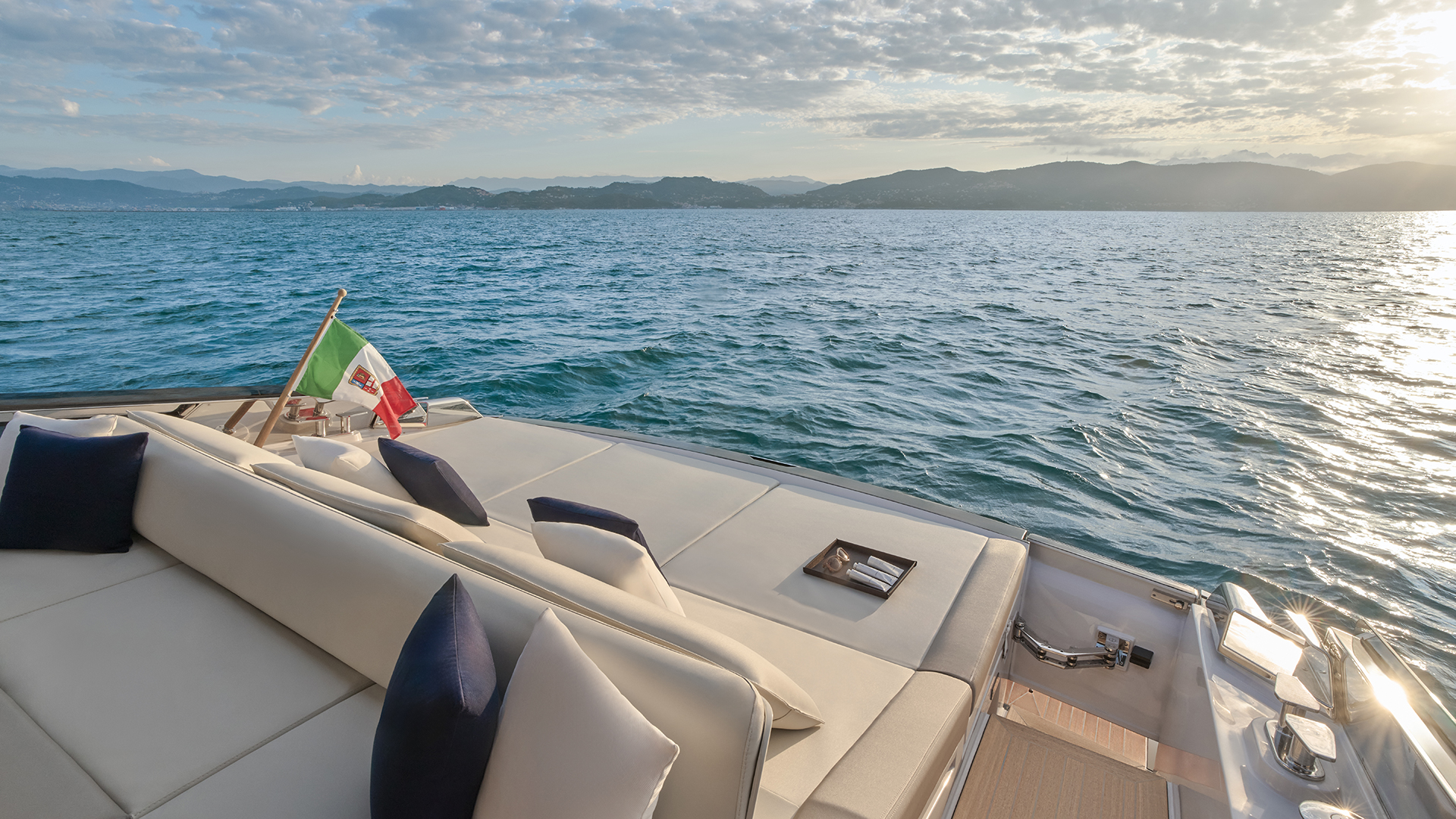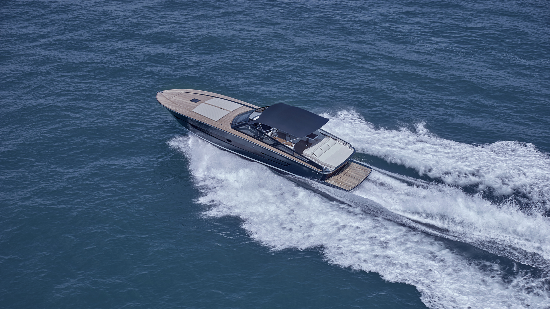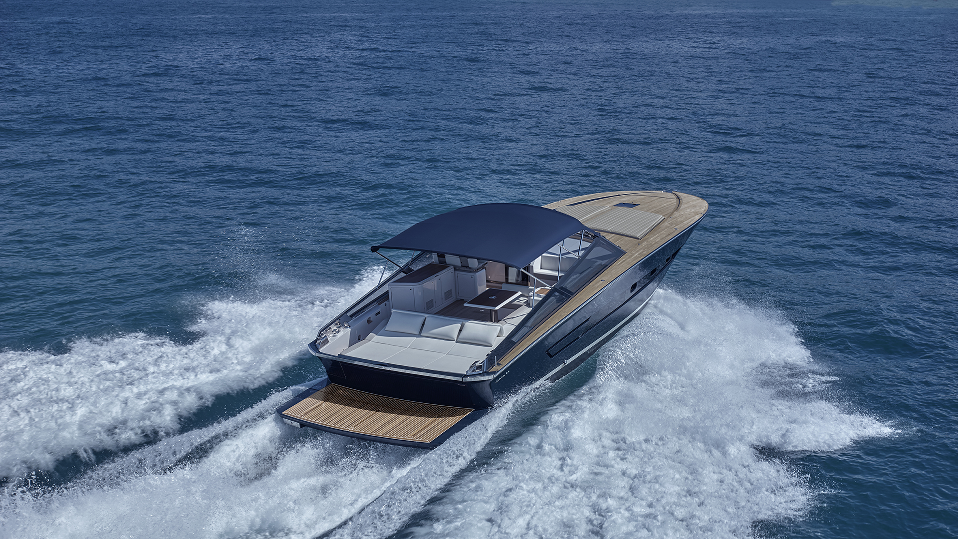 Il main deck presenta un layout ottimizzato, con un’area poppiera occupata quasi interamente da un ampio prendisole, affiancato sul lato sinistro da un passaggio per l’accesso a bordo. Al di sotto del prendisole troviamo un vano da 1.800 litri pensato per lo stivaggio dei water toys. Grande novità il layout a doppio pozzetto dell’area living esterna, che presenta due zone interamente dedicate al relax. I due divani a C, collegati da una panca trasversale che può essere dotata schienale basculante, si trasformano in due salotti esterni adiacenti, capaci di accogliere oltre 10 persone, mentre il pozzetto a poppa è completato da un tavolo. Il secondo pozzetto, situato a ridosso del parabrezza, offre agli ospiti una zona protetta dal vento e dall’acqua durante la navigazione. A corredo troviamo una ghiacciaia posizionata tra i due divani, mentre sul lato di sinistra trova invece spazio un mobile bar dotato di lavello attrezzabile con frigorifero, icemaker e piastra cottura (optional). E ad ombreggiare le aree living troviamo un tendalino fisso e smontabile. Sempre sul lato di sinistra si trova la plancia di comando, con una seduta in grado di ospitare due persone e un cruscotto flottante dotato di sistema di navigazione Simrad gestibile attraverso due display touch chartplotter da 12’’, estendibili a 16’’ nella versione optional. Inoltre la postazione di guida è dotata di portabicchieri e di vano porta oggetti integrati. L’accesso all’area di prua è collocato sulla porzione di dritta del parabrezza: una soluzione che consente di mantenere libero il parabrezza centrale e che promette di rendere più agevole il passaggio verso la zona prodiera conservando il tambuccio aperto, consentendo così anche l’accesso centrale verso sottocoperta. Il parabrezza invece presenta inoltre un vetro a tutta altezza. A prua troviamo invece un prendisole dotato di vano porta oggetti e porta bicchieri ed incassato nella coperta.
