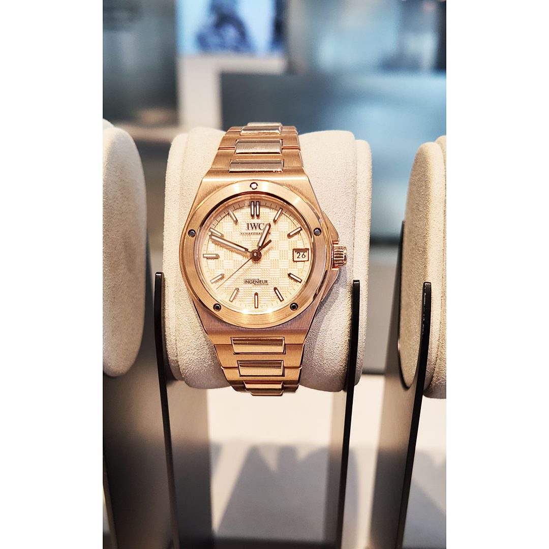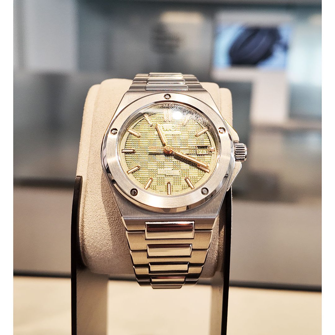 L’Ingenieur Automatic 40 (Rif. IW328702) è realizzato interamente in oro 5N 18 carati. La cassa (da 40 mm di diametro), l’anello del fondello, la lunetta, la protezione della corona, la corona e le maglie del bracciale sono tutti realizzati in oro. Il bracciale integrato si fissa alla cassa tramite le sue maglie centrali. La lunetta è tenuta in posizione da cinque viti funzionali. Un’altra caratteristica dell’orologio è il quadrante nero con una struttura “Grid”. È costituito da piccole linee e quadrati, che aggiungono consistenza e profondità al quadrante nero. Le applicazioni sono realizzate in oro massiccio 5N e incastonate singolarmente a mano. Sia le applicazioni che le lancette placcate in oro sono riempite di Super-LumiNova. Questo segnatempo presenta una finitura che combina superfici satinate e lucide. La lunetta è satinata con i bordi esterni lucidati, mentre l’anello del fondello è lucido. Sia le maglie a H che le maglie centrali del bracciale integrato sono satinate.