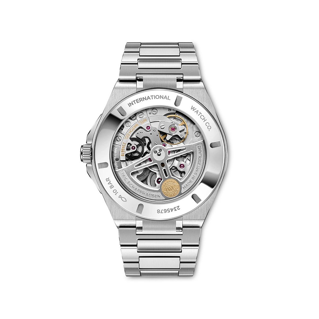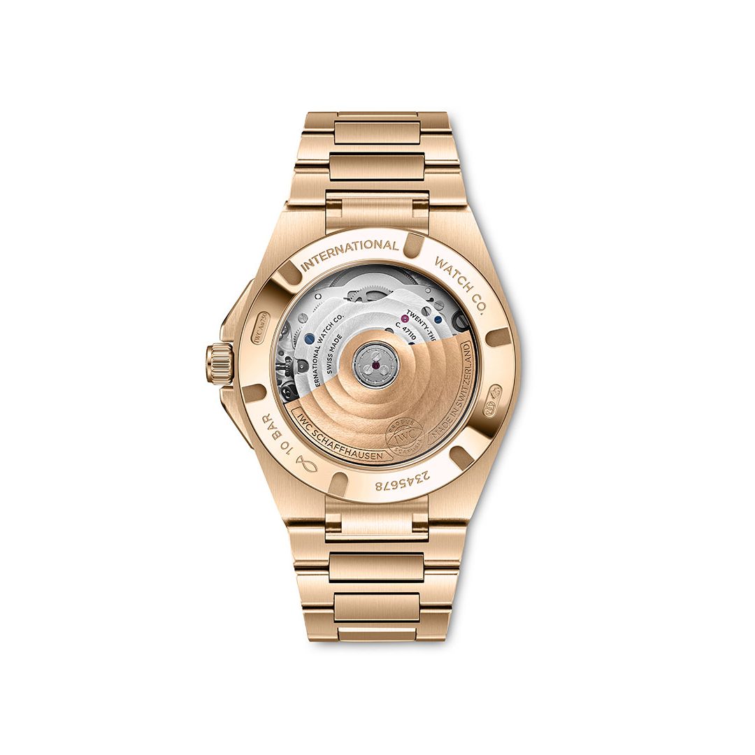 L’Ingenieur Automatic 40 in oro 18 carati 5N è dotato di un fondello in vetro zaffiro che mostra il calibro 32111 con sistema di carica a doppio cricchetto e da 120 ore di riserva di carica. Il movimento è rifinito con viti azzurrate e una massa oscillante placcata in oro.