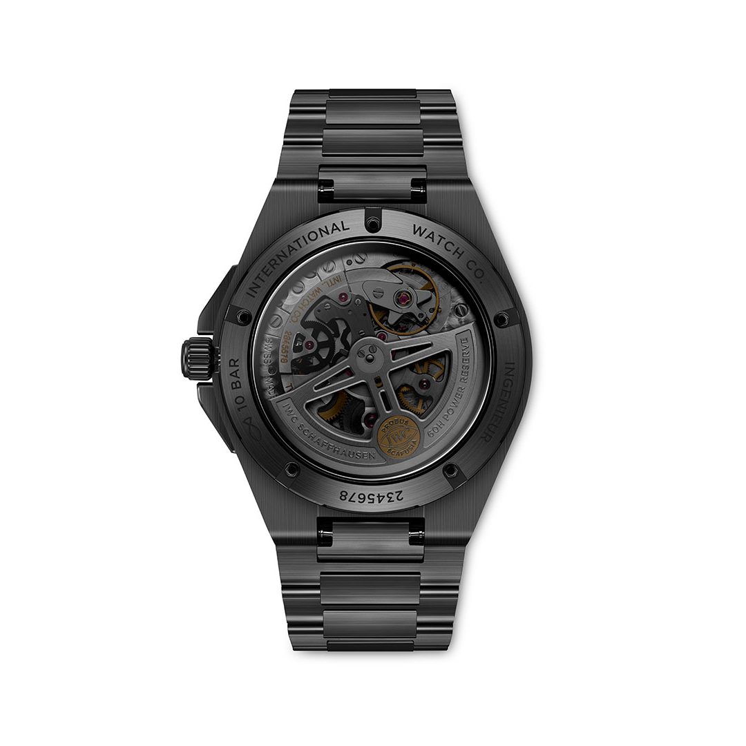 L’Ingenieur Automatic 42 è alimentato dal calibro 82110. Il suo sistema di carica Pellaton converte i movimenti della massa oscillante in entrambe le direzioni in energia per la molla principale, creando una riserva di carica di 60 ore. I componenti del sistema di carica sottoposti a sollecitazioni elevate sono realizzati in ceramica di ossido di zirconio praticamente esente da usura. La ruota automatica e i clic sono realizzati in ceramica nera, mentre il cuscinetto del rotore è in ceramica bianca. Il bilanciere oscilla a una frequenza di 4 Hertz. Il movimento è visibile attraverso il fondello in vetro zaffiro colorato, che completa il design completamente nero dell’orologio.
