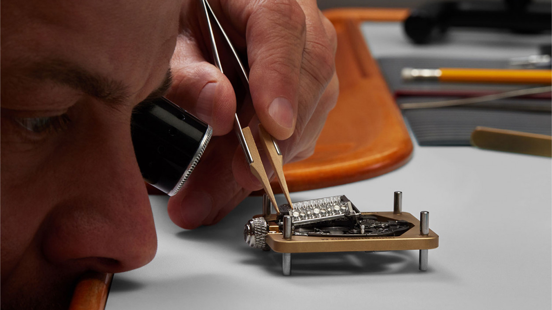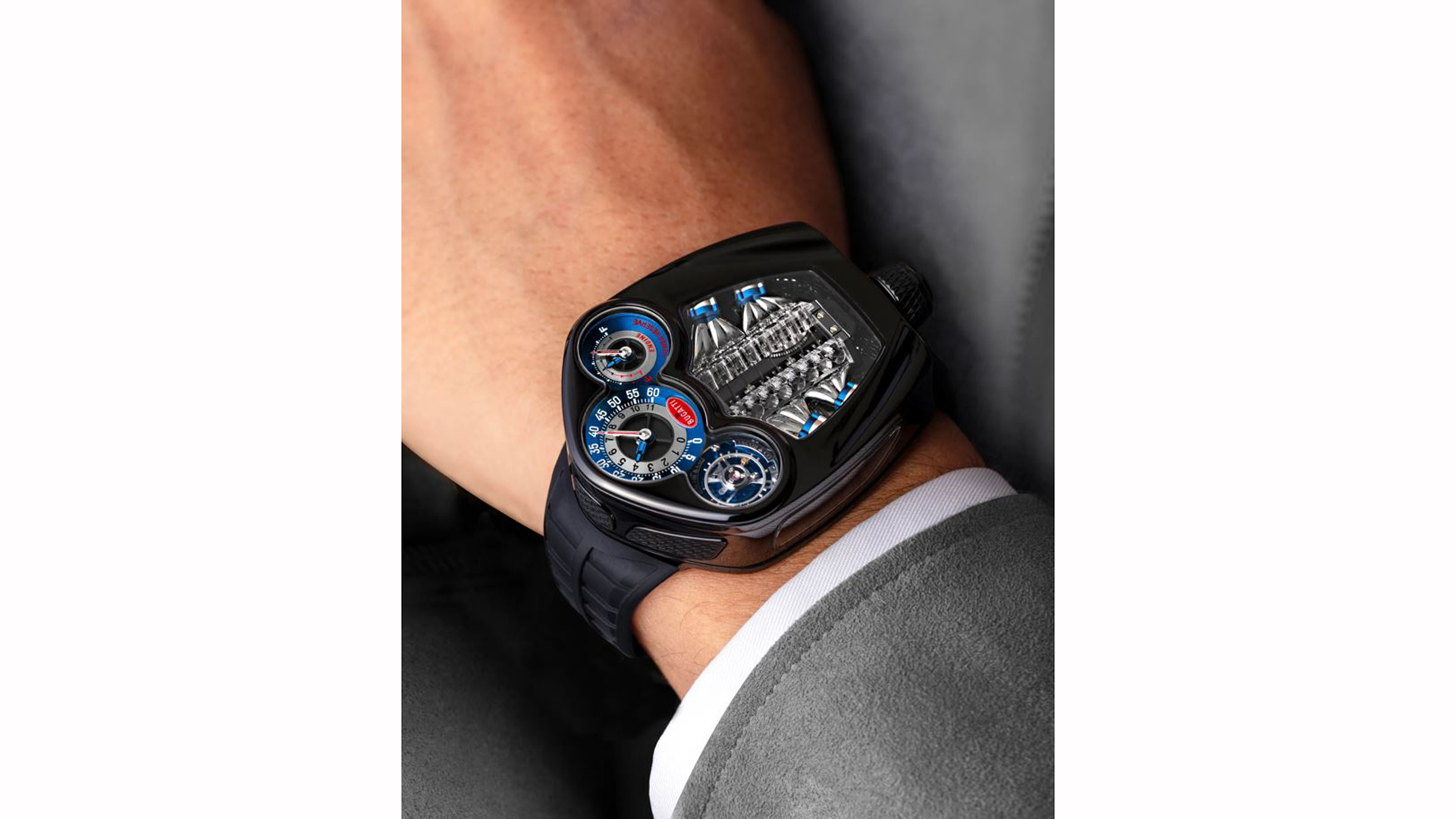 Il V16 in miniatura è ricavato da un unico blocco di zaffiro nel quale sono forati 16 cilindri per ospitare altrettanti pistoni in titanio. Questi sono azionati da un albero motore ad asse singolo. Proprio come sul motore Bugatti, il blocco motore ha il proprio set di collettori di scarico. Premendo il pulsante integrato nella corona si avvia l’animazione. Il motore prende vita: l’albero motore gira e i pistoni pompano su e giù.