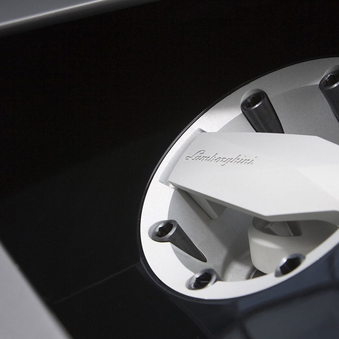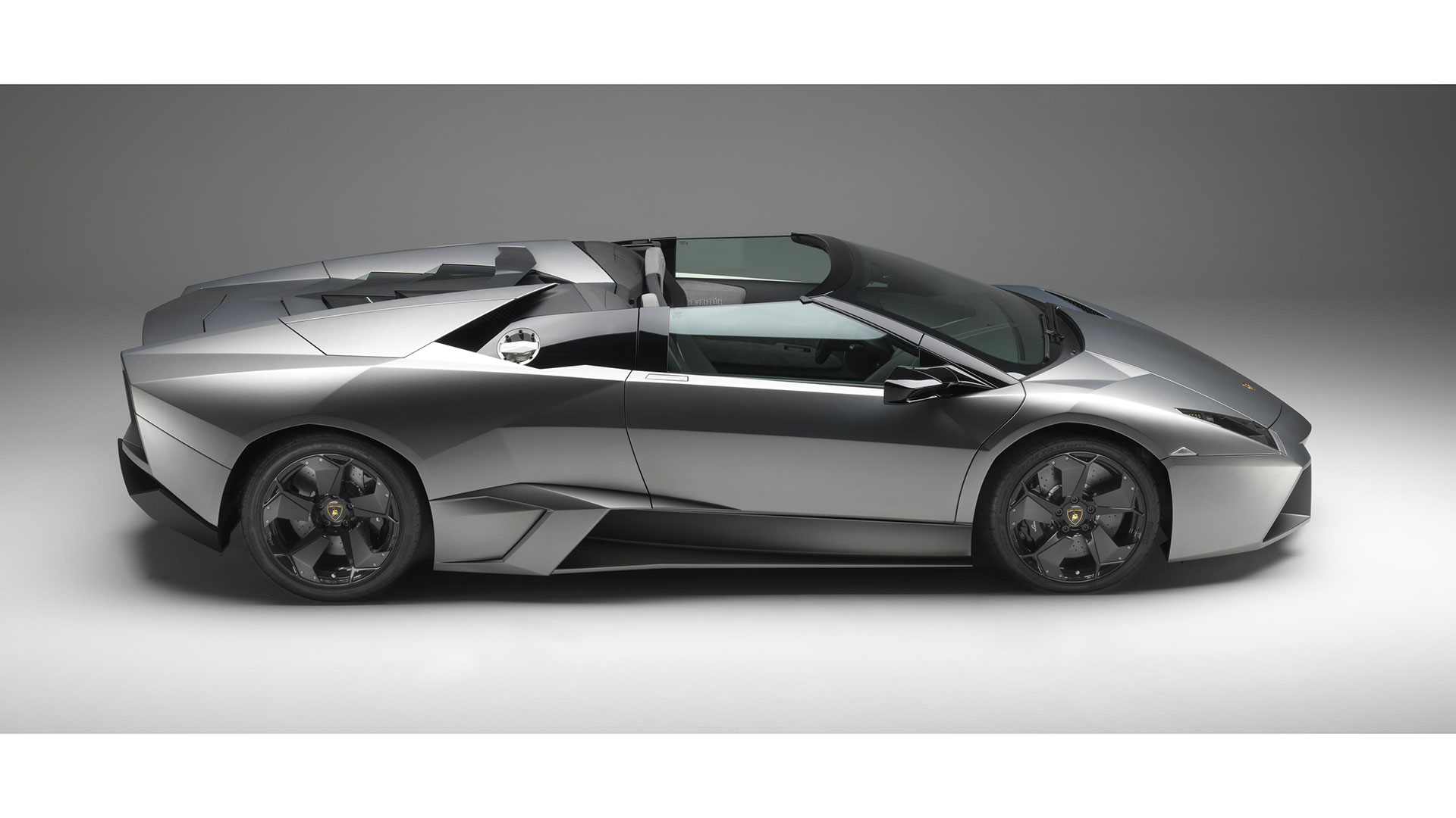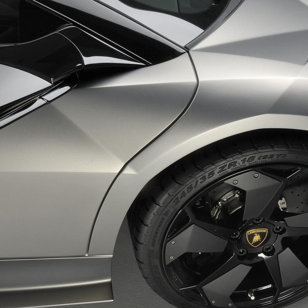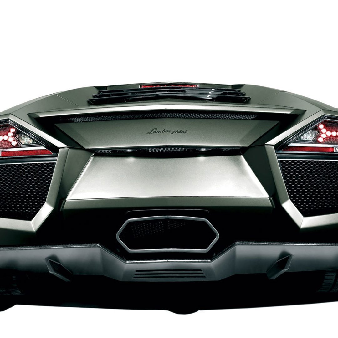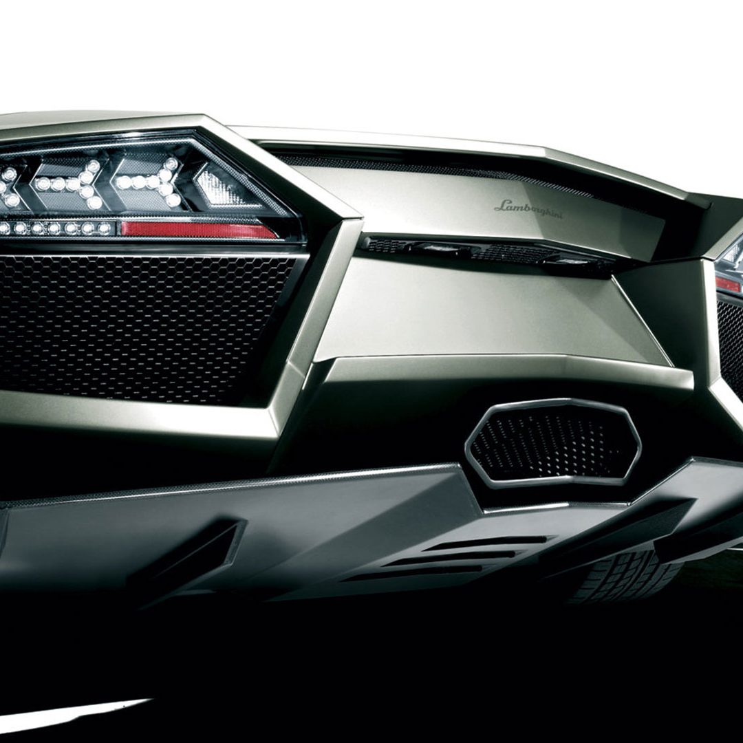 Ma – sebbene senza tradire il suo passato – è stata l’aviazione moderna, dicevamo, la principale fonte d’ispirazione di questa vettura. E a confermare tale concetto furono le stesse parole del Presidente e Amministratore Delegato di Automobili Lamborghini Stephan Winkelmann, che dichiarò: “la Reventón è la più estrema di tutte, un vero e proprio superlativo a quattro ruote. Partendo dalla base tecnica della Murciélago, i nostri designer del Centro Stile Lamborghini hanno compresso ed estremizzato il DNA del marchio”. Sebbene infatti le contemporanee Murciélago e Gallardo si proponevano di trasmettere – a livello stilistico – tanto forza, quanto dinamicità, la Reventón voleva portare questo concetto su un altro livello. Pertanto i designer del Centro Stile Lamborghini attinsero a piena mani da un ambito in cui velocità e dinamismo dominano la scena allo scopo di reinterpretare in chiave ancor più moderna (quasi futuristica) quelle linee spigolose, essenziali e nette che da decenni (in particolar modo dalla Countach in avanti) caratterizzano il linguaggio stilistico delle quattro ruote che escono dallo stabilimento di Sant’Agata Bolognese, dando così vita a linee interrotte e a superfici contorte atte a creare giochi di volumi, e di conseguenza di luci, allo scopo di restituire un senso di movimento anche da ferma. Parlando di stile, la Lamborghini Reventón conserva le portiere con apertura a forbice come su tutte le V12 del Toro dalla Countach in avanti, mentre al di sotto di queste ultime si fanno notare delle prese d’aria asimmetriche: una scelta singolare ma che segue delle funzioni ben precise. A lato conducente la presa aria è di grandi dimensioni allo scopo di aumentare l’afflusso verso il radiatore dell’olio, mentre a lato passeggero troviamo una superficie appiattita che si pone come obiettivo quello di convogliare il flusso d’aria verso il sotto scocca: una struttura sotto-pavimento piatta e ottimizzata dal punto di vista aerodinamico che culmina in un diffusore molto marcato allo scopo di promettere elevata stabilità anche a 340 Km/h. Nonostante l’estremismo delle forme, la Reventón preservava tutti i tratti salienti della Murciélago restituendo al contempo caratteristiche ottimizzate per quanto concerne: aerodinamica; raffreddamento motore; impianto di aspirazione e freni. Sono stati modificati l’afflusso d’aria e le sezioni delle prese aria a geometria variabile del motore e dello spoiler posteriore, anch’esso regolabile. E a sublimare questa ricercatezza stilistica troviamo tutta una serie di dettagli, come il cofano motore in vetro a lamelle (con quel marcato angolo di freccia che caratterizza l’intero design della vettura); il tappo del serbatoio della benzina in alluminio e fresato dal pieno; i gruppi ottici anteriori che combinano Bi-Xenon (che sfruttavano i più moderni diodi ad emissione di luce disponibili sul mercato al momento) a 7 LED (mentre per la funzione lampeggiante vengono schierati altri 9 diodi); le luci posteriori a LED che sfruttavano elementi ad elevata resistenza al calore (a fronte dell’elevata temperatura che si sviluppa in quella sezione della vettura sono infatti stati messi a punto speciali LED resistenti al calore, utilizzati come lampeggiatori, luci di stop e fanali posteriori) e con un effetto ottico a triplice freccia. A chiudere il cerchio della caratterizzazione stilistica troviamo dei cerchi appositamente realizzati per questo modello caratterizzati da un design ‘lamellare’ (quasi a ricordare le palette dei turbocompressori degli aerei) con razze in alluminio verniciate in nero a cui sono fissate delle alette in carbonio opaco che portano aria fresca all’impianto frenante e contribuiscono sensibilmente nella resa visiva della vettura. Ciliegina sulla torta il colore: un grigio-verde opaco medio a sua volta creato ad hoc e che non presenta la consueta lucentezza delle tonalità ‘Lambo’ ma che grazie a determinate particelle metalliche è in grado di risplendere al sole.