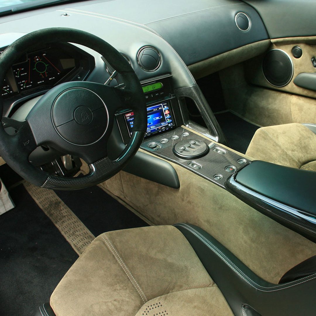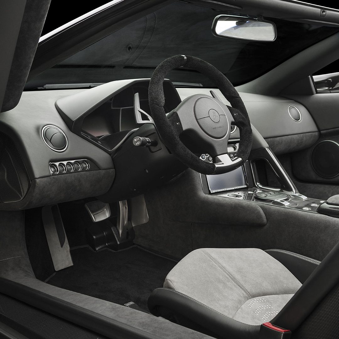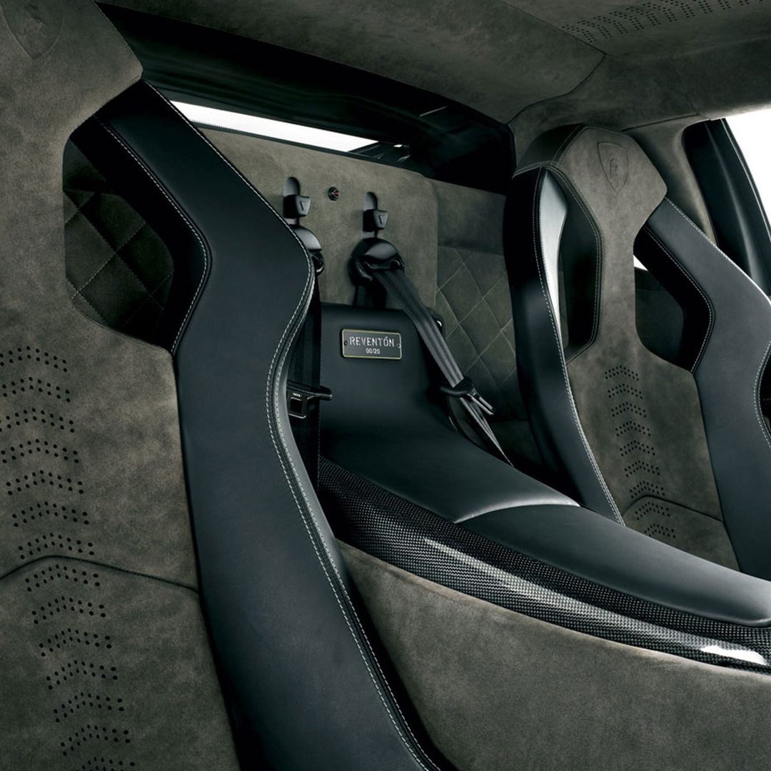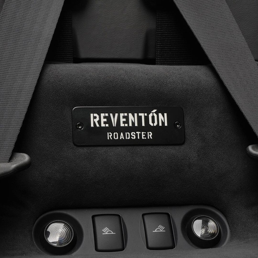 A dominare la scena, a bordo, è un ambiente molto essenziale che combina pellami, Alcantara e pochi elementi digitali: su questi ultimi spicca un quadro strumenti che si ispira ai cockpit degli aerei da caccia e composto da tre display piatti a cristalli liquidi TFT con modalità di visualizzazione innovative per l’epoca. Premendo un pulsante il conducente può scegliere tra due modalità di visualizzazione delle informazioni sulla vettura. Per il resto, gli strumenti sono alloggiati in una struttura fresata in un blocco di alluminio ricavata dal pieno e protetta da una calotta in fibra di carbonio. Completamente nuovo era il G-Force-Meter: un display che illustra le forze dinamiche di marcia, l’accelerazione longitudinale all’applicazione del gas in fase di frenatura e anche l’accelerazione trasversale nelle curve. Queste forze vengono rappresentate tramite il movimento di un cursore su una griglia 3D graduata, in base alla direzione e all’intensità dell’accelerazione. Uno strumento analogo a quello che si trova negli aerei ed utilizzato anche dai Team di Formula 1, oltre che presente oramai su alcune supercar o sportscar. Nel tachimetro, lo strumento a sinistra associa il numero di giri, sotto forma di colonna luminosa, alla visualizzazione della marcia selezionata. Con la semplice pressione di un pulsante il conducente può passare alla seconda visualizzazione quasi-analogica, in cui gli strumenti circolari classici, tachimetro e contagiri, vengono ugualmente configurati in modo innovativo e trasformati in spie luminose a colore variabile. Il G-Force-Meter rimane naturalmente al centro anche in questa modalità di rappresentazione. Infine, ogni Reventón era dotata di cambio robotizzato e.gear, azionabile mediante due piccole leve alle spalle del volante. Naturalmente a bordo non mancano anche dettagli in alluminio o in fibra di carbonio, mentre le sellerie – rivestite in un sapiente e bilanciato mix di pelle e Alcantara e con impunture a vista – presentano uno stile molto sportivo ed elementi cavi in prossimità dei poggiatesta, richiamando così (anche nei cromatismi) i seggiolini eiettabili Martin-Baker. Ovviamente, a bordo, troviamo anche numerosi lettering che riprendono la nomenclatura della vettura e con una plancia maggiormente orientata al conducente.