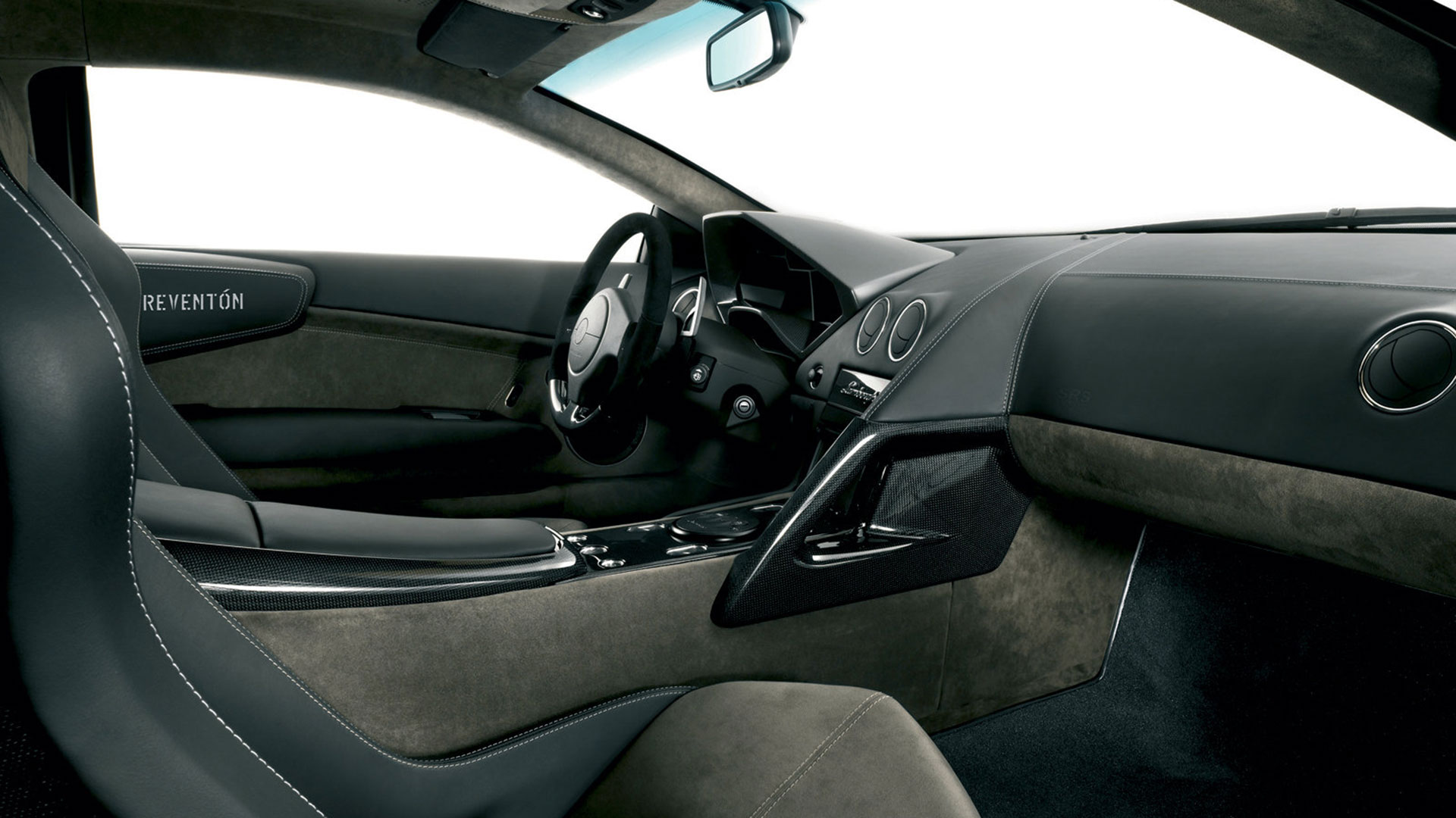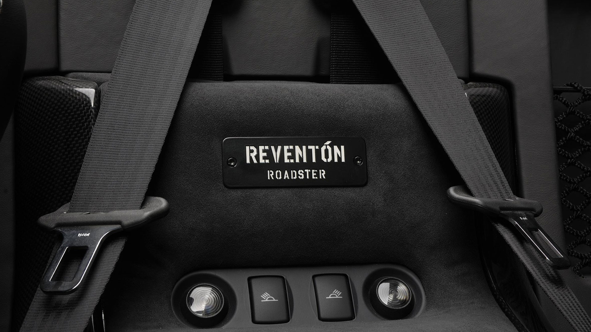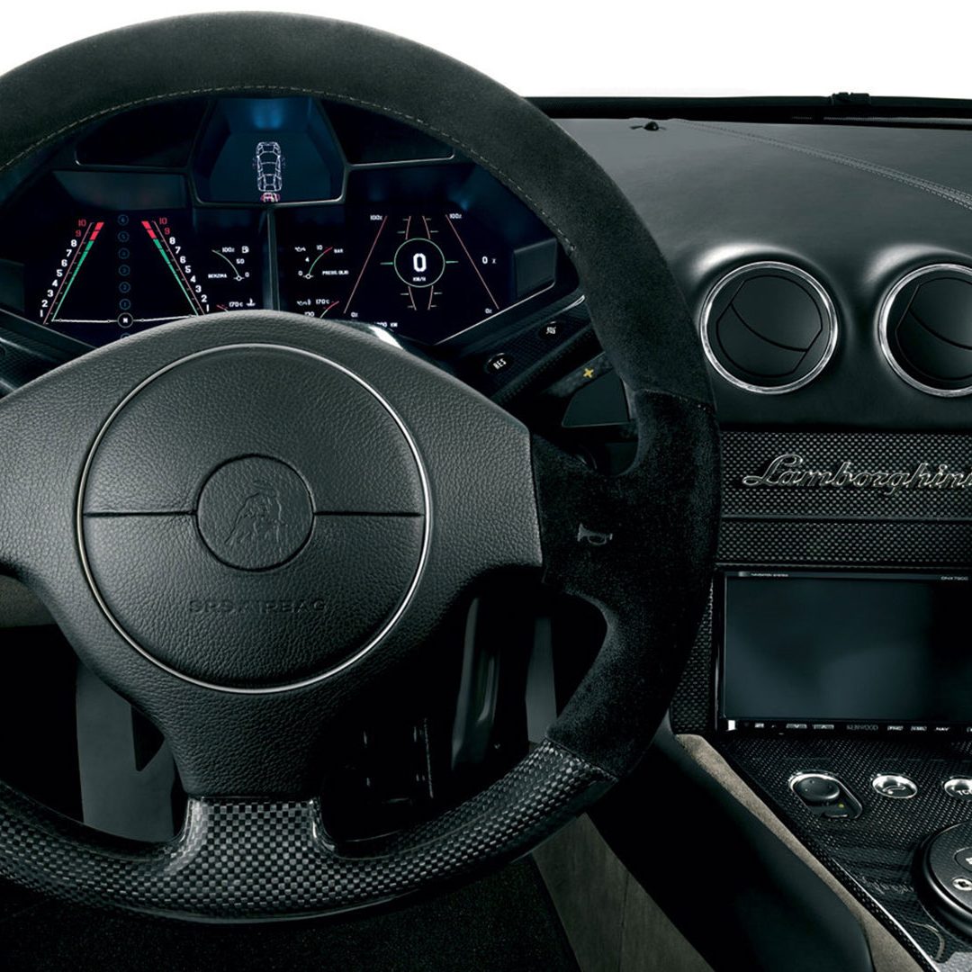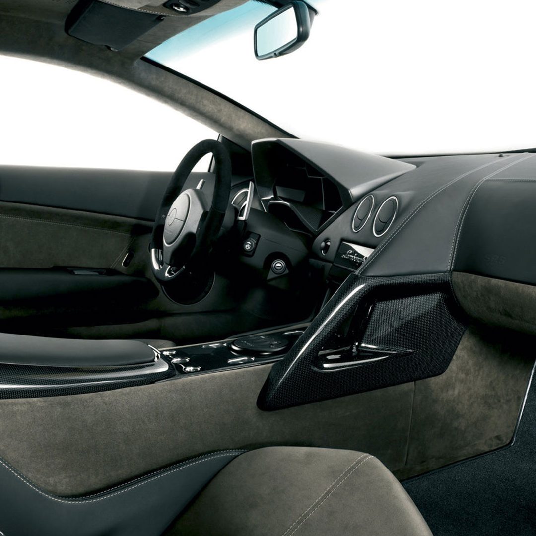 A dominare la scena, a bordo, è un ambiente molto essenziale che combina pellami, Alcantara e pochi elementi digitali: su questi ultimi spicca un quadro strumenti che si ispira ai cockpit degli aerei da caccia e composto da tre display piatti a cristalli liquidi TFT con modalità di visualizzazione innovative per l’epoca. Premendo un pulsante il conducente può scegliere tra due modalità di visualizzazione delle informazioni sulla vettura. Per il resto, gli strumenti sono alloggiati in una struttura fresata in un blocco di alluminio ricavata dal pieno e protetta da una calotta in fibra di carbonio. Completamente nuovo era il G-Force-Meter: un display che illustra le forze dinamiche di marcia, l’accelerazione longitudinale all’applicazione del gas in fase di frenatura e anche l’accelerazione trasversale nelle curve. Queste forze vengono rappresentate tramite il movimento di un cursore su una griglia 3D graduata, in base alla direzione e all’intensità dell’accelerazione. Uno strumento analogo a quello che si trova negli aerei ed utilizzato anche dai Team di Formula 1, oltre che presente oramai su alcune supercar o sportscar. Nel tachimetro, lo strumento a sinistra associa il numero di giri, sotto forma di colonna luminosa, alla visualizzazione della marcia selezionata. Con la semplice pressione di un pulsante il conducente può passare alla seconda visualizzazione quasi-analogica, in cui gli strumenti circolari classici, tachimetro e contagiri, vengono ugualmente configurati in modo innovativo e trasformati in spie luminose a colore variabile. Il G-Force-Meter rimane naturalmente al centro anche in questa modalità di rappresentazione. Infine, ogni Reventón era dotata di cambio robotizzato e.gear, azionabile mediante due piccole leve alle spalle del volante. Naturalmente a bordo non mancano anche dettagli in alluminio o in fibra di carbonio, mentre le sellerie – rivestite in un sapiente e bilanciato mix di pelle e Alcantara e con impunture a vista – presentano uno stile molto sportivo ed elementi cavi in prossimità dei poggiatesta, richiamando così (anche nei cromatismi) i seggiolini eiettabili Martin-Baker. Ovviamente, a bordo, troviamo anche numerosi lettering che riprendono la nomenclatura della vettura e con una plancia maggiormente orientata al conducente.