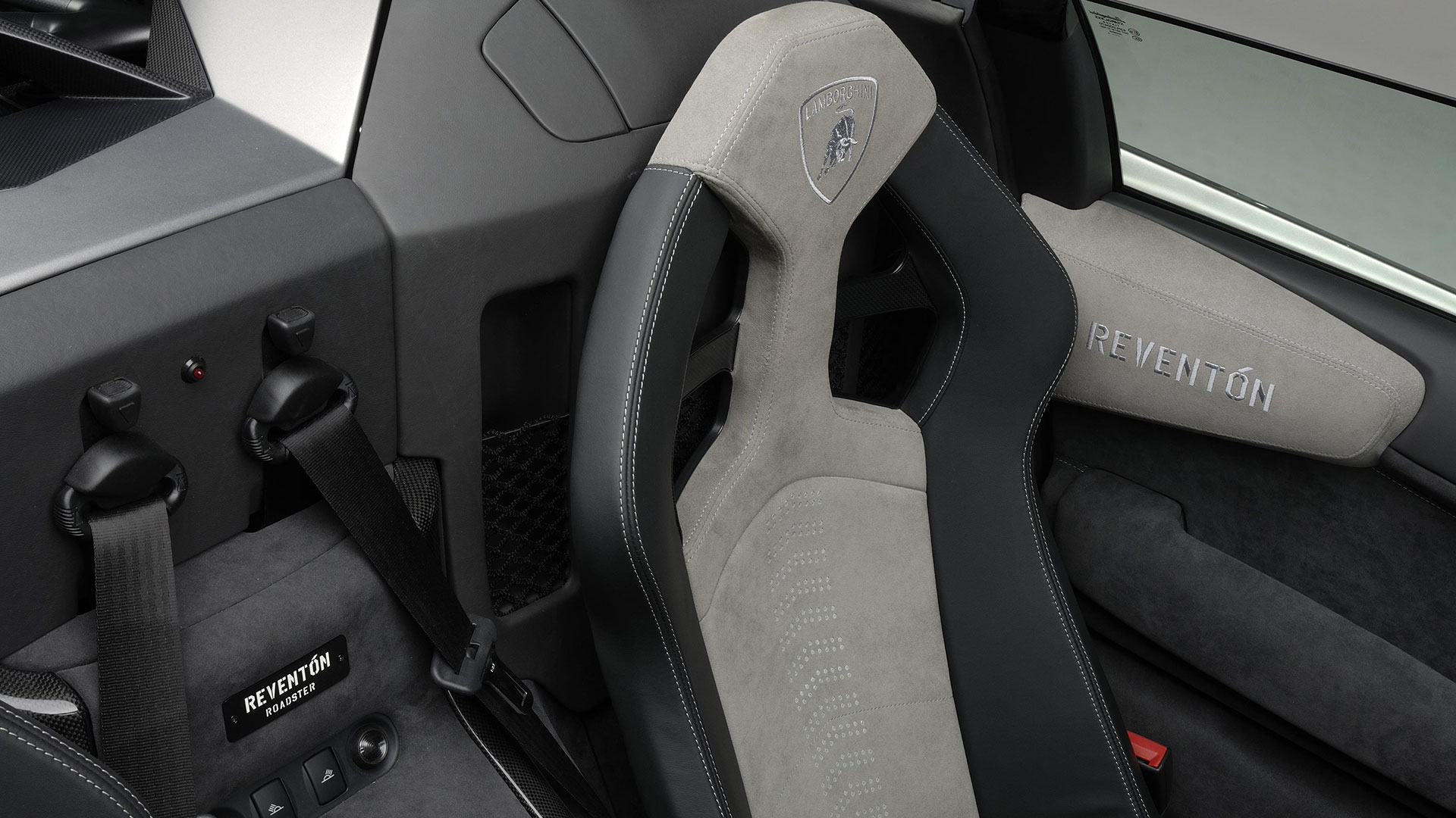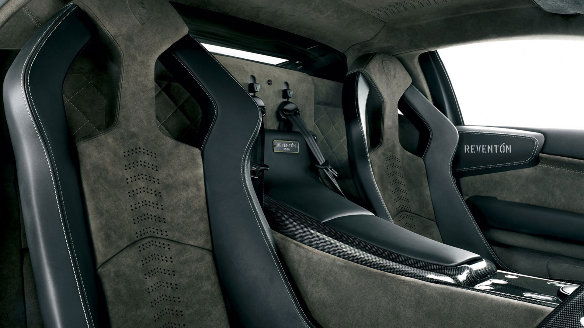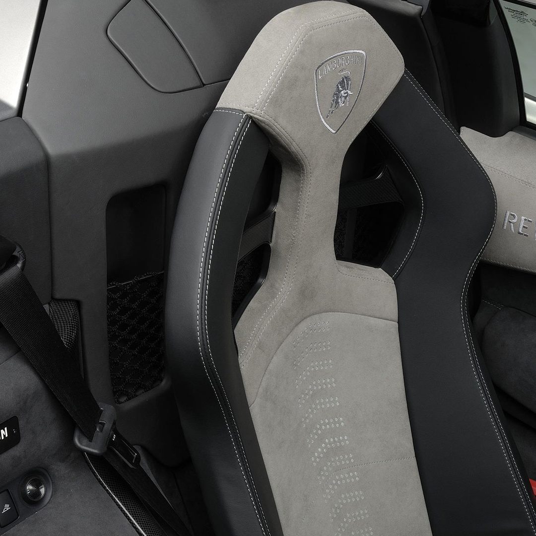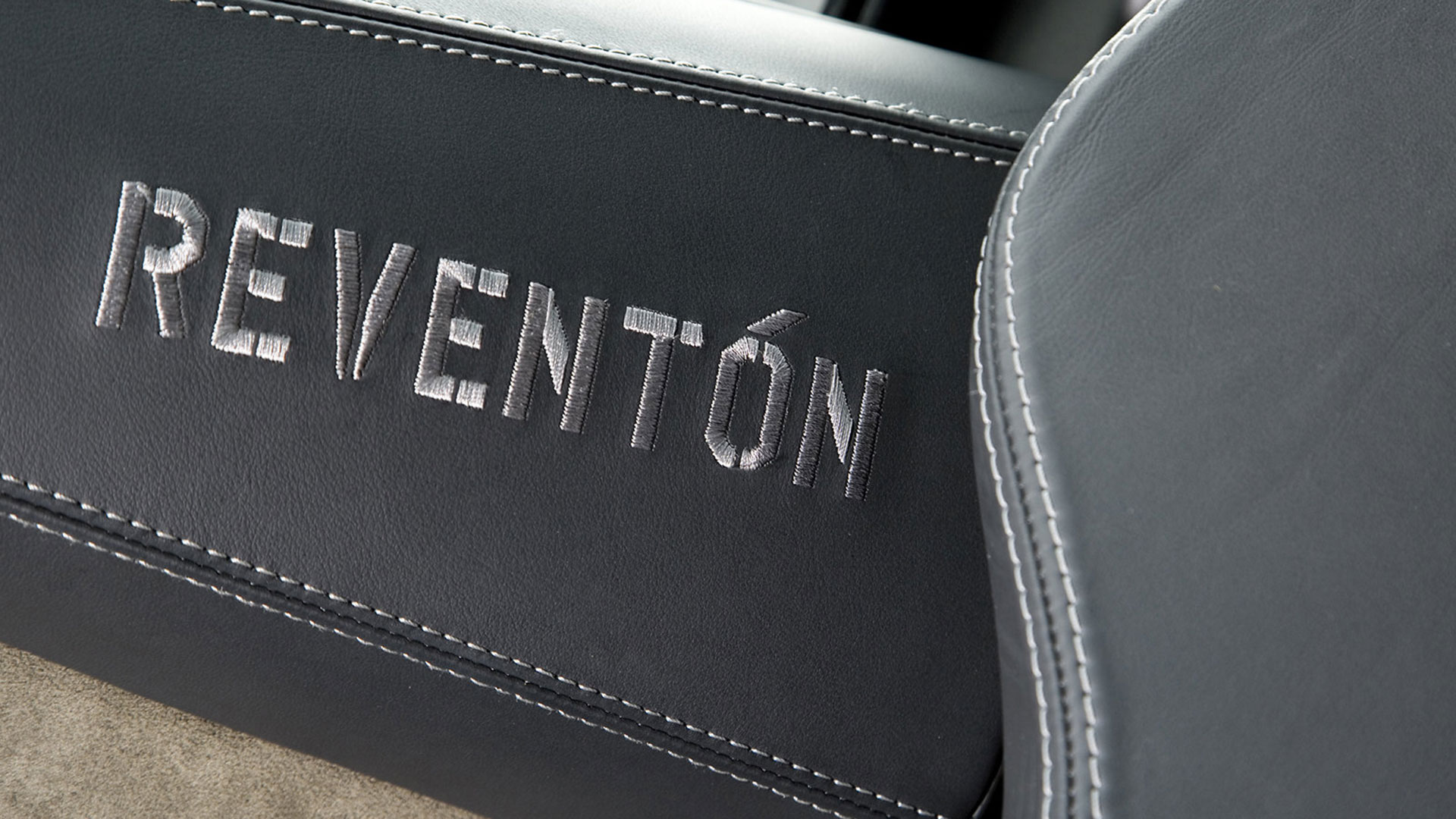 A dominare la scena, a bordo, è un ambiente molto essenziale che combina pellami, Alcantara e pochi elementi digitali: su questi ultimi spicca un quadro strumenti che si ispira ai cockpit degli aerei da caccia e composto da tre display piatti a cristalli liquidi TFT con modalità di visualizzazione innovative per l’epoca. Premendo un pulsante il conducente può scegliere tra due modalità di visualizzazione delle informazioni sulla vettura. Per il resto, gli strumenti sono alloggiati in una struttura fresata in un blocco di alluminio ricavata dal pieno e protetta da una calotta in fibra di carbonio. Completamente nuovo era il G-Force-Meter: un display che illustra le forze dinamiche di marcia, l’accelerazione longitudinale all’applicazione del gas in fase di frenatura e anche l’accelerazione trasversale nelle curve. Queste forze vengono rappresentate tramite il movimento di un cursore su una griglia 3D graduata, in base alla direzione e all’intensità dell’accelerazione. Uno strumento analogo a quello che si trova negli aerei ed utilizzato anche dai Team di Formula 1, oltre che presente oramai su alcune supercar o sportscar. Nel tachimetro, lo strumento a sinistra associa il numero di giri, sotto forma di colonna luminosa, alla visualizzazione della marcia selezionata. Con la semplice pressione di un pulsante il conducente può passare alla seconda visualizzazione quasi-analogica, in cui gli strumenti circolari classici, tachimetro e contagiri, vengono ugualmente configurati in modo innovativo e trasformati in spie luminose a colore variabile. Il G-Force-Meter rimane naturalmente al centro anche in questa modalità di rappresentazione. Infine, ogni Reventón era dotata di cambio robotizzato e.gear, azionabile mediante due piccole leve alle spalle del volante. Naturalmente a bordo non mancano anche dettagli in alluminio o in fibra di carbonio, mentre le sellerie – rivestite in un sapiente e bilanciato mix di pelle e Alcantara e con impunture a vista – presentano uno stile molto sportivo ed elementi cavi in prossimità dei poggiatesta, richiamando così (anche nei cromatismi) i seggiolini eiettabili Martin-Baker. Ovviamente, a bordo, troviamo anche numerosi lettering che riprendono la nomenclatura della vettura e con una plancia maggiormente orientata al conducente.
