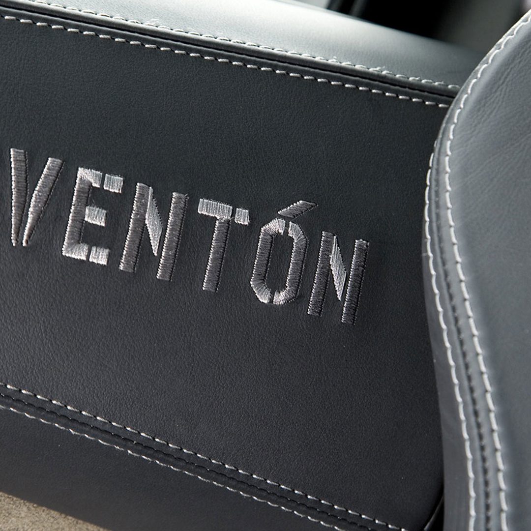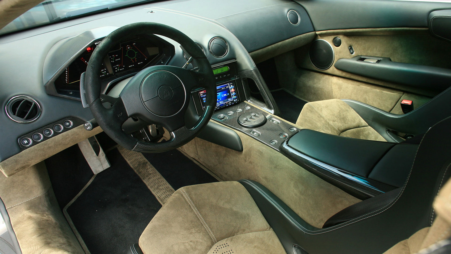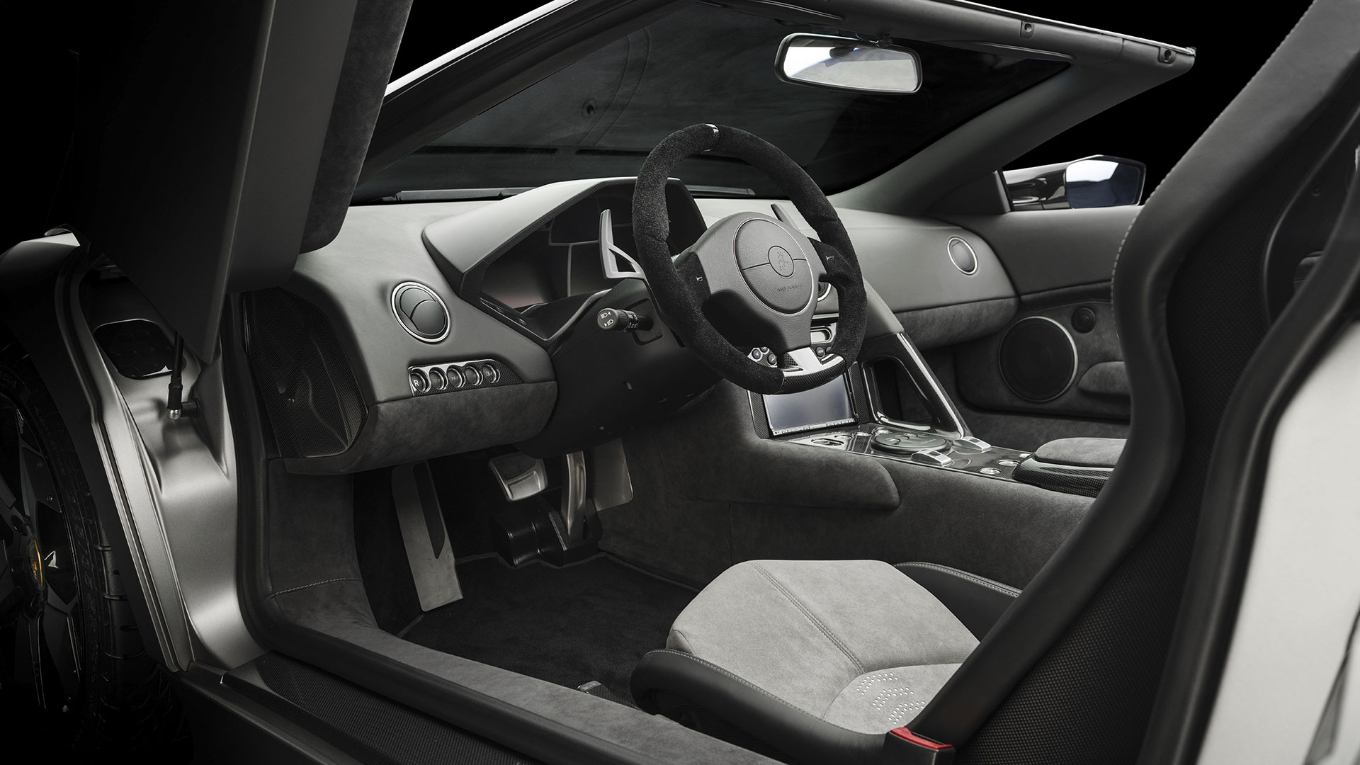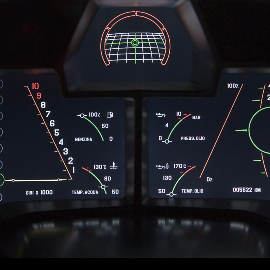 A dominare la scena, a bordo, è un ambiente molto essenziale che combina pellami, Alcantara e pochi elementi digitali: su questi ultimi spicca un quadro strumenti che si ispira ai cockpit degli aerei da caccia e composto da tre display piatti a cristalli liquidi TFT con modalità di visualizzazione innovative per l’epoca. Premendo un pulsante il conducente può scegliere tra due modalità di visualizzazione delle informazioni sulla vettura. Per il resto, gli strumenti sono alloggiati in una struttura fresata in un blocco di alluminio ricavata dal pieno e protetta da una calotta in fibra di carbonio. Completamente nuovo era il G-Force-Meter: un display che illustra le forze dinamiche di marcia, l’accelerazione longitudinale all’applicazione del gas in fase di frenatura e anche l’accelerazione trasversale nelle curve. Queste forze vengono rappresentate tramite il movimento di un cursore su una griglia 3D graduata, in base alla direzione e all’intensità dell’accelerazione. Uno strumento analogo a quello che si trova negli aerei ed utilizzato anche dai Team di Formula 1, oltre che presente oramai su alcune supercar o sportscar. Nel tachimetro, lo strumento a sinistra associa il numero di giri, sotto forma di colonna luminosa, alla visualizzazione della marcia selezionata. Con la semplice pressione di un pulsante il conducente può passare alla seconda visualizzazione quasi-analogica, in cui gli strumenti circolari classici, tachimetro e contagiri, vengono ugualmente configurati in modo innovativo e trasformati in spie luminose a colore variabile. Il G-Force-Meter rimane naturalmente al centro anche in questa modalità di rappresentazione. Infine, ogni Reventón era dotata di cambio robotizzato e.gear, azionabile mediante due piccole leve alle spalle del volante. Naturalmente a bordo non mancano anche dettagli in alluminio o in fibra di carbonio, mentre le sellerie – rivestite in un sapiente e bilanciato mix di pelle e Alcantara e con impunture a vista – presentano uno stile molto sportivo ed elementi cavi in prossimità dei poggiatesta, richiamando così (anche nei cromatismi) i seggiolini eiettabili Martin-Baker. Ovviamente, a bordo, troviamo anche numerosi lettering che riprendono la nomenclatura della vettura e con una plancia maggiormente orientata al conducente.
