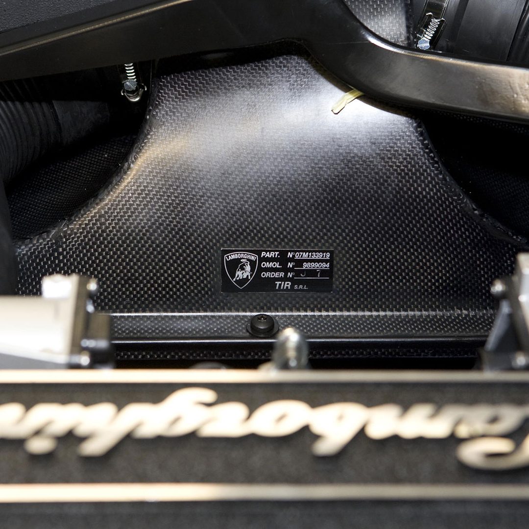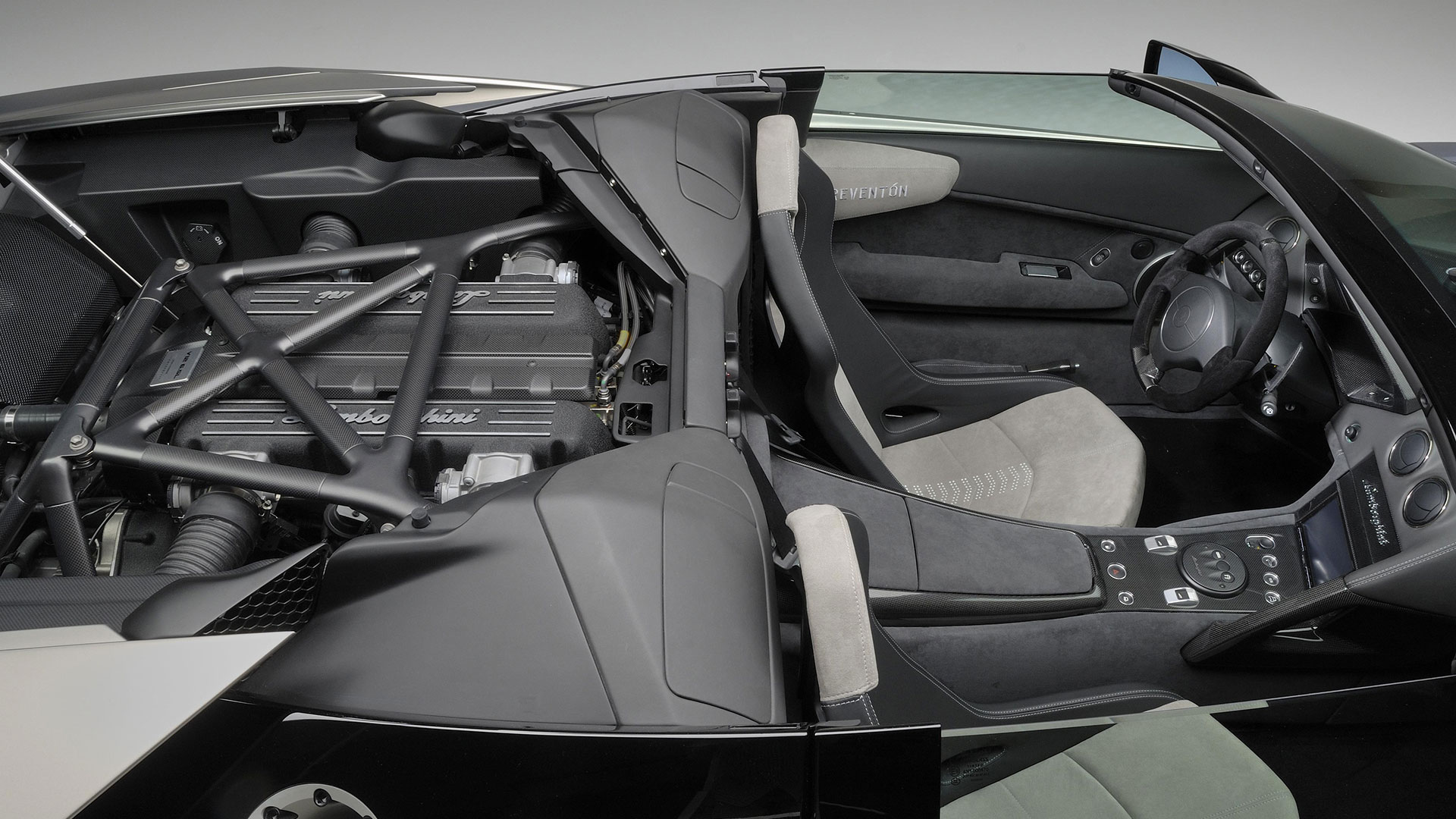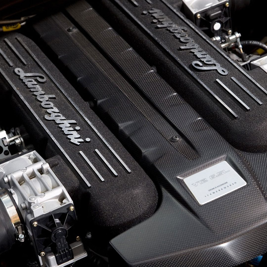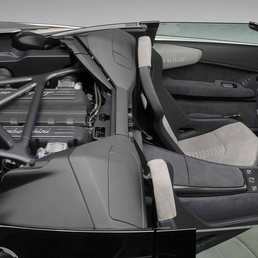 Attraverso il cofano motore in vetro a lamelle con fessure di ventilazione è possibile osservare il vero gioiello custodito all’interno di questo forziere: un 12 cilindri a V di 60° ad aspirazione naturale da 6.5 litri e collocato in posizione posteriore-longitudinale e con testate e monoblocco in alluminio, qua capace di sviluppare la bellezza di 650 CV a 8.000 giri al minuto e ben 660 Nm di coppia a 6.000 giri/min. Il rapporto di compressione di questa unità – che sfruttava un sistema di aspirazione a geometria variabile e con 3 modalità di funzionamento – era di (11 ± 0.2):1. Questo motore da 6.496 cc vantava una distribuzione a 4 valvole per cilindro con 4 assi a cammes in testa; un comando distribuzione a 2 catene e un variatore di fase continuo a controllo elettronico e accensione statica con “individual coils” (una per ogni candela) con ordine di scoppio 1-7-4-10-2-8-6-12-3-9-5-11. La gestione motore è elettronica Lamborghini LIE, multipoint, sequenziale fasata, DRIVE-BY-WIRE, mentre sul fronte della lubrificazione troviamo il carter secco con pompe di recupero a 2 ingranaggi e pompa di mandata a un ingranaggio. Il cambio, come dicevamo, era un robotizzato e.gear, a cui si affiancava un sistema a quattro ruote motrici permanenti di tipo Viscous Traction, permettendo così alla Reventón di ‘bruciare’ lo 0-100 km/h in 3.4” e di superare 340 km/h di velocità massima. Lunga 4.700 mm, larga 2.058 mm, alta 1.135 mm e con un passo di 2.665 mm, la vettura fermava l’ago della bilancia su un totale di 1.665 kg a secco e vantava sospensioni a 4 ruote indipendenti a quadrilatero articolato con ammortizzatori idraulici e molle elicoidali coassiali, nonché con doppi bracci oscillanti anteriori e posteriori, barra antirollio, “anti-drive” e “anti-squat”. L’impianto frenante – a 4 dischi autoventilati con comando a pedale con trasmissione idraulica a 2 circuiti indipendenti (uno per ogni asse con servofreno a depressione) e ovviamente dotato di ABS + DRP – poteva essere o in acciaio con dischi anteriori da 380 x 34 mm e pinze a 8 pistoncini e dischi posteriori da 355 x 32 mm e pinze a 4 pistoncini; o carboceramico con dischi 380 x 38 mm e pinze a 6 pistoncini davanti e con dischi da 380 x 38 mm con pinze a 6 pistoncini dietro. E a chiudere il cerchio della dotazione tecnica troviamo uno sterzo meccanico (per pignone e cremagliera) servoassistito da 12.55 m di diametro di sterzata e il telaio tubolare in acciaio altoresistenziale con elementi strutturali in fibra di carbonio; materiale quest’ultimo impiegato anche per la carrozzeria, fatta eccezione per il tetto e i pannelli porta che sono in acciaio.