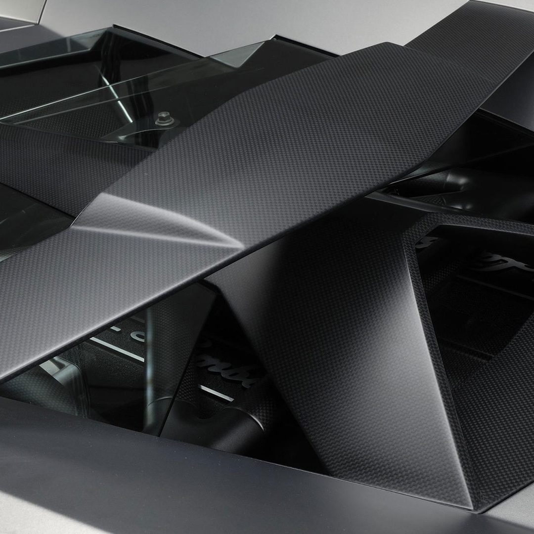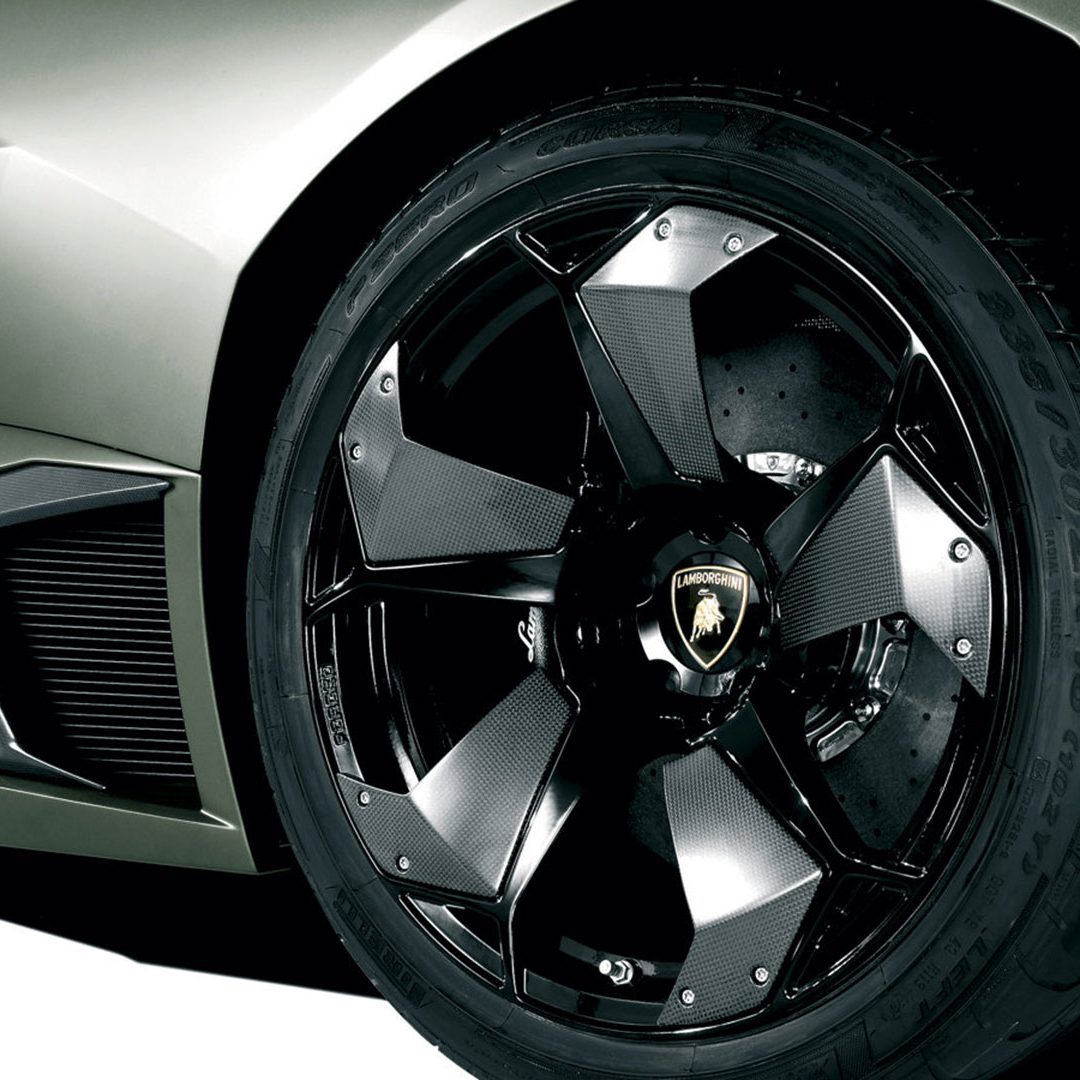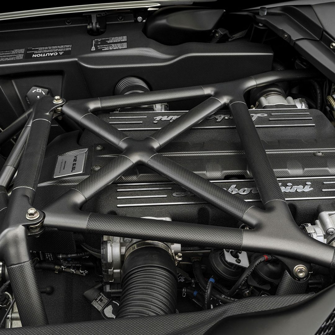 Attraverso il cofano motore in vetro a lamelle con fessure di ventilazione è possibile osservare il vero gioiello custodito all’interno di questo forziere: un 12 cilindri a V di 60° ad aspirazione naturale da 6.5 litri e collocato in posizione posteriore-longitudinale e con testate e monoblocco in alluminio, qua capace di sviluppare la bellezza di 650 CV a 8.000 giri al minuto e ben 660 Nm di coppia a 6.000 giri/min. Il rapporto di compressione di questa unità – che sfruttava un sistema di aspirazione a geometria variabile e con 3 modalità di funzionamento – era di (11 ± 0.2):1. Questo motore da 6.496 cc vantava una distribuzione a 4 valvole per cilindro con 4 assi a cammes in testa; un comando distribuzione a 2 catene e un variatore di fase continuo a controllo elettronico e accensione statica con “individual coils” (una per ogni candela) con ordine di scoppio 1-7-4-10-2-8-6-12-3-9-5-11. La gestione motore è elettronica Lamborghini LIE, multipoint, sequenziale fasata, DRIVE-BY-WIRE, mentre sul fronte della lubrificazione troviamo il carter secco con pompe di recupero a 2 ingranaggi e pompa di mandata a un ingranaggio. Il cambio, come dicevamo, era un robotizzato e.gear, a cui si affiancava un sistema a quattro ruote motrici permanenti di tipo Viscous Traction, permettendo così alla Reventón di ‘bruciare’ lo 0-100 km/h in 3.4” e di superare 340 km/h di velocità massima. Lunga 4.700 mm, larga 2.058 mm, alta 1.135 mm e con un passo di 2.665 mm, la vettura fermava l’ago della bilancia su un totale di 1.665 kg a secco e vantava sospensioni a 4 ruote indipendenti a quadrilatero articolato con ammortizzatori idraulici e molle elicoidali coassiali, nonché con doppi bracci oscillanti anteriori e posteriori, barra antirollio, “anti-drive” e “anti-squat”. L’impianto frenante – a 4 dischi autoventilati con comando a pedale con trasmissione idraulica a 2 circuiti indipendenti (uno per ogni asse con servofreno a depressione) e ovviamente dotato di ABS + DRP – poteva essere o in acciaio con dischi anteriori da 380 x 34 mm e pinze a 8 pistoncini e dischi posteriori da 355 x 32 mm e pinze a 4 pistoncini; o carboceramico con dischi 380 x 38 mm e pinze a 6 pistoncini davanti e con dischi da 380 x 38 mm con pinze a 6 pistoncini dietro. E a chiudere il cerchio della dotazione tecnica troviamo uno sterzo meccanico (per pignone e cremagliera) servoassistito da 12.55 m di diametro di sterzata e il telaio tubolare in acciaio altoresistenziale con elementi strutturali in fibra di carbonio; materiale quest’ultimo impiegato anche per la carrozzeria, fatta eccezione per il tetto e i pannelli porta che sono in acciaio.