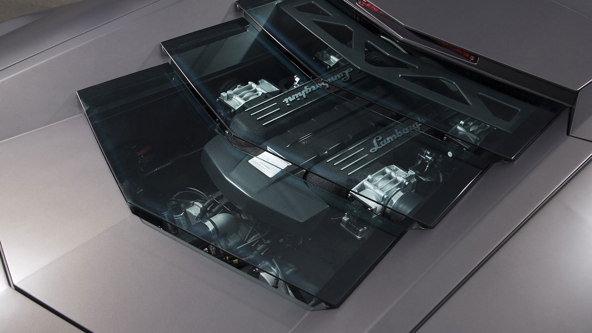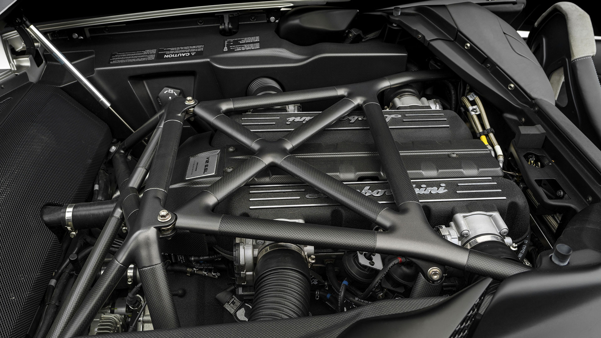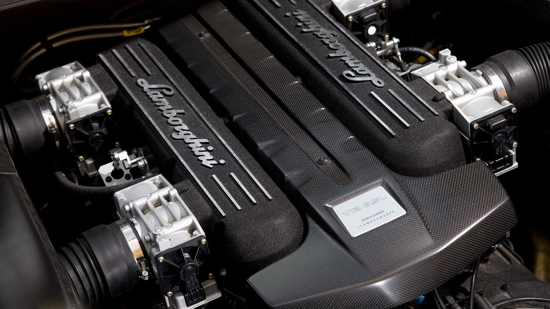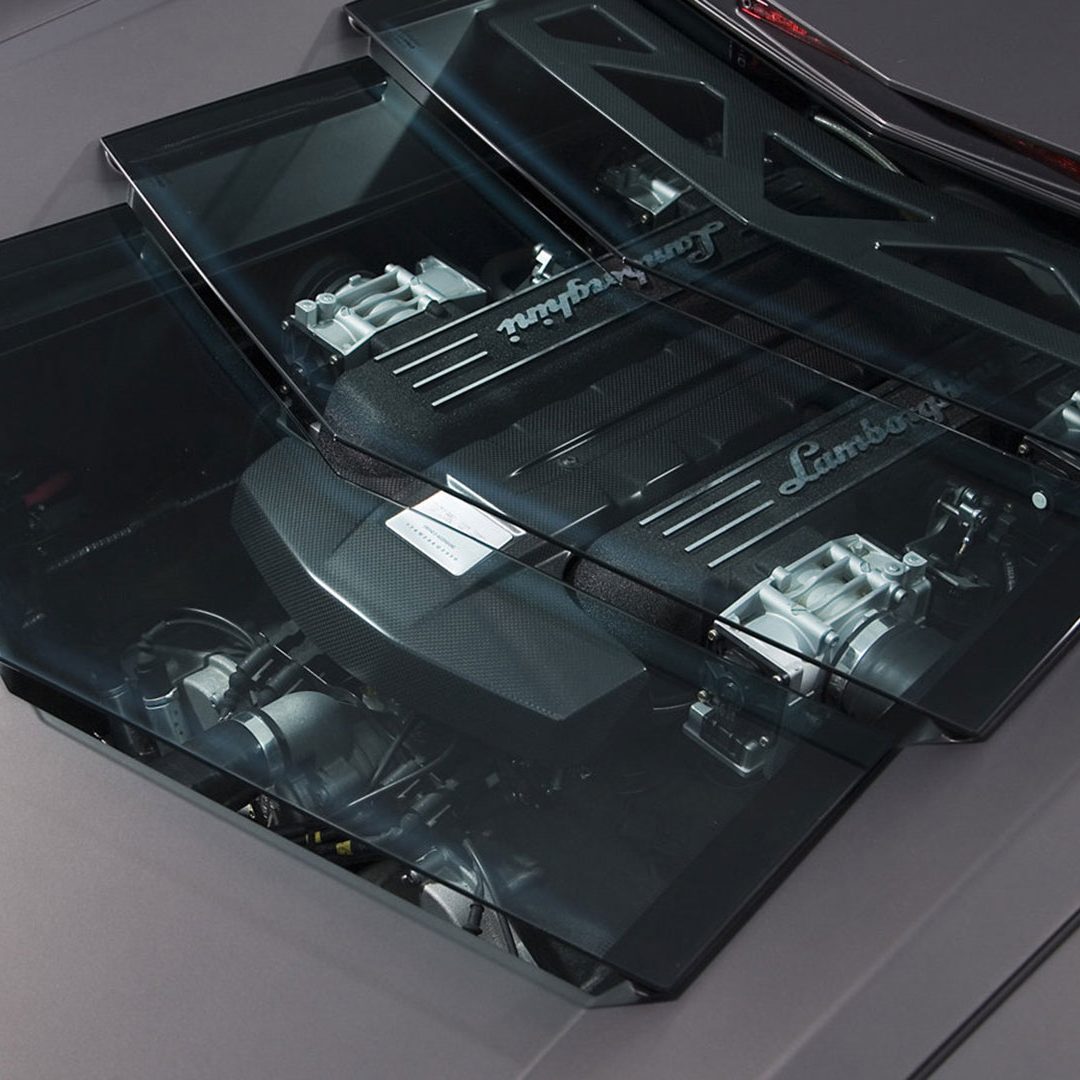 Attraverso il cofano motore in vetro a lamelle con fessure di ventilazione è possibile osservare il vero gioiello custodito all’interno di questo forziere: un 12 cilindri a V di 60° ad aspirazione naturale da 6.5 litri e collocato in posizione posteriore-longitudinale e con testate e monoblocco in alluminio, qua capace di sviluppare la bellezza di 650 CV a 8.000 giri al minuto e ben 660 Nm di coppia a 6.000 giri/min. Il rapporto di compressione di questa unità – che sfruttava un sistema di aspirazione a geometria variabile e con 3 modalità di funzionamento – era di (11 ± 0.2):1. Questo motore da 6.496 cc vantava una distribuzione a 4 valvole per cilindro con 4 assi a cammes in testa; un comando distribuzione a 2 catene e un variatore di fase continuo a controllo elettronico e accensione statica con “individual coils” (una per ogni candela) con ordine di scoppio 1-7-4-10-2-8-6-12-3-9-5-11. La gestione motore è elettronica Lamborghini LIE, multipoint, sequenziale fasata, DRIVE-BY-WIRE, mentre sul fronte della lubrificazione troviamo il carter secco con pompe di recupero a 2 ingranaggi e pompa di mandata a un ingranaggio. Il cambio, come dicevamo, era un robotizzato e.gear, a cui si affiancava un sistema a quattro ruote motrici permanenti di tipo Viscous Traction, permettendo così alla Reventón di ‘bruciare’ lo 0-100 km/h in 3.4” e di superare 340 km/h di velocità massima. Lunga 4.700 mm, larga 2.058 mm, alta 1.135 mm e con un passo di 2.665 mm, la vettura fermava l’ago della bilancia su un totale di 1.665 kg a secco e vantava sospensioni a 4 ruote indipendenti a quadrilatero articolato con ammortizzatori idraulici e molle elicoidali coassiali, nonché con doppi bracci oscillanti anteriori e posteriori, barra antirollio, “anti-drive” e “anti-squat”. L’impianto frenante – a 4 dischi autoventilati con comando a pedale con trasmissione idraulica a 2 circuiti indipendenti (uno per ogni asse con servofreno a depressione) e ovviamente dotato di ABS + DRP – poteva essere o in acciaio con dischi anteriori da 380 x 34 mm e pinze a 8 pistoncini e dischi posteriori da 355 x 32 mm e pinze a 4 pistoncini; o carboceramico con dischi 380 x 38 mm e pinze a 6 pistoncini davanti e con dischi da 380 x 38 mm con pinze a 6 pistoncini dietro. E a chiudere il cerchio della dotazione tecnica troviamo uno sterzo meccanico (per pignone e cremagliera) servoassistito da 12.55 m di diametro di sterzata e il telaio tubolare in acciaio altoresistenziale con elementi strutturali in fibra di carbonio; materiale quest’ultimo impiegato anche per la carrozzeria, fatta eccezione per il tetto e i pannelli porta che sono in acciaio.