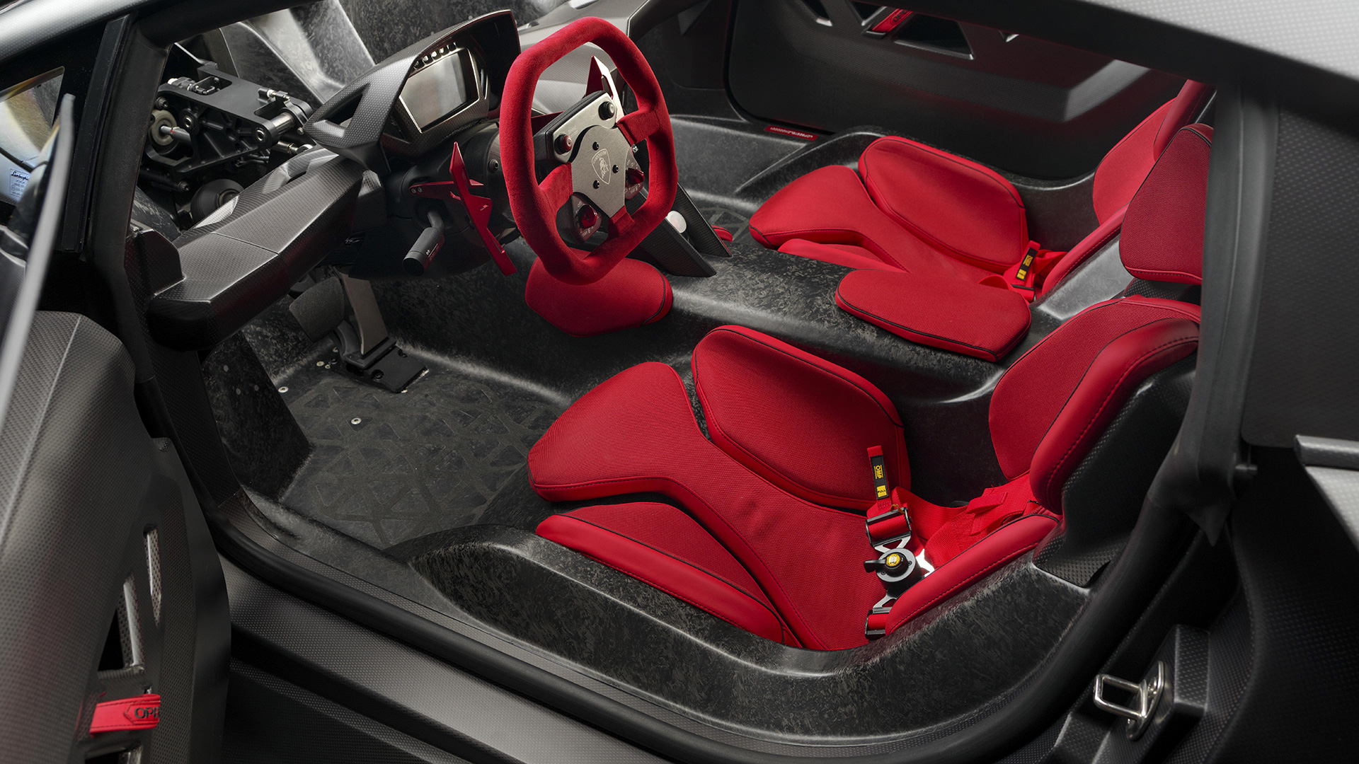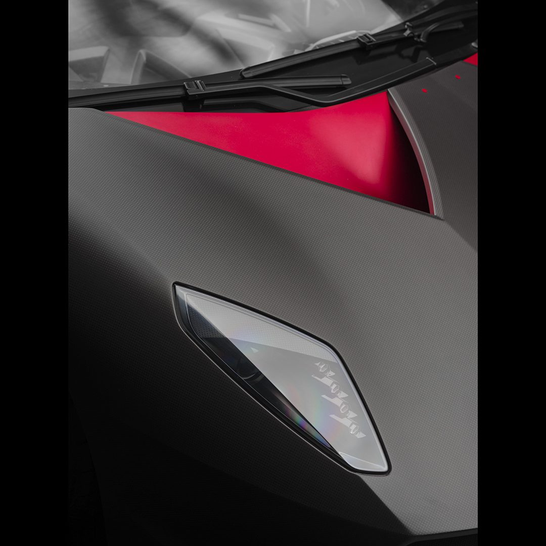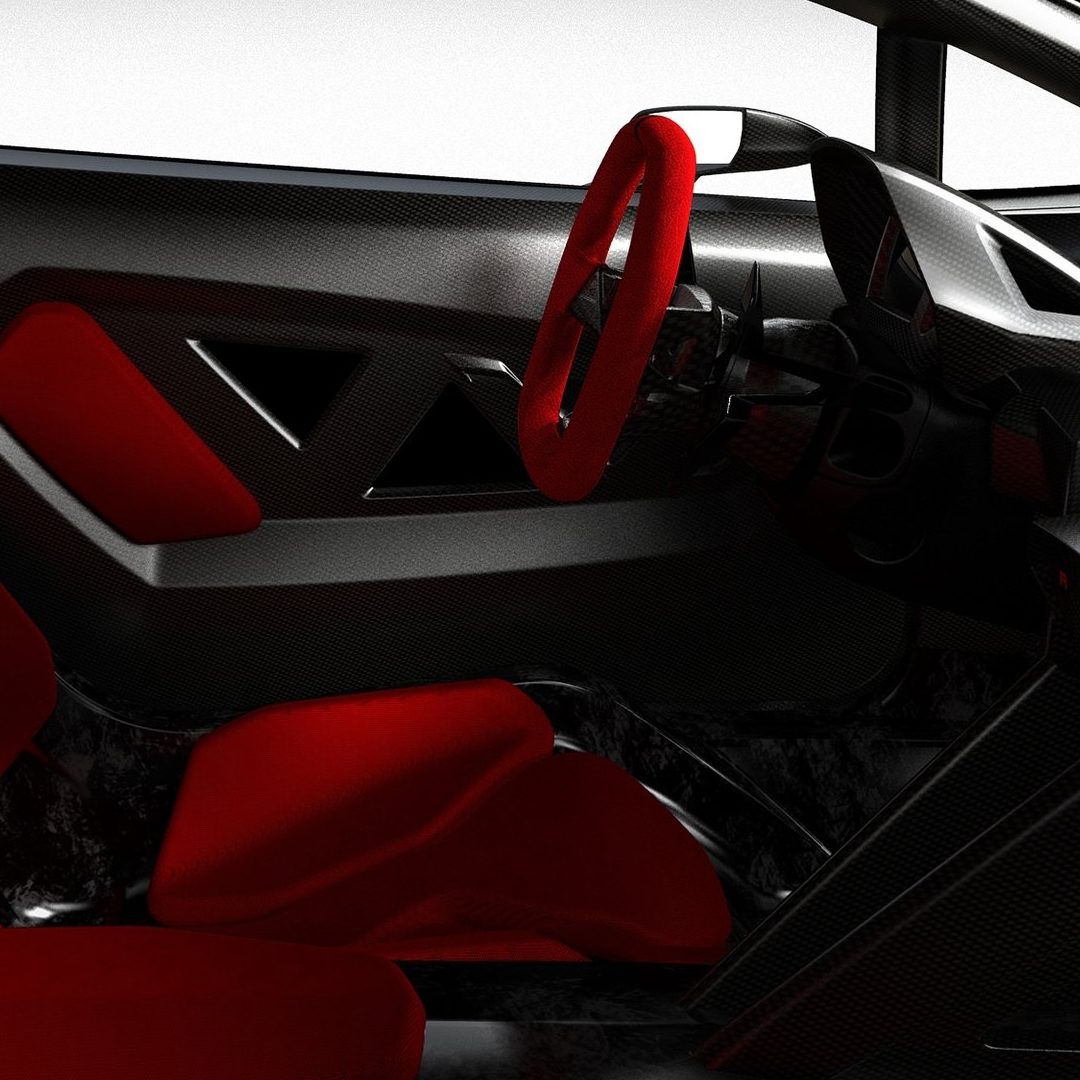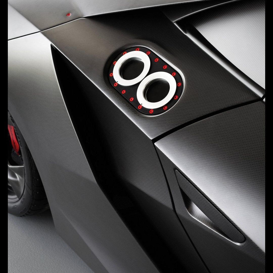 Ma andiamo per ordine. Come dicevamo, alla base della vettura troviamo una struttura di fibra di carbonio solida, rigida e leggera, in quanto la cellula dell’auto altro non è che una monoscocca: sezione anteriore, carrozzeria (non verniciata), assorbitori di impatto, le principali componenti delle sospensioni e i cerchi sono realizzati in fibra di carbonio (perfino gli inserti rossi che troviamo nella carrozzeria sono realizzati in una vernice trasparente opaca che sfrutta componenti ceramici nano tecnologici e che vede l’aggiunta di micro cristalli riflettenti fortemente in grado di resistere all’usura: giusto per farvi comprendere quanto l’attenzione al contenimento delle masse, su questa vettura, sia stato veramente maniacale, al punto che anche i gusci dei sedili sono parte integrante dell’auto e non componenti a sé). Anche l’albero di trasmissione è stato realizzato in fibra di carbonio (soluzione che ha permesso la rimozione del giunto centrale dell’albero, portando quindi ad una consistente riduzione di peso), mentre i terminali di scarico sono invece in Pyrosic: un materiale composito di vetro a matrice ceramica in grado di tollerare temperature molto elevate, fino a 900°. Il tutto a demarcare il profondo legame aeronautico di questa incredibile e pazzesca supercar. E a proteggere tutto il nobile materiale di cui questa folle (nonché rastrematissima, super-compatta e minimalistica) auto è composta troviamo un rivestimento lucido-opaco. E come anticipavamo poc’anzi, le strutture complesse sono state integrate in un’unica componente: ad esempio, sezione anteriore e posteriore della scocca sono state entrambe realizzate in un unico pezzo. Queste componenti di grandi dimensioni sono state fissate con delle viti allo scopo di consentirne il rapido disassemblaggio. E come dicevamo, l’approccio minimalista è stato applicato anche agli interni (a loro volta iper-essenziali e che mettono alla vista inserti rossi e rivestimenti in Alcantara sempre in tale cromia), a partire dai sedili, che rinunciano completamente ad una struttura convenzionale per far parte direttamente della monoscocca. La triangolazione di guida può quindi essere variata agendo sulla regolazione dal volante (che può essere aggiustato in altezza e in estensione) e della pedaliera, che può essere sistemata longitudinalmente grazie ad un dispositivo elettrico. Inoltre – sempre allo scopo di contenere le masse – si è rinunciato ad un rivestimento interno inteso nel senso classico, in quanto a dominare la scena rimane il CFRP lasciato libero alla vista, presente nel pavimento, nel tunnel centrale, sul tetto della monoscocca, sulle portiere e sulla plancia. Anche le centraline elettroniche sono state lasciate visibili e montate con una speciale estetica hi-tech. Il motivo triangolare è evidente anche negli interni e contribuisce a sua volta alla riduzione di peso. I dispositivi di controllo sono presenti con un format ridotto, mentre le leve del cambio hanno un design dedicato. La strumentazione fornisce informazioni sulla velocità, così come su tutti i parametri relativi al funzionamento del motore. Tre pulsanti piezoelettrici completano la consolle centrale: il pulsante start, quello per la retromarcia e quello per le luci.