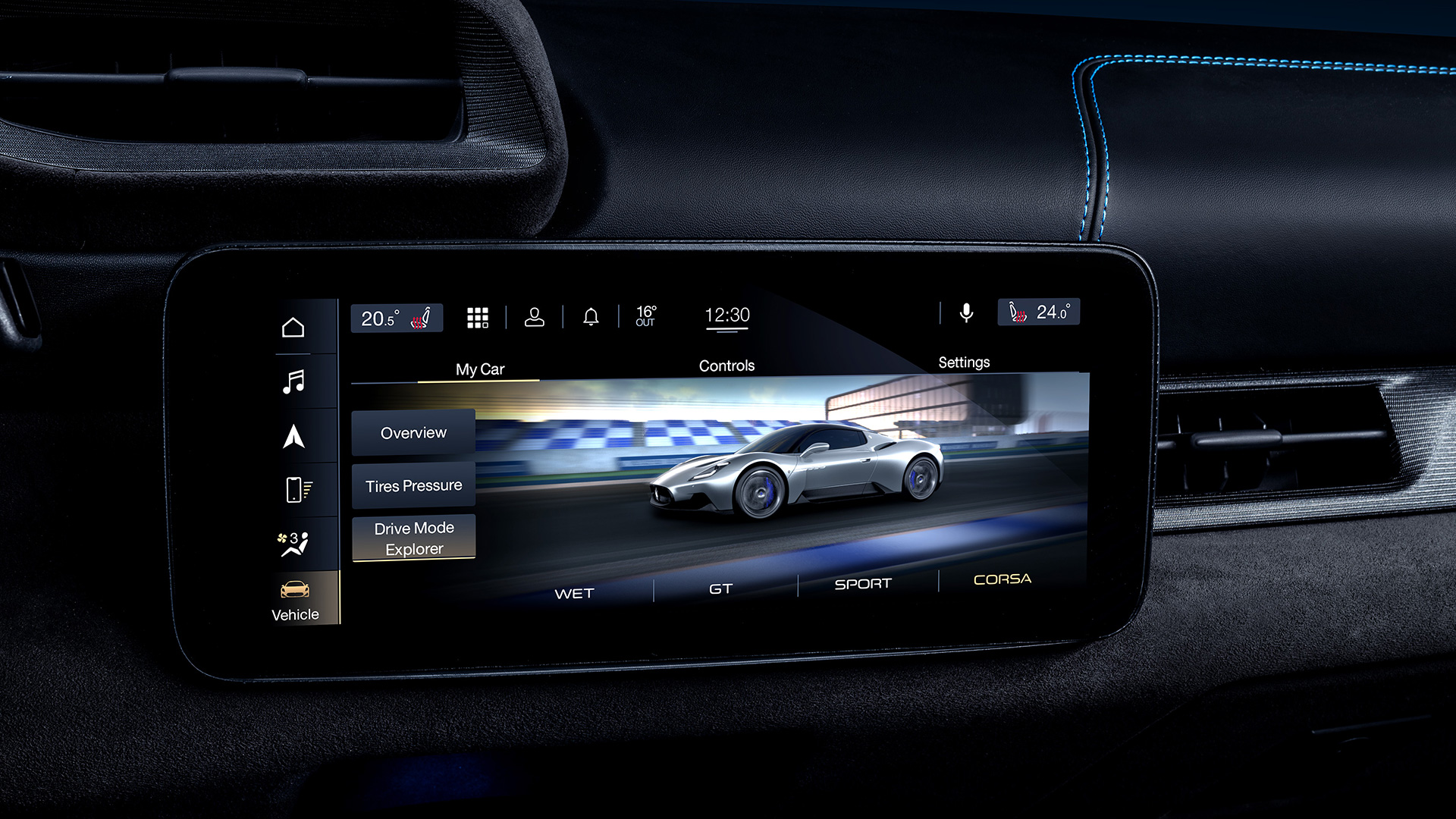 Le sue forme aerodinamiche (oltre 2.000 ore di lavoro in galleria del vento e più di mille simulazioni di fluidodinamica CFD – Computational Fluid Dynamics) nascondono infatti, in un abitacolo (pregno di CFRP, pellami e Alcantara) minimal, sportivo e tecnologico, il centro nevralgico di interfaccia uomo-macchina. Il volante integra i pulsanti dello start e del launch control, mentre il selettore delle modalità di guida (ispirato dall’orologeria di lusso), posto al centro del tunnel, permette di scegliere tra cinque diversi driving mode (ognuno corrisposto da una grafica specifica): Wet (colore verde – pensata per le condizioni di aderenza precaria); GT (colore blu – indicata per la guida quotidiana); SPORT (colore rosso – orientata alla guida sportiva e alla ricerca delle prestazioni, specialmente in pista); CORSA (colore giallo – indicata per la guida in pista e con traction control ridotto al minimo dell’invasività) ed ESC Off (colore arancione – pensata per i piloti esperti: disabilita completamente tutti i controlli elettronici, traction control compreso).