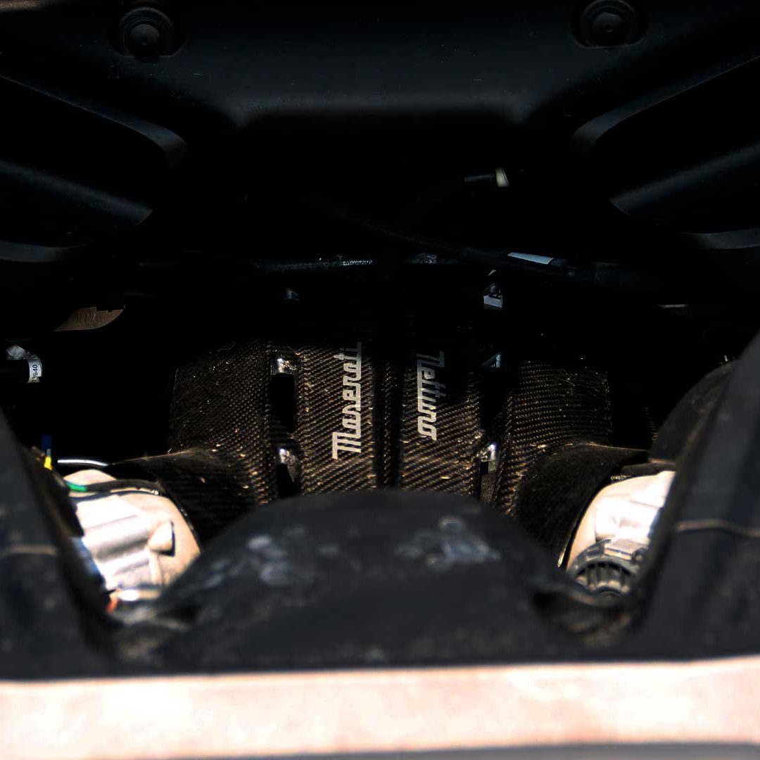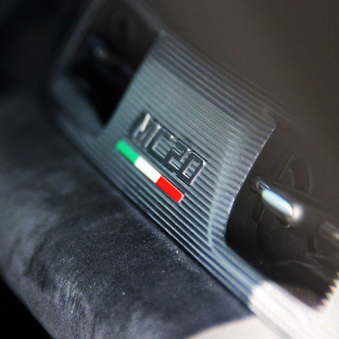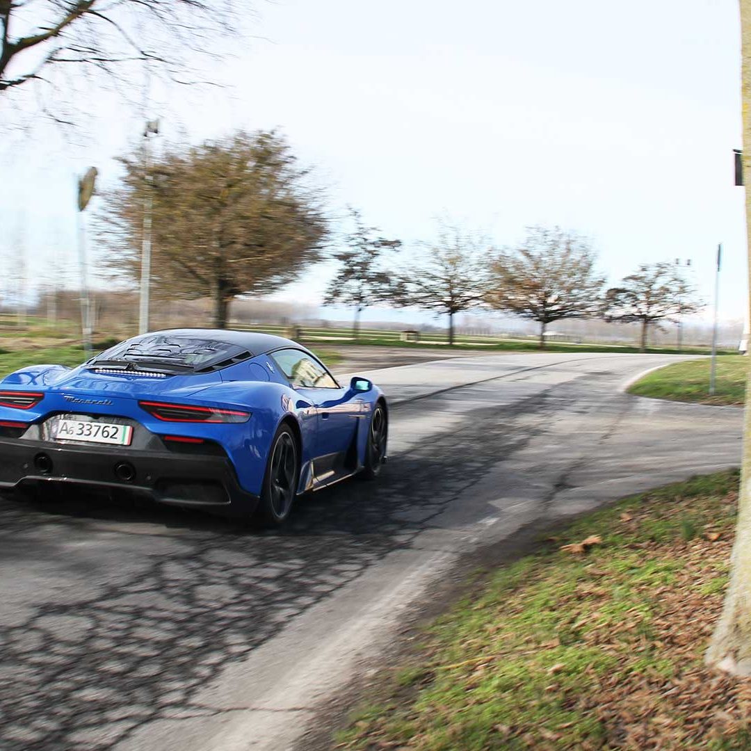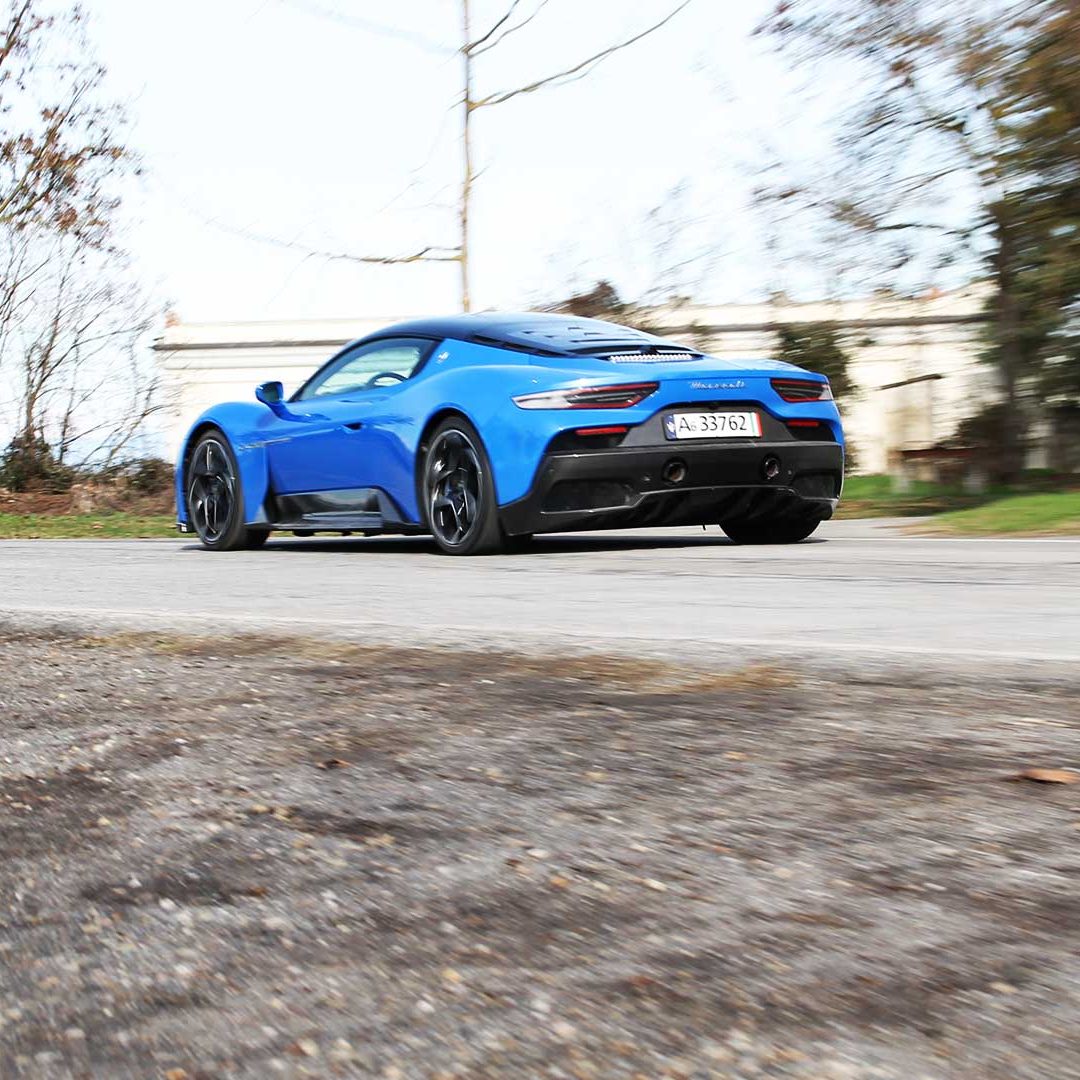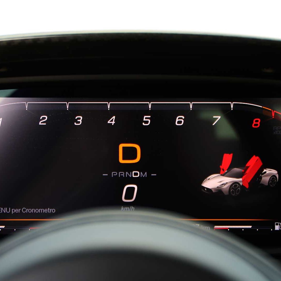 Le sedute (firmate Sabelt) sono comode, non affaticano e accolgono pilota e passeggero in una triangolazione praticamente perfetta, tanto per macinare km in scioltezza quanto per divertirsi a dare gas una volta al posto di guida. Gli oggetti di piccole dimensioni trovano tutto lo spazio necessario nei vani del tunnel centrale (c’è anche la ricarica wireless per lo smartphone) e dinnanzi al passeggero. Decisamente più risicato (al pari di un serbatoio che non brilla per capienza) – come a demarcare la vera vocazione di questa vettura – quello riservato agli oggetti di grandi dimensioni come possono essere borse o trolley: di questi ultimi ci si può tranquillamente dimenticare dell’esistenza. Nel piccolo vano alle spalle del motore c’è posto per un paio di zaini o due borsone e poco più. Alle spalle dei sedili possono essere riposti due zaini, le giacche e poco altro. Insomma: sì alle uscite per il weekend, ma a patto di portare con voi davvero lo stretto indispensabile. Ma d’altronde non è certo per la capacità di carico che questa vettura è concepita (anche se molte competitor lasciano comunque più spazio davanti anche per due trolley di piccole dimensioni). L’ambiente, come detto poc’anzi, è molto pulito: il tunnel centrale mette alla vista solo due pulsanti e il selettore dei 5 driving mode, che richiama nelle forme l’orologio analogico che è un marchio di fabbrica degli interni Maserati e qua scomparso dalla plancia per ovvie ragioni di sportività e di pulizia estetica. Molto belli i giochi di volumi e la conformazione delle varie superfici. Il volante integra tutti i comandi essenziali, nonché i pulsanti dello start e del launch control (quest’ultimo però, nel corso del nostro test, non ne ha voluto sapere di funzionare). Sospensioni a doppio braccio oscillante con ammortizzatori attivi e in alluminio forgiato e trasmissione Dual Clutch a bagno d’olio a 8 rapporti completano la dotazione di Maserati MC20, che mette alla vista anche bellissimi cerchi con disegno a tridente (che viene ripreso anche dal lunotto posteriore) da 20” (gommati di primo equipaggiamento con penumatici Bridgestone) e alle cui spalle si staglia un mastodontico impianto frenante carbo-ceramico Brembo (con pinza radiale monoblocco a 6 pistoni, con disco freno CCM in carbonio ceramico da 390x36mm davanti e pinza freno Brembo monoblocco a 4 pistoni con disco freno CCM in carbonio ceramico da 360x28mm dietro) che regala il meglio delle sue performance una volta portato in temperatura. Opzionale il sistema di sollevamento anteriore della vettura.