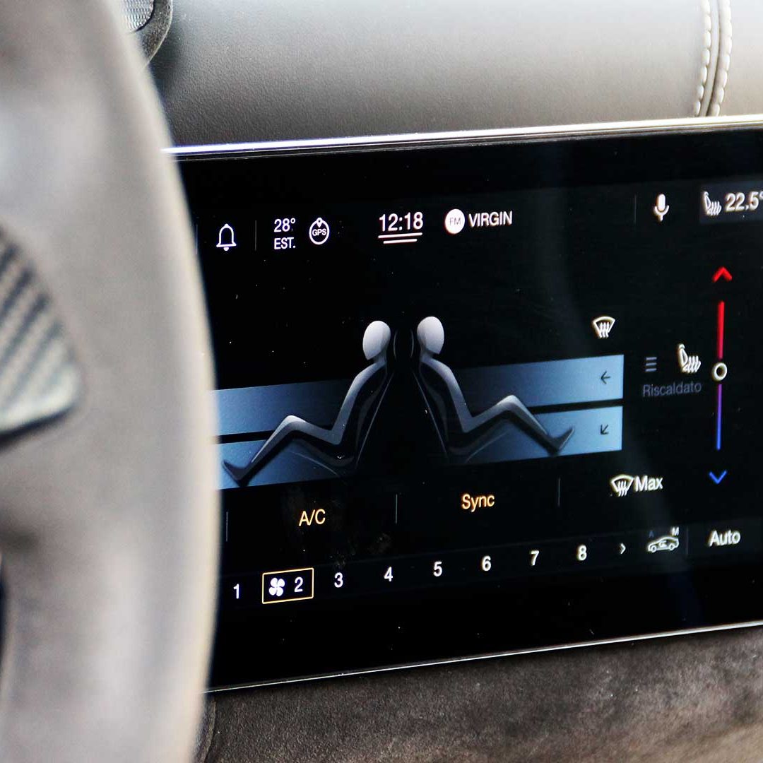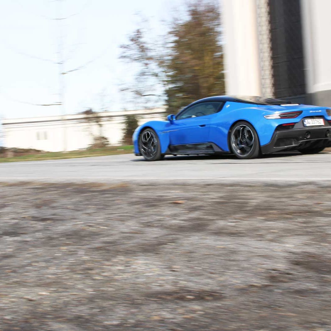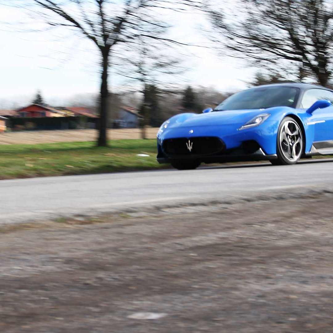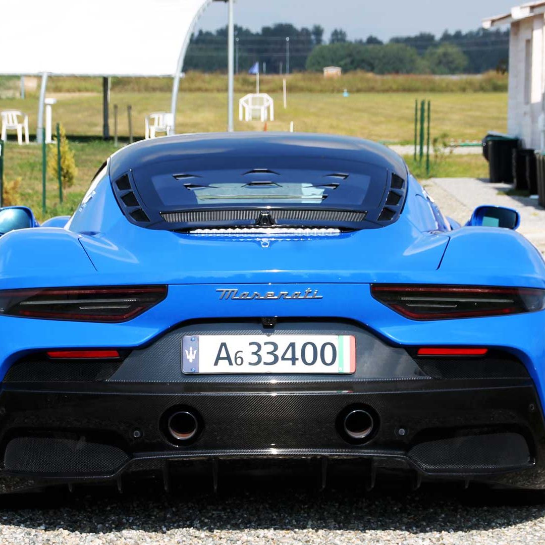 Le sedute (firmate Sabelt) sono comode, non affaticano e accolgono pilota e passeggero in una triangolazione praticamente perfetta, tanto per macinare km in scioltezza quanto per divertirsi a dare gas una volta al posto di guida. Gli oggetti di piccole dimensioni trovano tutto lo spazio necessario nei vani del tunnel centrale (c’è anche la ricarica wireless per lo smartphone) e dinnanzi al passeggero. Decisamente più risicato (al pari di un serbatoio che non brilla per capienza) – come a demarcare la vera vocazione di questa vettura – quello riservato agli oggetti di grandi dimensioni come possono essere borse o trolley: di questi ultimi ci si può tranquillamente dimenticare dell’esistenza. Nel piccolo vano alle spalle del motore c’è posto per un paio di zaini o due borsone e poco più. Alle spalle dei sedili possono essere riposti due zaini, le giacche e poco altro. Insomma: sì alle uscite per il weekend, ma a patto di portare con voi davvero lo stretto indispensabile. Ma d’altronde non è certo per la capacità di carico che questa vettura è concepita (anche se molte competitor lasciano comunque più spazio davanti anche per due trolley di piccole dimensioni). L’ambiente, come detto poc’anzi, è molto pulito: il tunnel centrale mette alla vista solo due pulsanti e il selettore dei 5 driving mode, che richiama nelle forme l’orologio analogico che è un marchio di fabbrica degli interni Maserati e qua scomparso dalla plancia per ovvie ragioni di sportività e di pulizia estetica. Molto belli i giochi di volumi e la conformazione delle varie superfici. Il volante integra tutti i comandi essenziali, nonché i pulsanti dello start e del launch control (quest’ultimo però, nel corso del nostro test, non ne ha voluto sapere di funzionare). Sospensioni a doppio braccio oscillante con ammortizzatori attivi e in alluminio forgiato e trasmissione Dual Clutch a bagno d’olio a 8 rapporti completano la dotazione di Maserati MC20, che mette alla vista anche bellissimi cerchi con disegno a tridente (che viene ripreso anche dal lunotto posteriore) da 20” (gommati di primo equipaggiamento con penumatici Bridgestone) e alle cui spalle si staglia un mastodontico impianto frenante carbo-ceramico Brembo (con pinza radiale monoblocco a 6 pistoni, con disco freno CCM in carbonio ceramico da 390x36mm davanti e pinza freno Brembo monoblocco a 4 pistoni con disco freno CCM in carbonio ceramico da 360x28mm dietro) che regala il meglio delle sue performance una volta portato in temperatura. Opzionale il sistema di sollevamento anteriore della vettura.