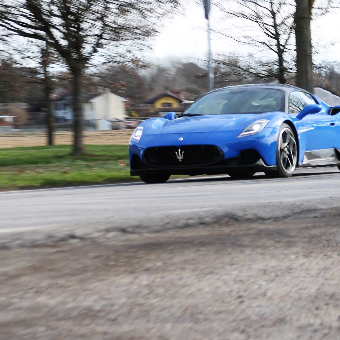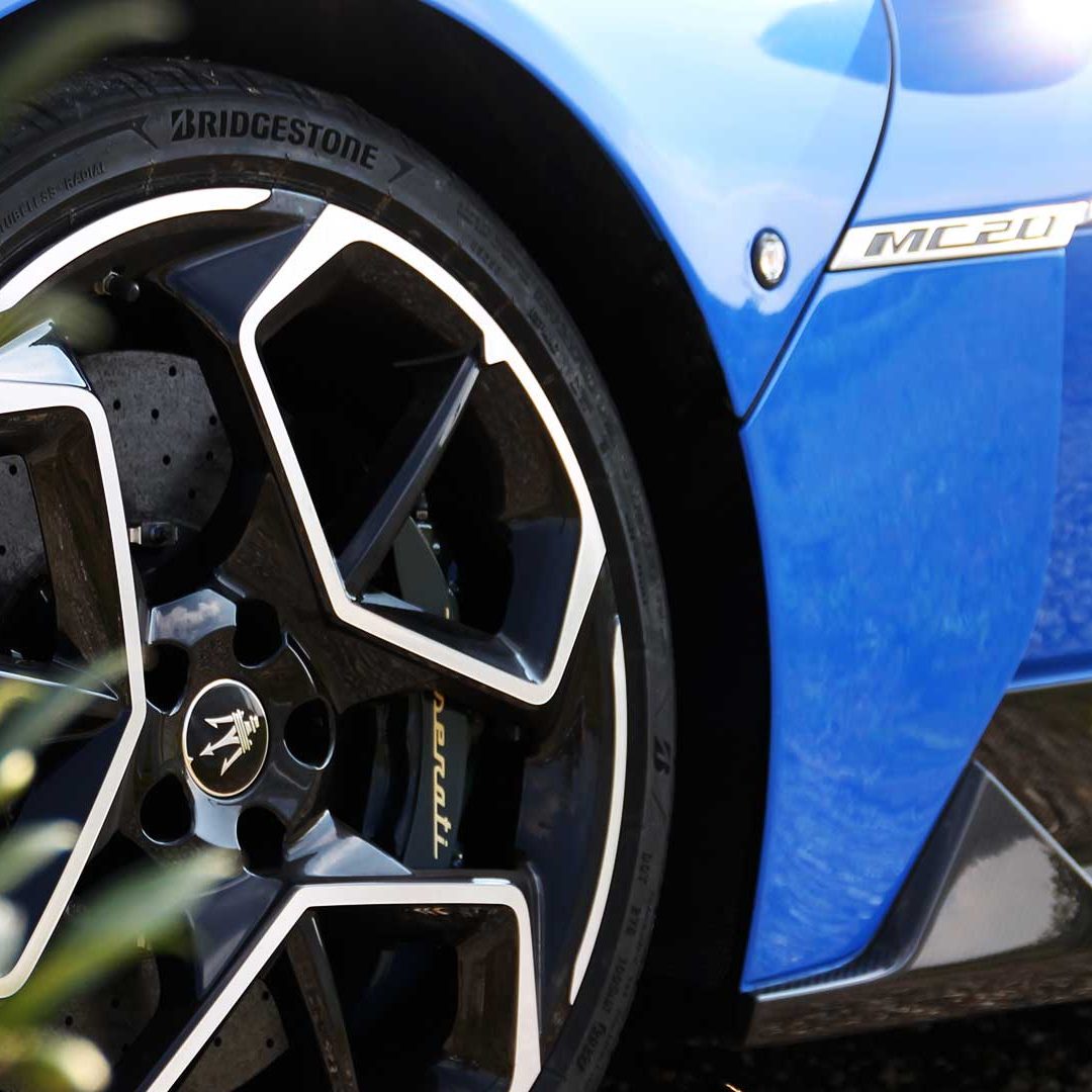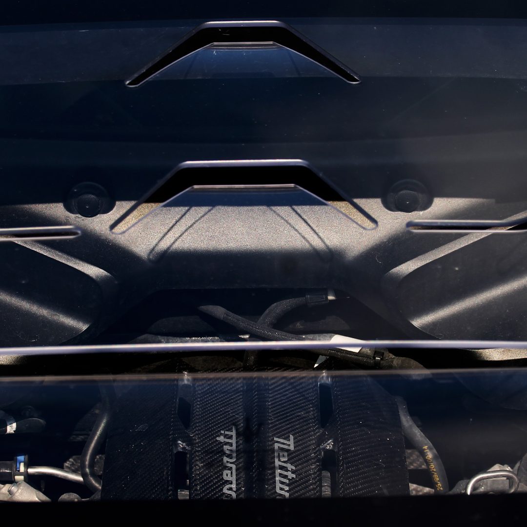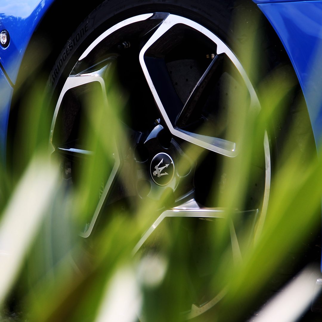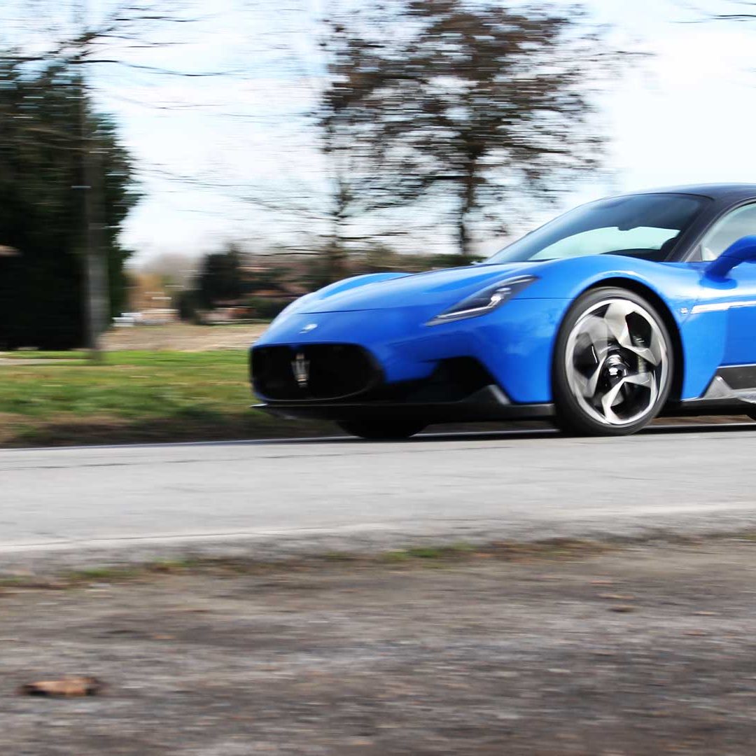 Le sedute (firmate Sabelt) sono comode, non affaticano e accolgono pilota e passeggero in una triangolazione praticamente perfetta, tanto per macinare km in scioltezza quanto per divertirsi a dare gas una volta al posto di guida. Gli oggetti di piccole dimensioni trovano tutto lo spazio necessario nei vani del tunnel centrale (c’è anche la ricarica wireless per lo smartphone) e dinnanzi al passeggero. Decisamente più risicato (al pari di un serbatoio che non brilla per capienza) – come a demarcare la vera vocazione di questa vettura – quello riservato agli oggetti di grandi dimensioni come possono essere borse o trolley: di questi ultimi ci si può tranquillamente dimenticare dell’esistenza. Nel piccolo vano alle spalle del motore c’è posto per un paio di zaini o due borsone e poco più. Alle spalle dei sedili possono essere riposti due zaini, le giacche e poco altro. Insomma: sì alle uscite per il weekend, ma a patto di portare con voi davvero lo stretto indispensabile. Ma d’altronde non è certo per la capacità di carico che questa vettura è concepita (anche se molte competitor lasciano comunque più spazio davanti anche per due trolley di piccole dimensioni). L’ambiente, come detto poc’anzi, è molto pulito: il tunnel centrale mette alla vista solo due pulsanti e il selettore dei 5 driving mode, che richiama nelle forme l’orologio analogico che è un marchio di fabbrica degli interni Maserati e qua scomparso dalla plancia per ovvie ragioni di sportività e di pulizia estetica. Molto belli i giochi di volumi e la conformazione delle varie superfici. Il volante integra tutti i comandi essenziali, nonché i pulsanti dello start e del launch control (quest’ultimo però, nel corso del nostro test, non ne ha voluto sapere di funzionare). Sospensioni a doppio braccio oscillante con ammortizzatori attivi e in alluminio forgiato e trasmissione Dual Clutch a bagno d’olio a 8 rapporti completano la dotazione di Maserati MC20, che mette alla vista anche bellissimi cerchi con disegno a tridente (che viene ripreso anche dal lunotto posteriore) da 20” (gommati di primo equipaggiamento con penumatici Bridgestone) e alle cui spalle si staglia un mastodontico impianto frenante carbo-ceramico Brembo (con pinza radiale monoblocco a 6 pistoni, con disco freno CCM in carbonio ceramico da 390x36mm davanti e pinza freno Brembo monoblocco a 4 pistoni con disco freno CCM in carbonio ceramico da 360x28mm dietro) che regala il meglio delle sue performance una volta portato in temperatura. Opzionale il sistema di sollevamento anteriore della vettura.