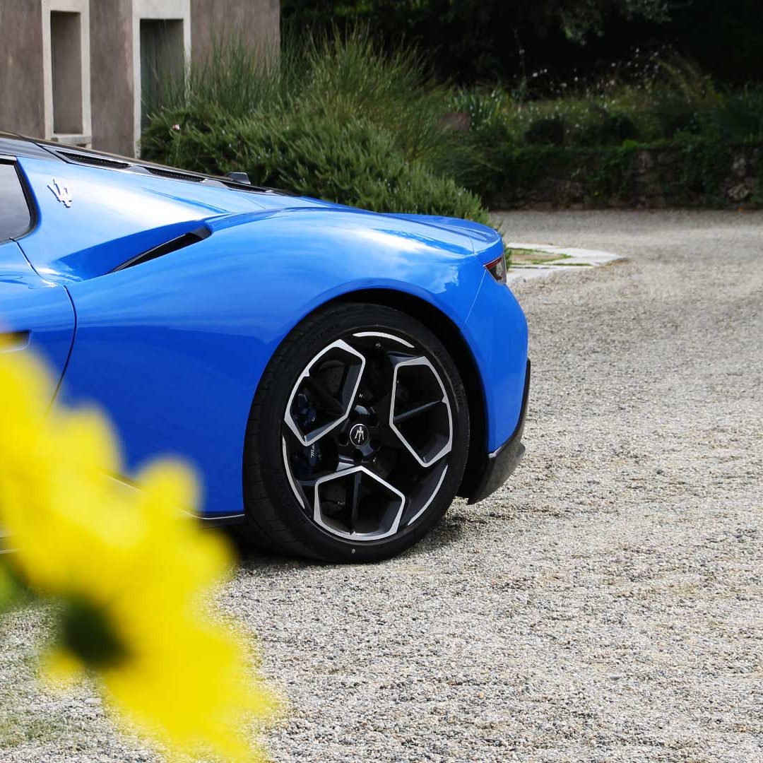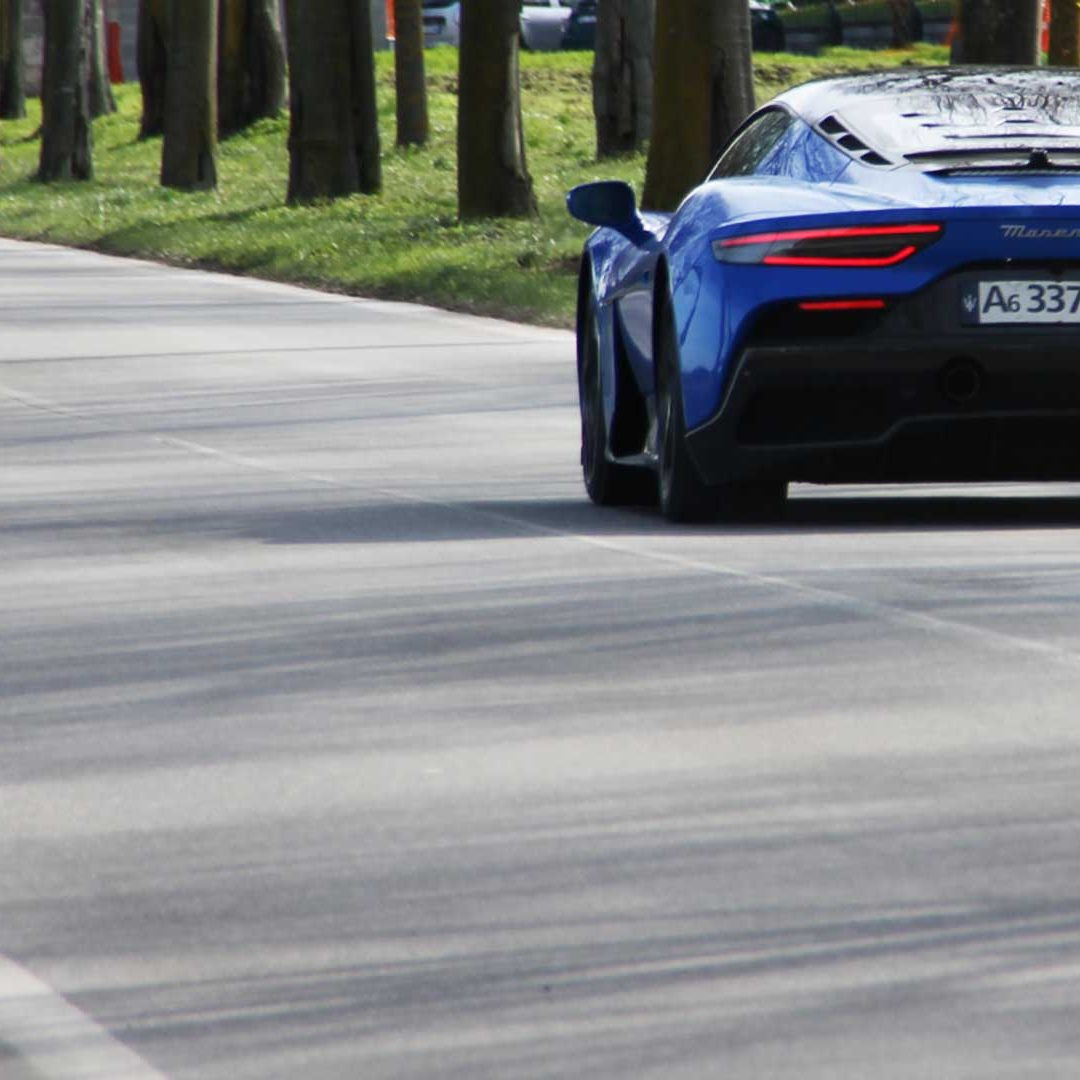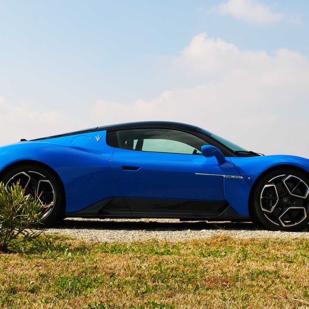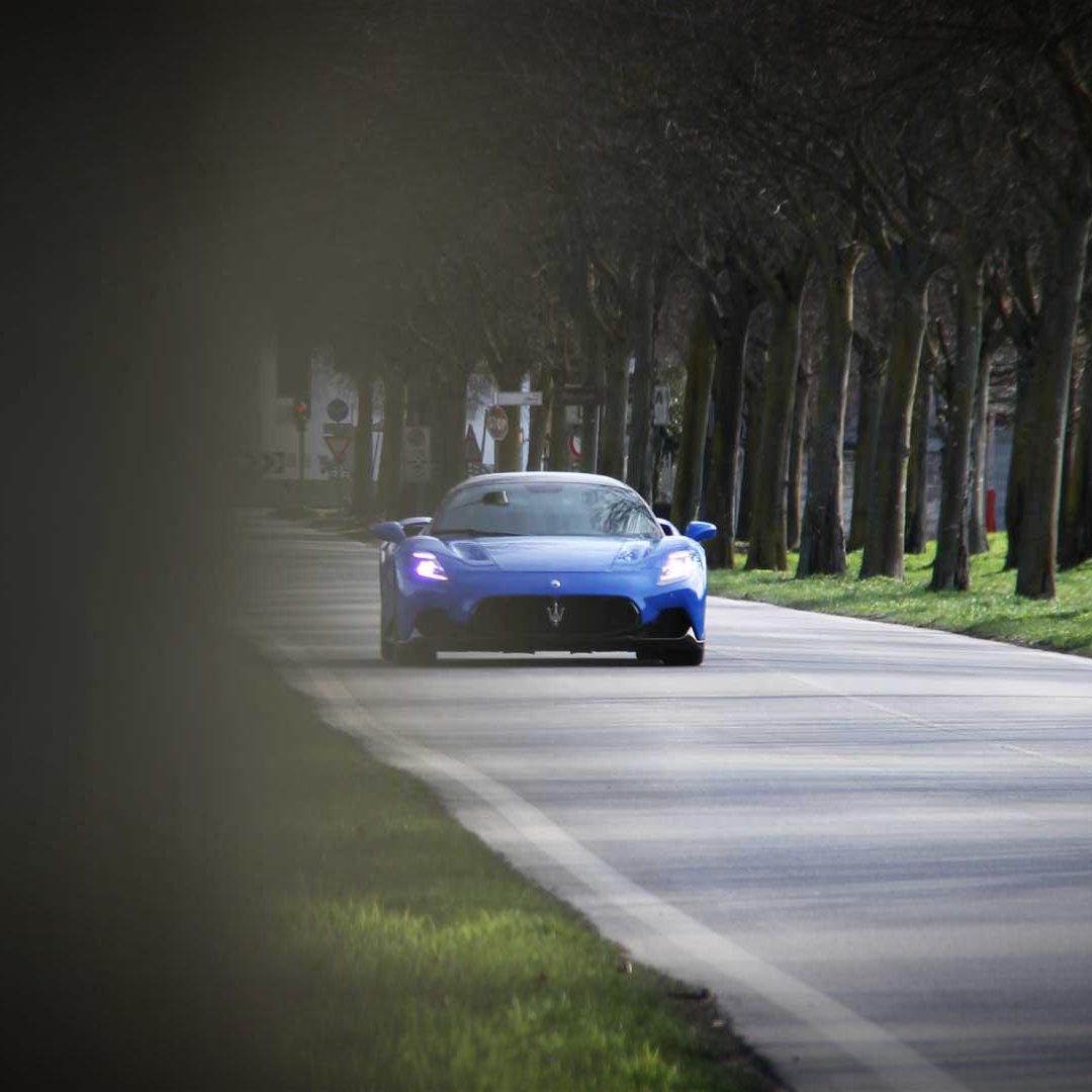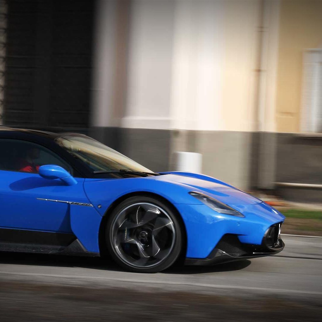 Le sedute (firmate Sabelt) sono comode, non affaticano e accolgono pilota e passeggero in una triangolazione praticamente perfetta, tanto per macinare km in scioltezza quanto per divertirsi a dare gas una volta al posto di guida. Gli oggetti di piccole dimensioni trovano tutto lo spazio necessario nei vani del tunnel centrale (c’è anche la ricarica wireless per lo smartphone) e dinnanzi al passeggero. Decisamente più risicato (al pari di un serbatoio che non brilla per capienza) – come a demarcare la vera vocazione di questa vettura – quello riservato agli oggetti di grandi dimensioni come possono essere borse o trolley: di questi ultimi ci si può tranquillamente dimenticare dell’esistenza. Nel piccolo vano alle spalle del motore c’è posto per un paio di zaini o due borsone e poco più. Alle spalle dei sedili possono essere riposti due zaini, le giacche e poco altro. Insomma: sì alle uscite per il weekend, ma a patto di portare con voi davvero lo stretto indispensabile. Ma d’altronde non è certo per la capacità di carico che questa vettura è concepita (anche se molte competitor lasciano comunque più spazio davanti anche per due trolley di piccole dimensioni). L’ambiente, come detto poc’anzi, è molto pulito: il tunnel centrale mette alla vista solo due pulsanti e il selettore dei 5 driving mode, che richiama nelle forme l’orologio analogico che è un marchio di fabbrica degli interni Maserati e qua scomparso dalla plancia per ovvie ragioni di sportività e di pulizia estetica. Molto belli i giochi di volumi e la conformazione delle varie superfici. Il volante integra tutti i comandi essenziali, nonché i pulsanti dello start e del launch control (quest’ultimo però, nel corso del nostro test, non ne ha voluto sapere di funzionare). Sospensioni a doppio braccio oscillante con ammortizzatori attivi e in alluminio forgiato e trasmissione Dual Clutch a bagno d’olio a 8 rapporti completano la dotazione di Maserati MC20, che mette alla vista anche bellissimi cerchi con disegno a tridente (che viene ripreso anche dal lunotto posteriore) da 20” (gommati di primo equipaggiamento con penumatici Bridgestone) e alle cui spalle si staglia un mastodontico impianto frenante carbo-ceramico Brembo (con pinza radiale monoblocco a 6 pistoni, con disco freno CCM in carbonio ceramico da 390x36mm davanti e pinza freno Brembo monoblocco a 4 pistoni con disco freno CCM in carbonio ceramico da 360x28mm dietro) che regala il meglio delle sue performance una volta portato in temperatura. Opzionale il sistema di sollevamento anteriore della vettura.